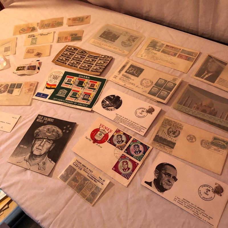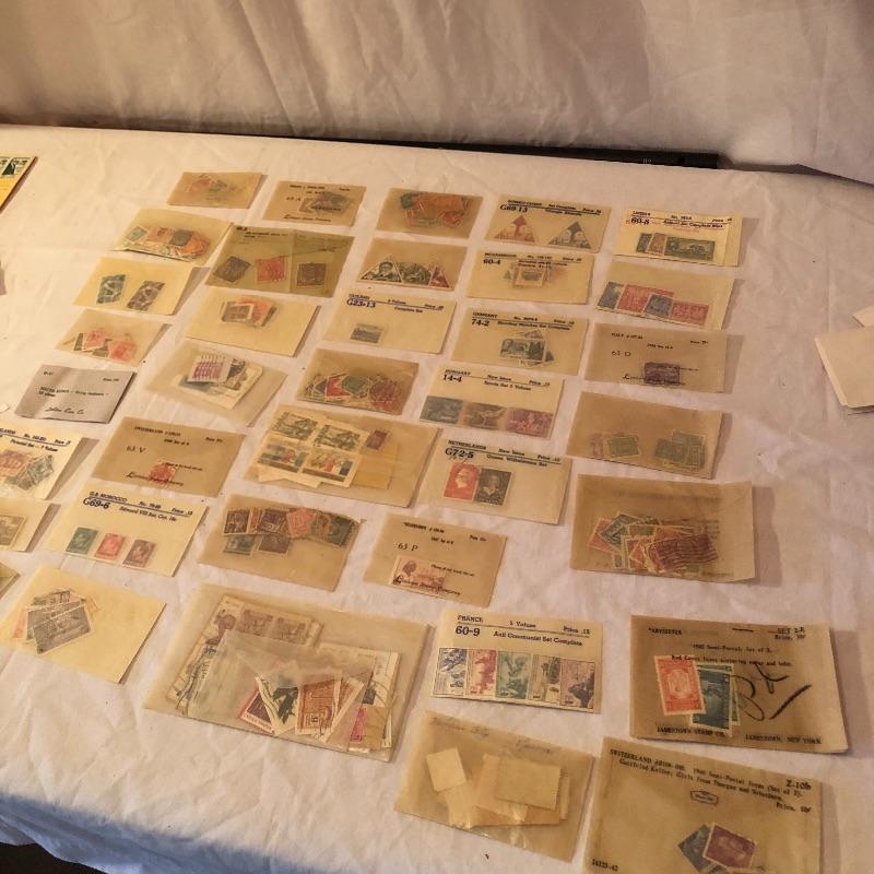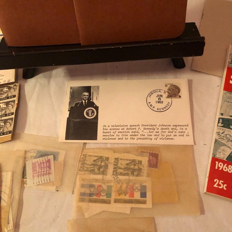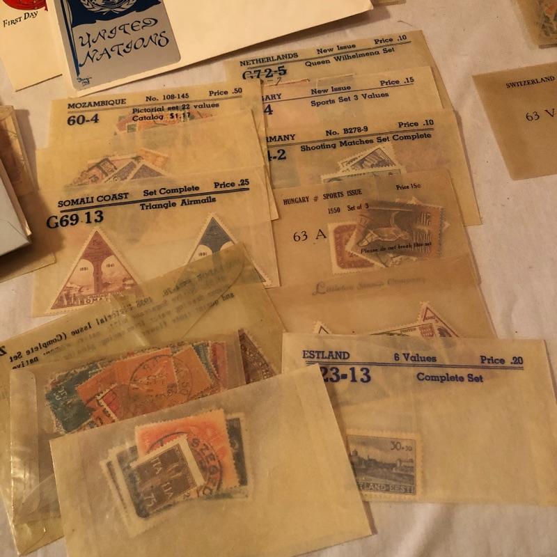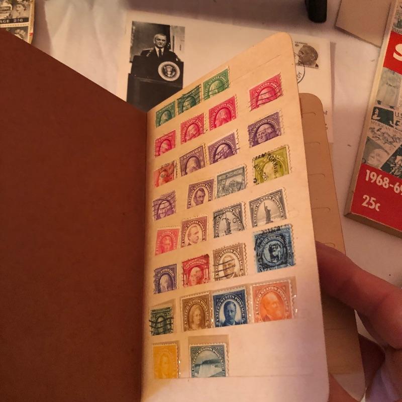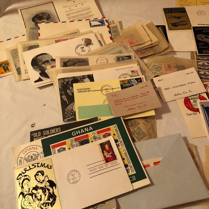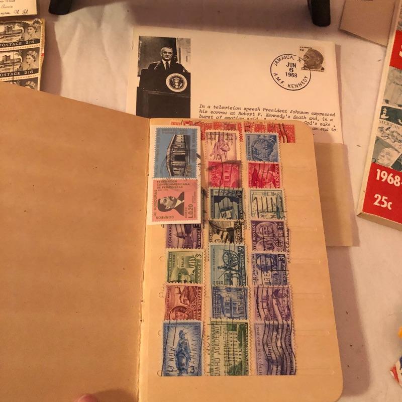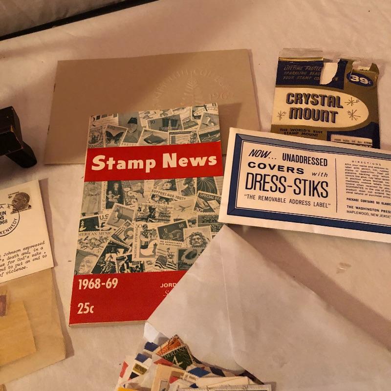This lot contains too many stamps to photograph! This lot will certainly be attractive to any stamp collector or historian! Both stamp stock books are filled. Includes first day issues and US and international used stamps. Also includes a book and stamp collecting supplies. Shipping Available.