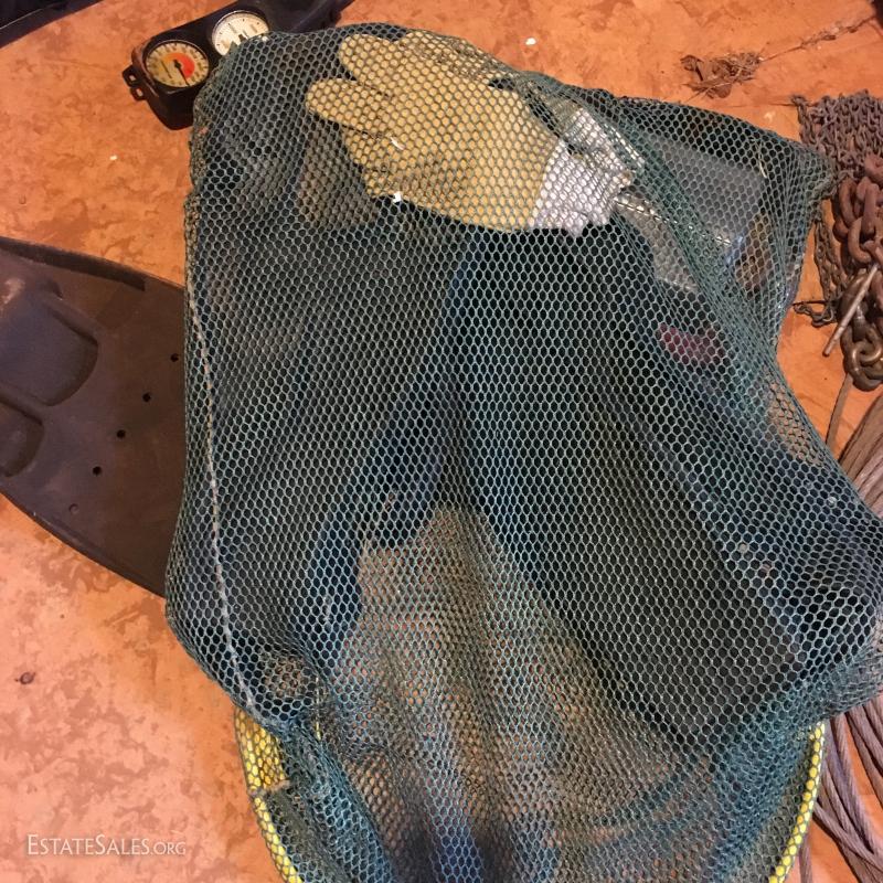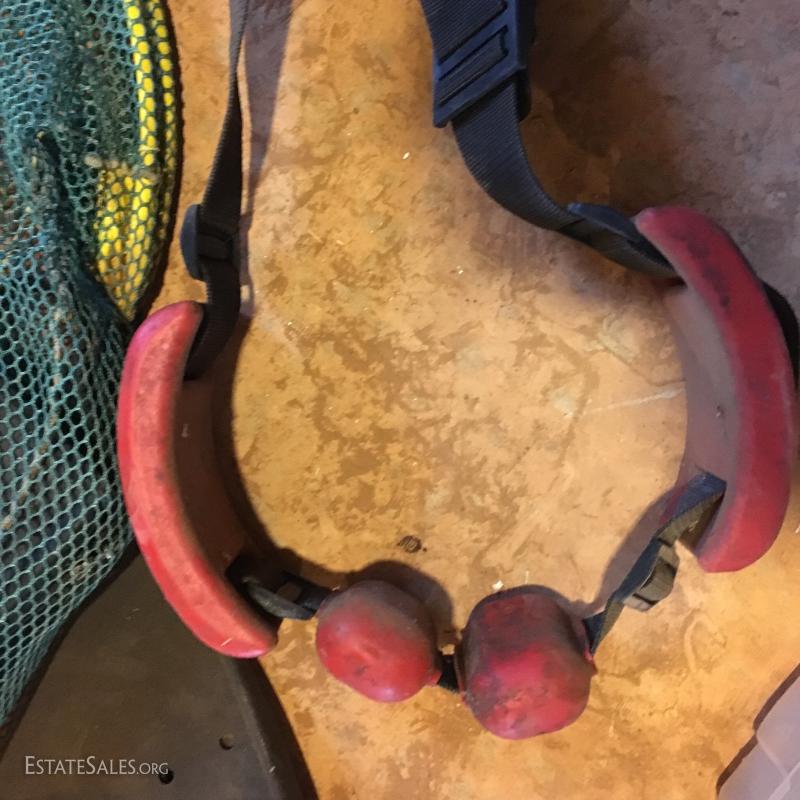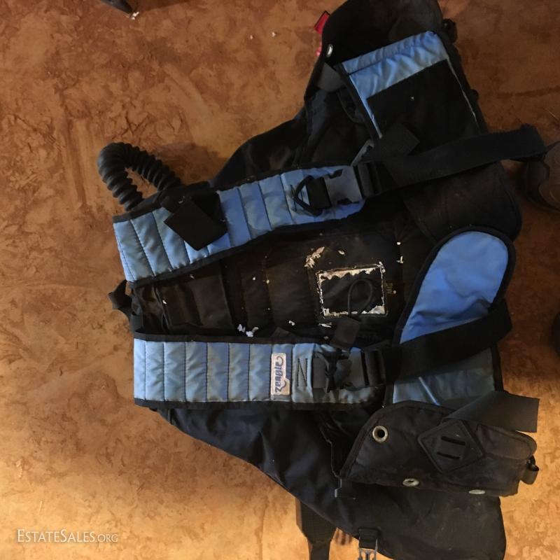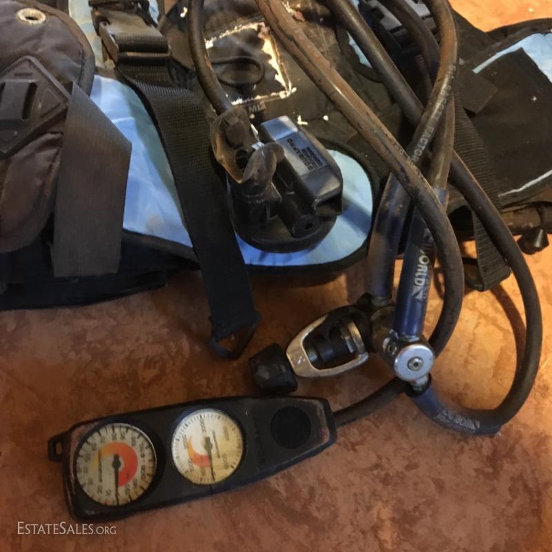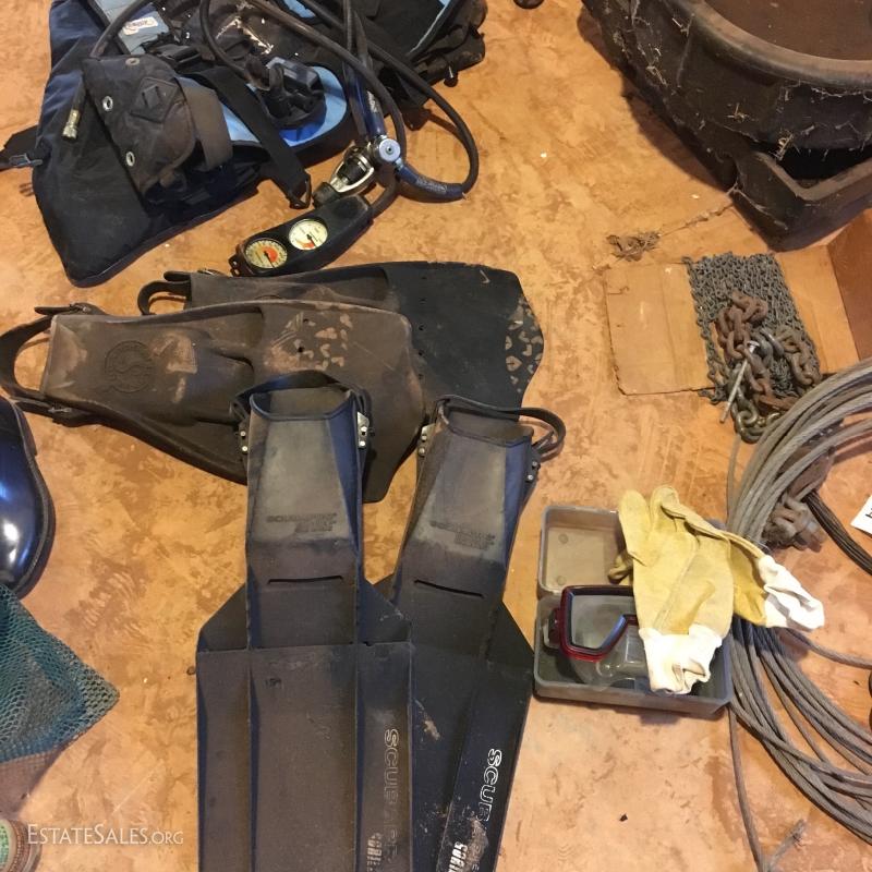 Step Pedometer, Bucket full of softballs, Scuba gear (Scuba Pro Sea Wing Fins XL, 6200 B Scuba Pro, Zeagle Jacket, Scuba Weight Belt, Penn Tennis balls, Racket balls, Wenoka Diving knife, Z-Grip Soles Size XL 11-13, and 2 Bikes Bridgestone and Trek.