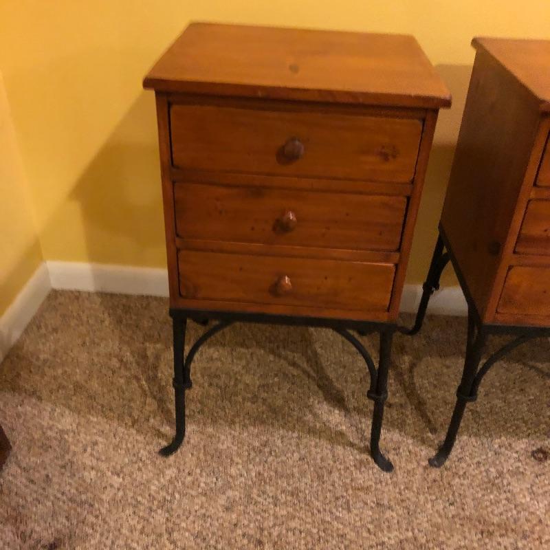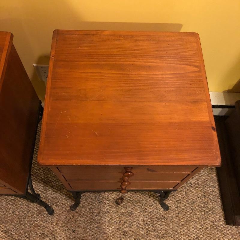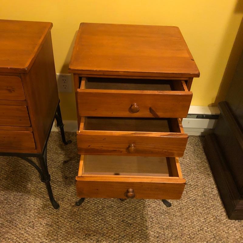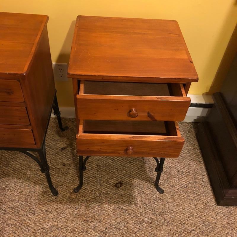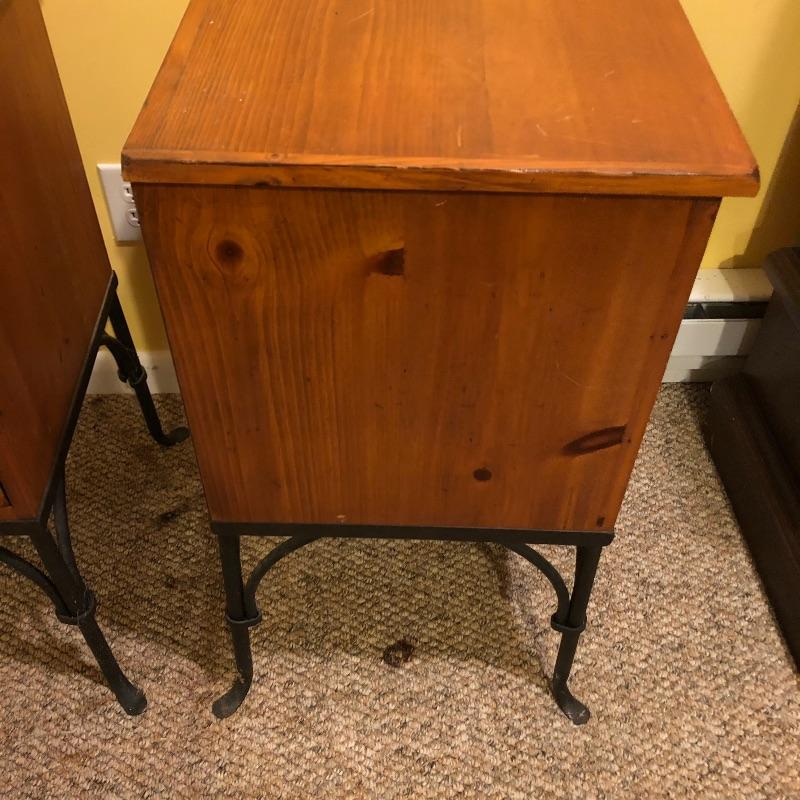 A nice pair of wood and metal matching end tables. These solid wood tables both feature black wrought iron legs and 3 drawers each. Both tables have minor scuff marks which are shown in the last images.