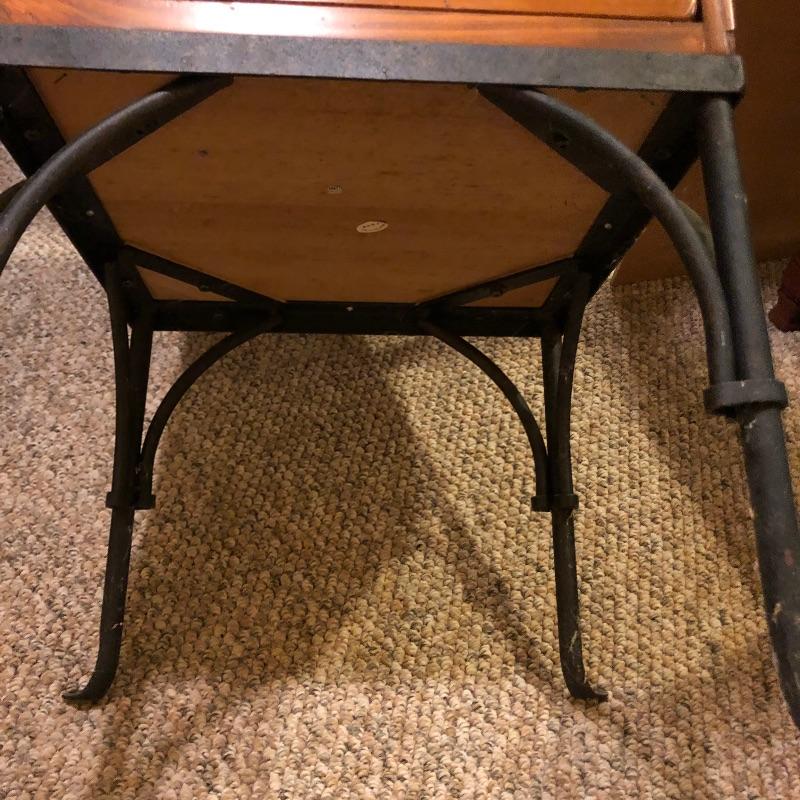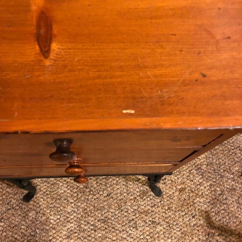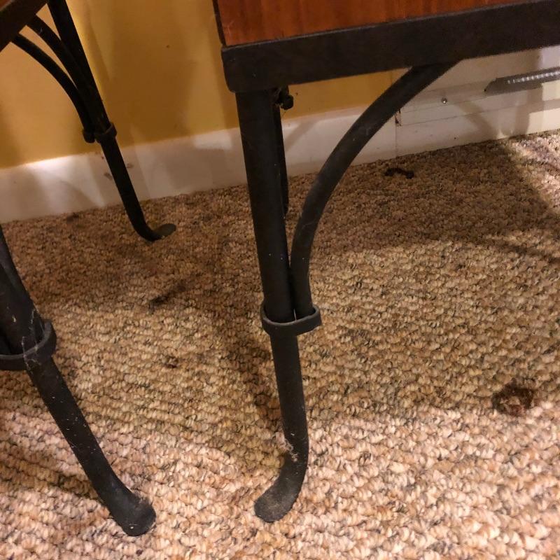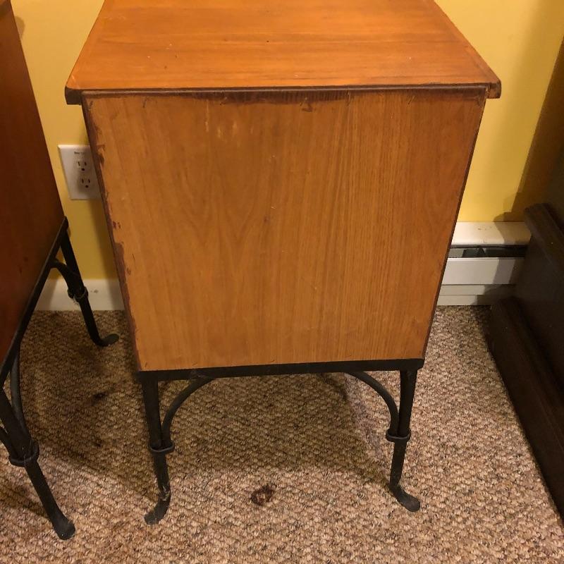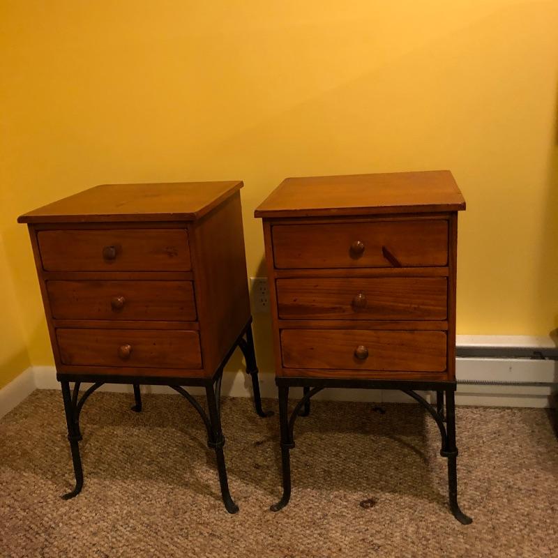 A nice pair of wood and metal matching end tables. These solid wood tables both feature black wrought iron legs and 3 drawers each. Both tables have minor scuff marks which are shown in the last images.