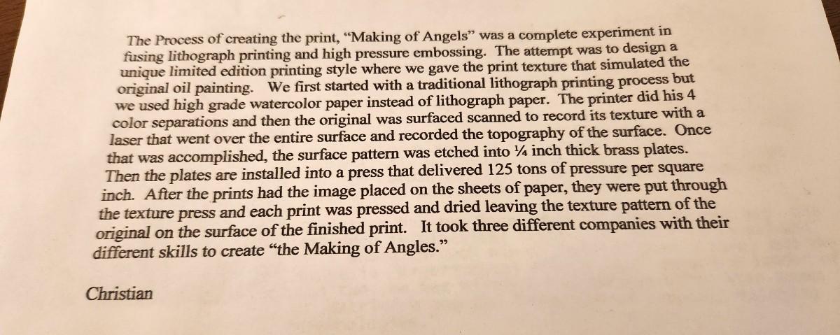 By listed artist Christian Seidler, known portraitist - "The Making of Angels" - fused lithograph with high pressure embossing - 27" x 39". This lithograph was made using an intricate, new technique that involved 3 different companies. Info on reverse.