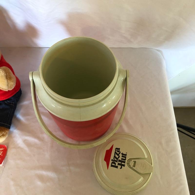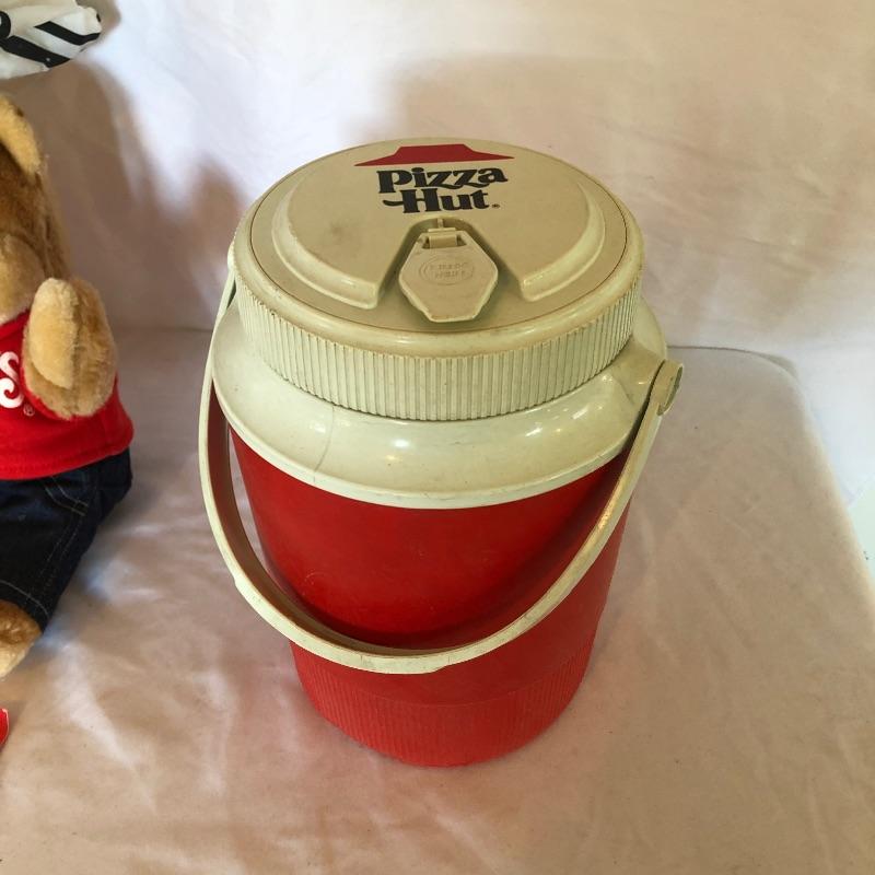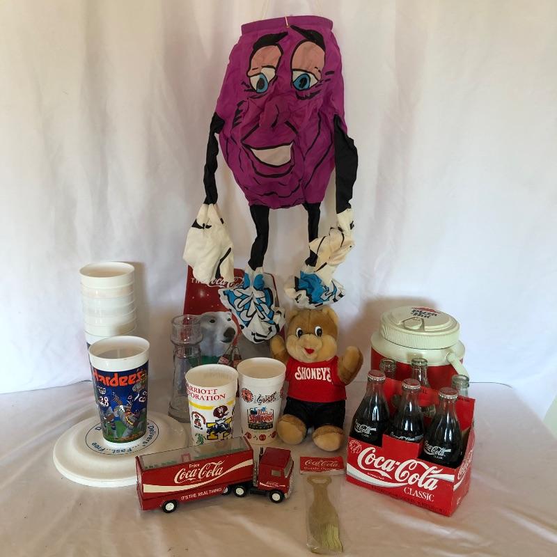 A great assortment of vintage food and beverage iconic collectibles. Included is a Pizza Hut cooler, California Raisins windsock, Coca Cola bottles (3 full, 3 empty),toy truck and catalogue and much more.