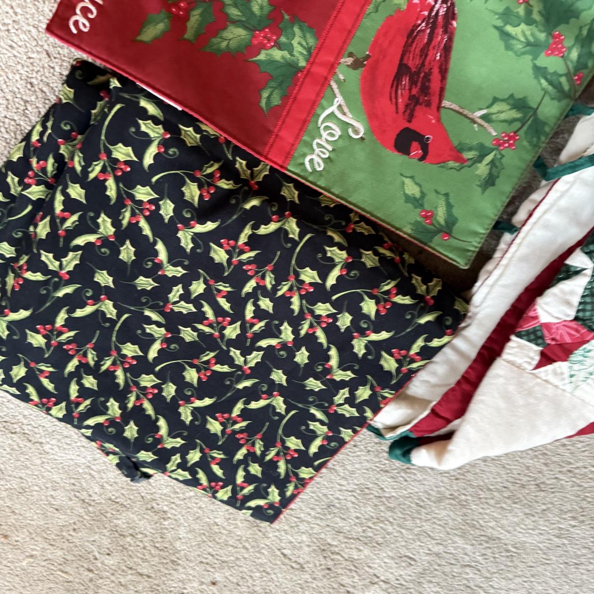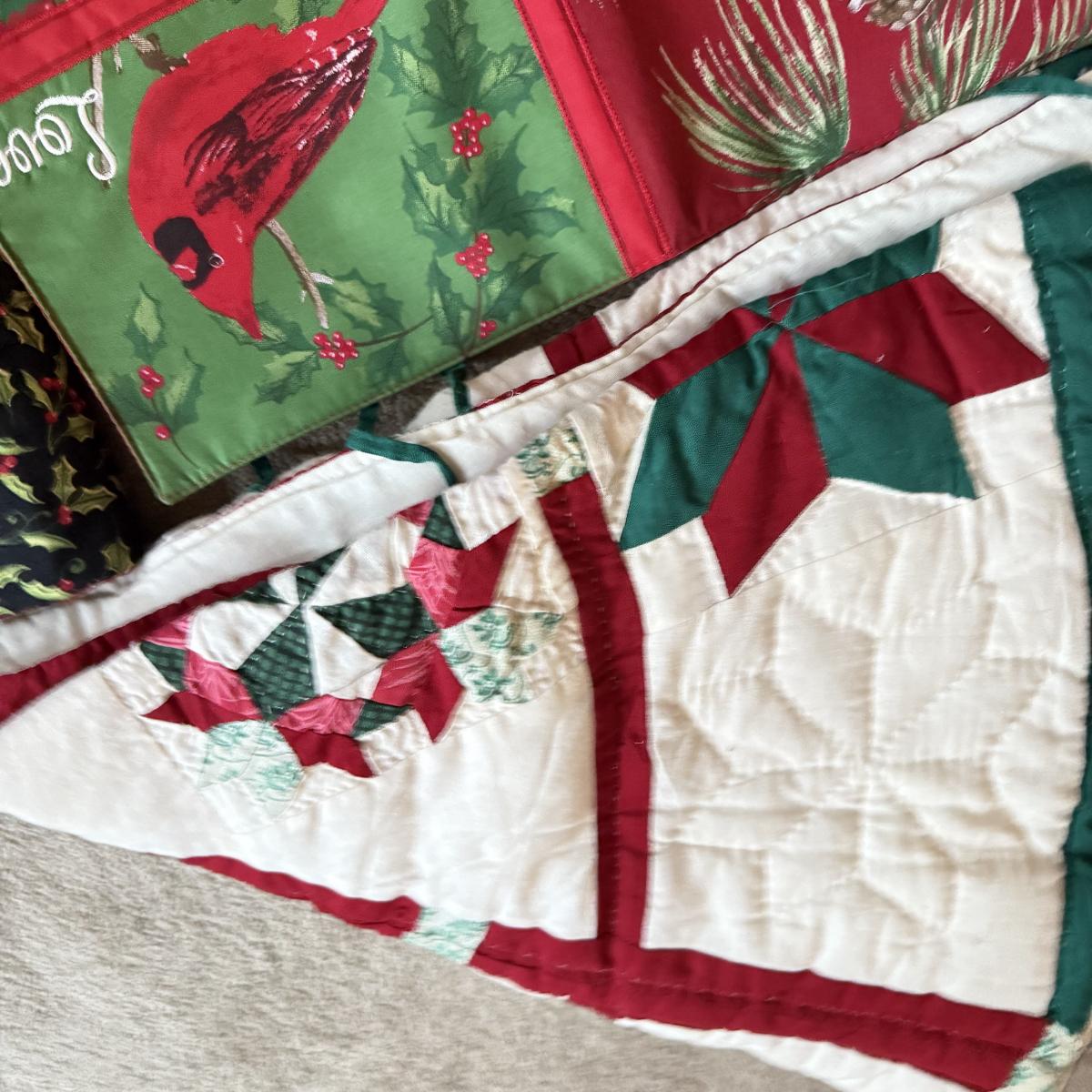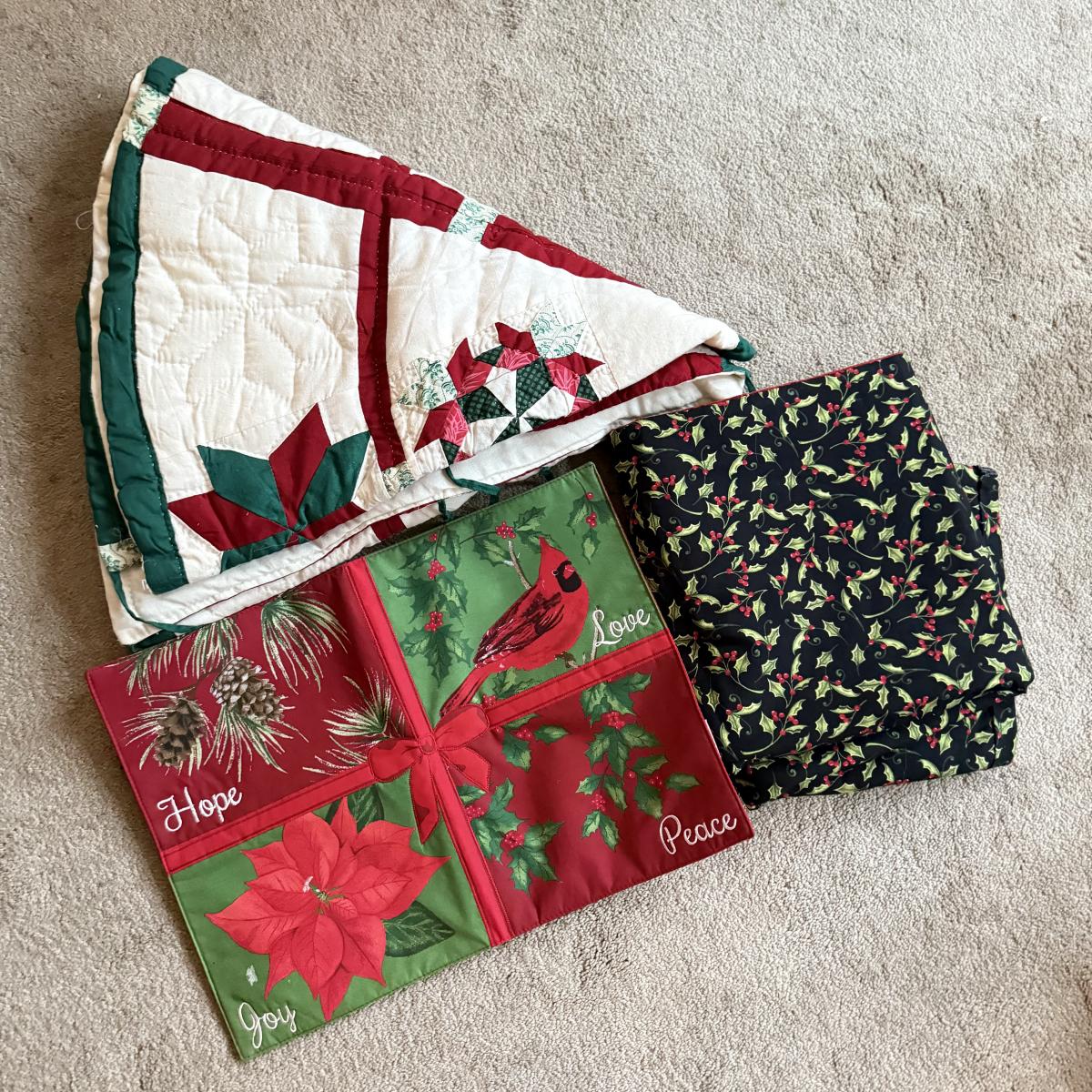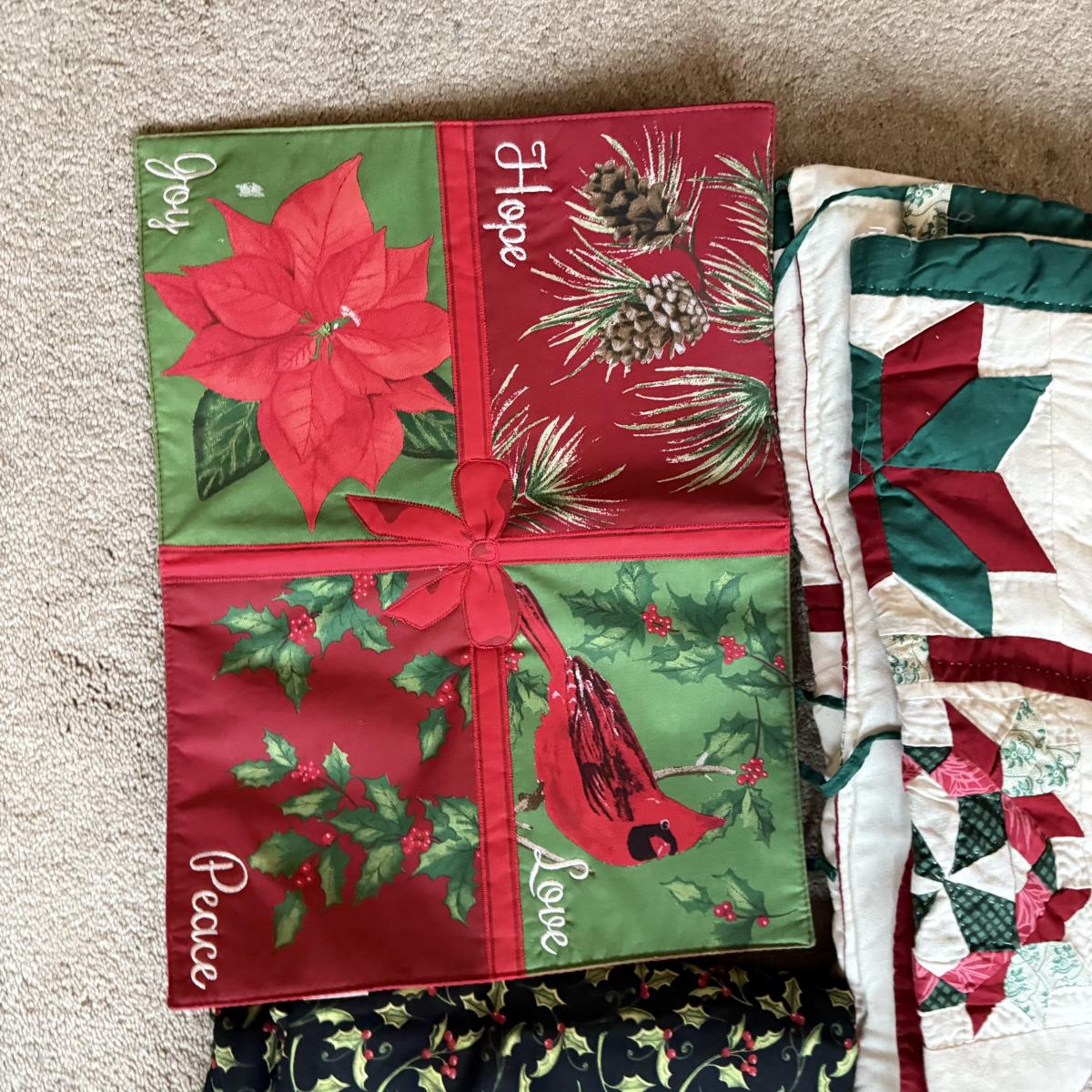 LOT 211L: Soft Vintage Santa Doorstops, Quilted Tree Skirt & More