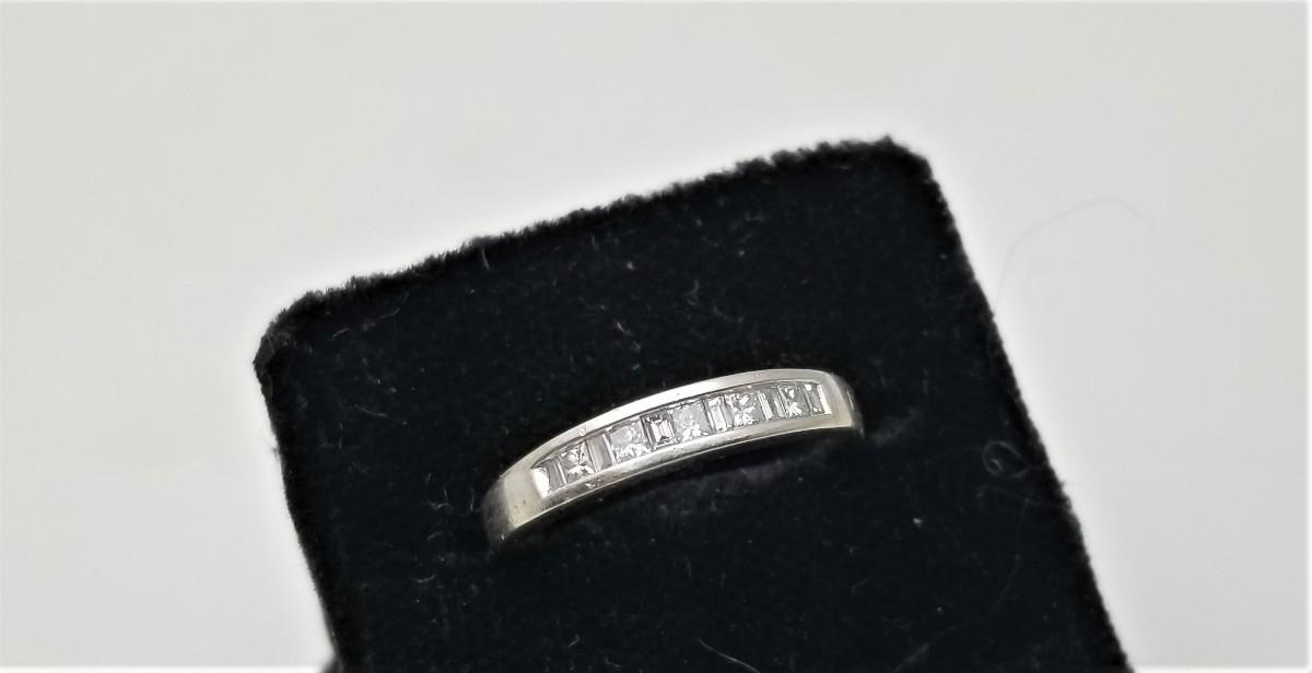14kt White Gold - marked and tested - ring, size 6 - with a row of twinkly little diamonds. Good used condition. Opening bid is 10% above the scrap price.