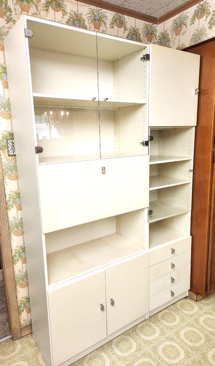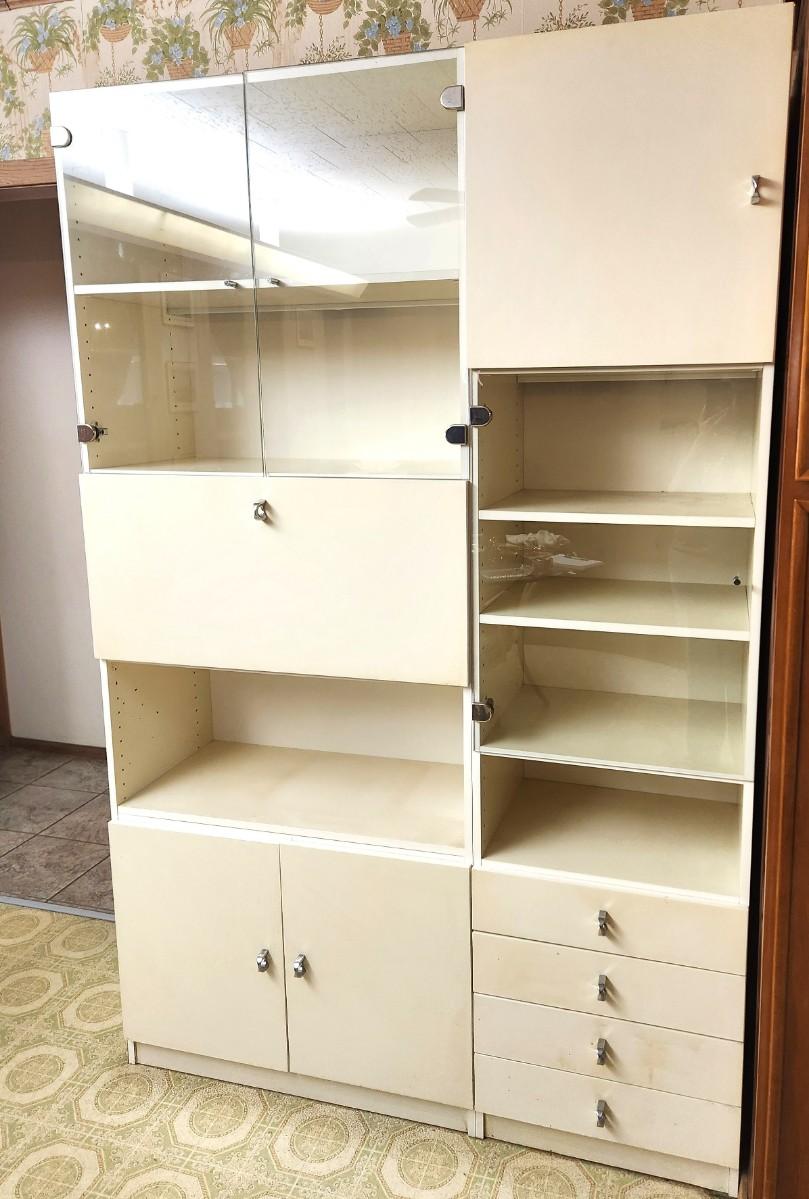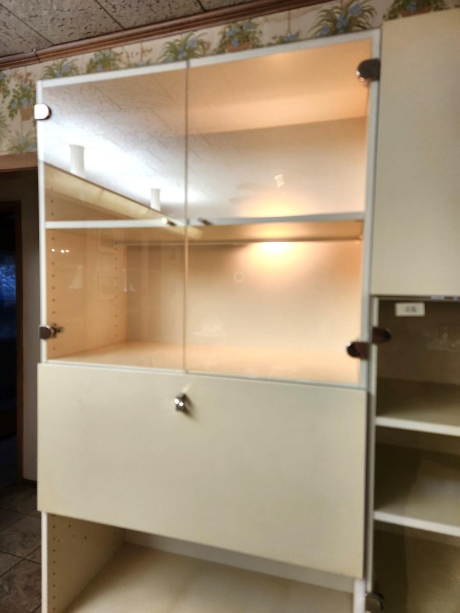 These two modern wall storage units are so versatile - both light up. Used in the kitchen in this home for more dishware storage - could be used in a pantry, a garage, a laundry room. Lot of possibilities. CLEAN. When you put them together they are 51" across - the smaller unit by itself is 31" across. Both are 16" deep and 8 feet tall. Glass fronted cabinets, drop down desk, drawers. 1000 uses. Good condition.