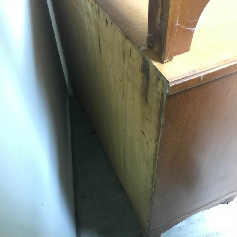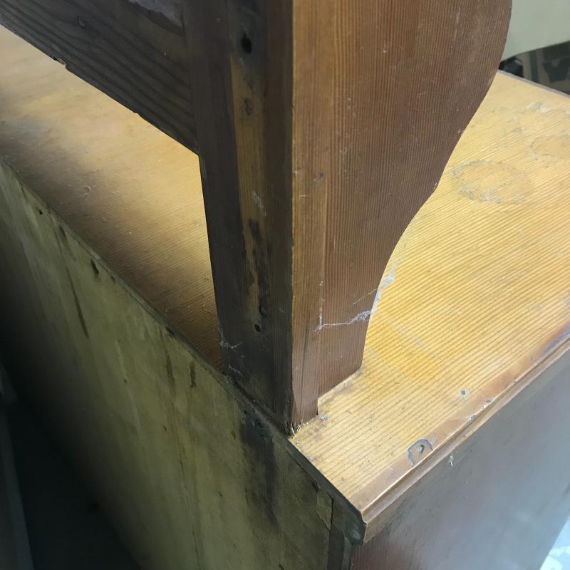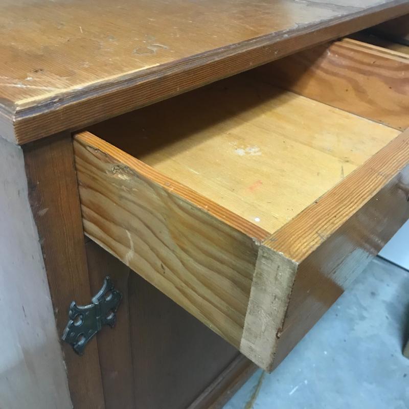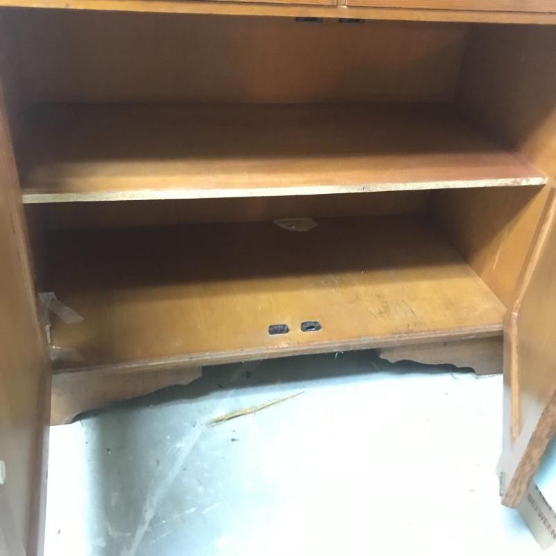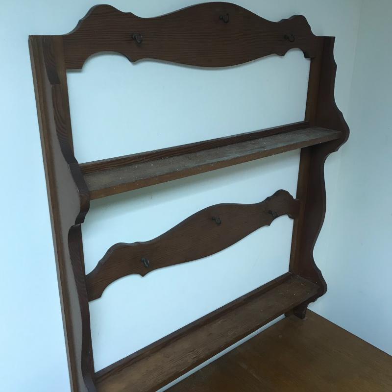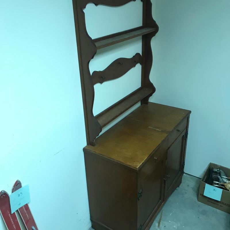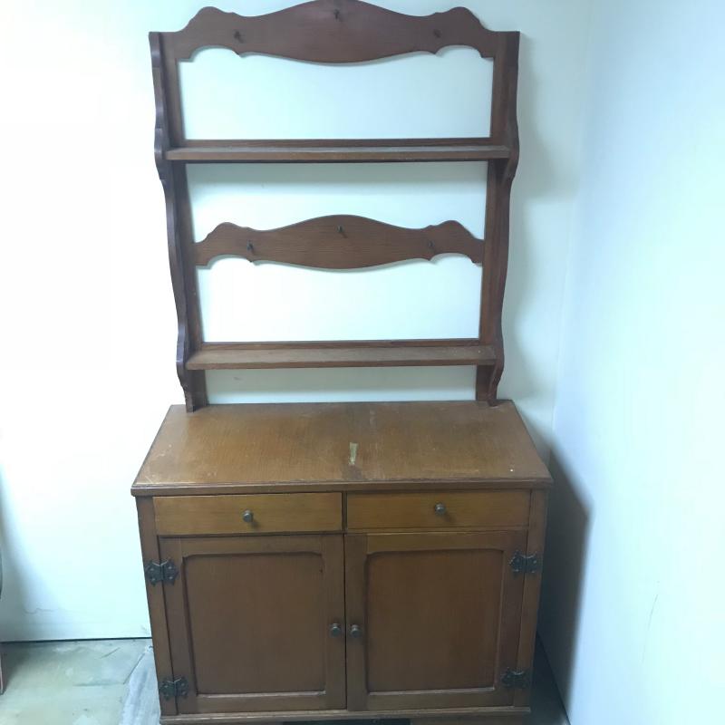 All wood cabinet with two drawers and open top two shelves and hooks. Piece is solid but needs some refinishing on top. Two pieces and measures 39” x18” x76” with base standing 33” and open shelf extends out 5”. Local pick up only.