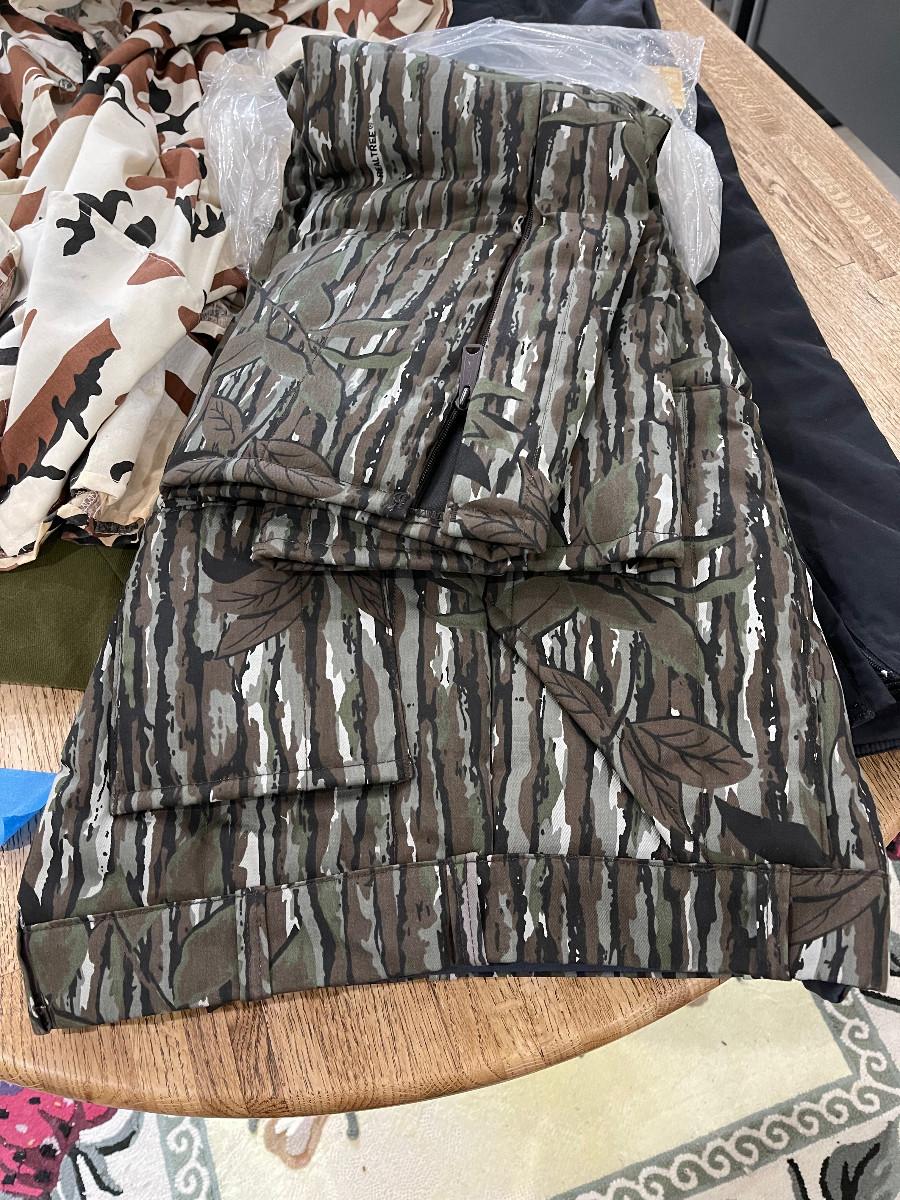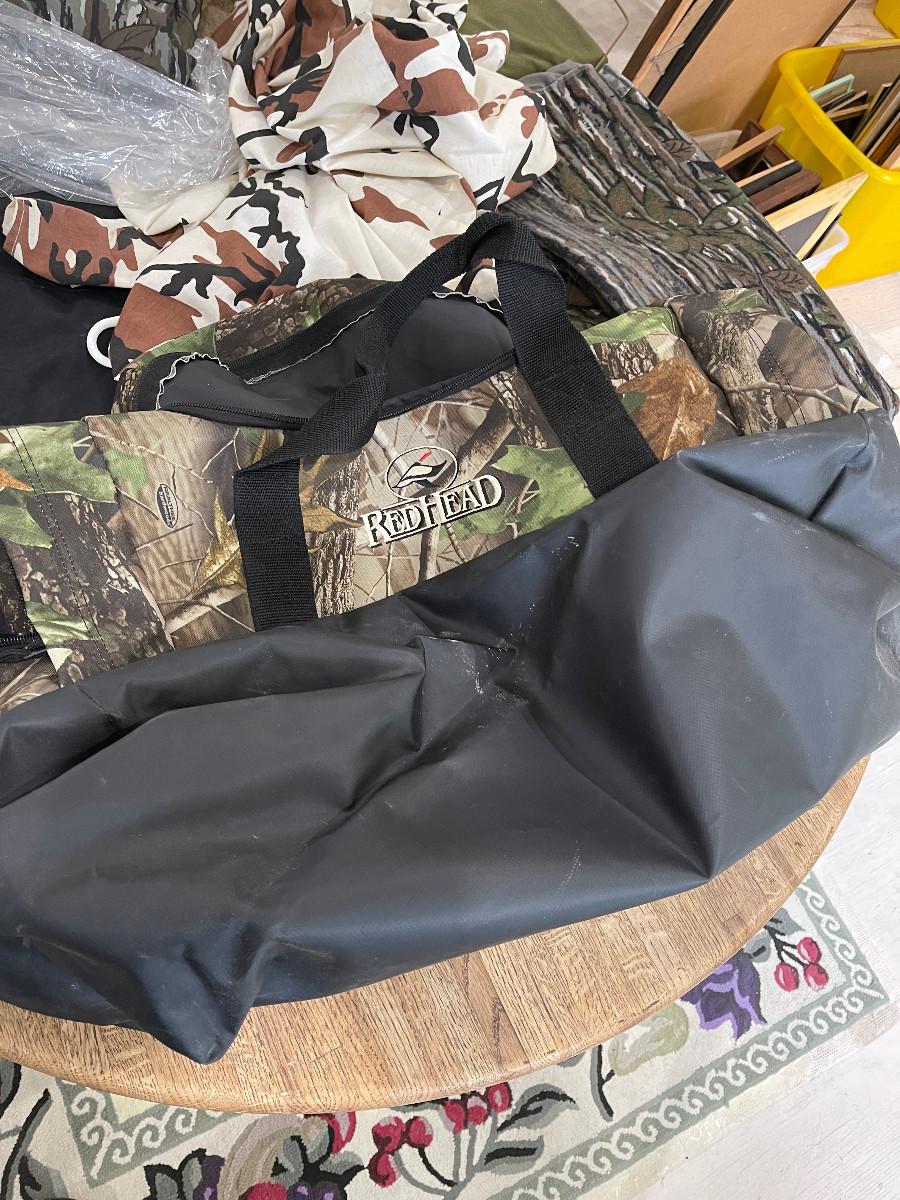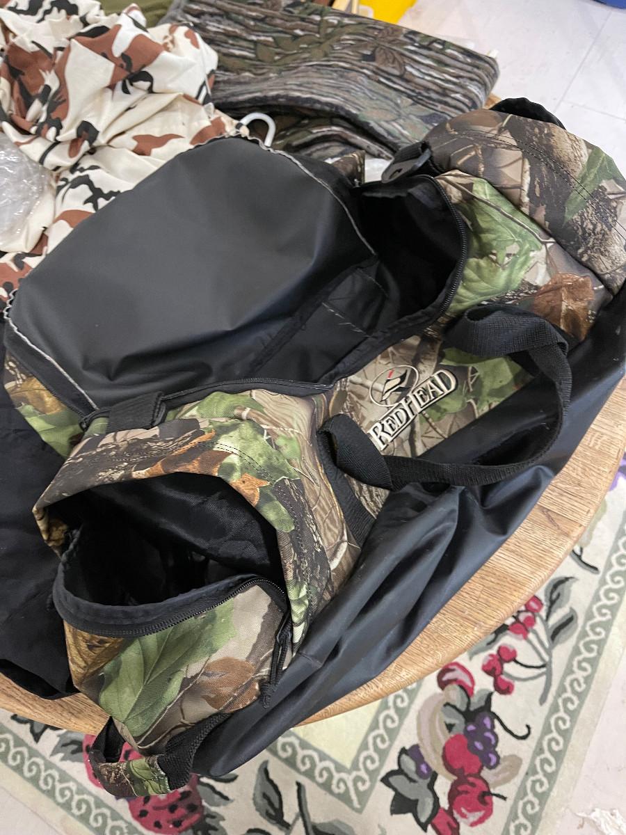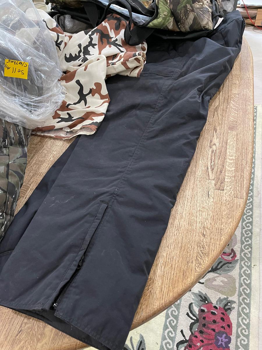 Hunting Lot Includes New Real Tree Blue Bill Insulated Hunting Pant (size Large), Read Head Hunting Bag, Fera Black Hunting Pants (size 38), Green Hunting Pants (size Large), Insulated Wool Camo Pants by Cabela's Gore-tex (size 38)