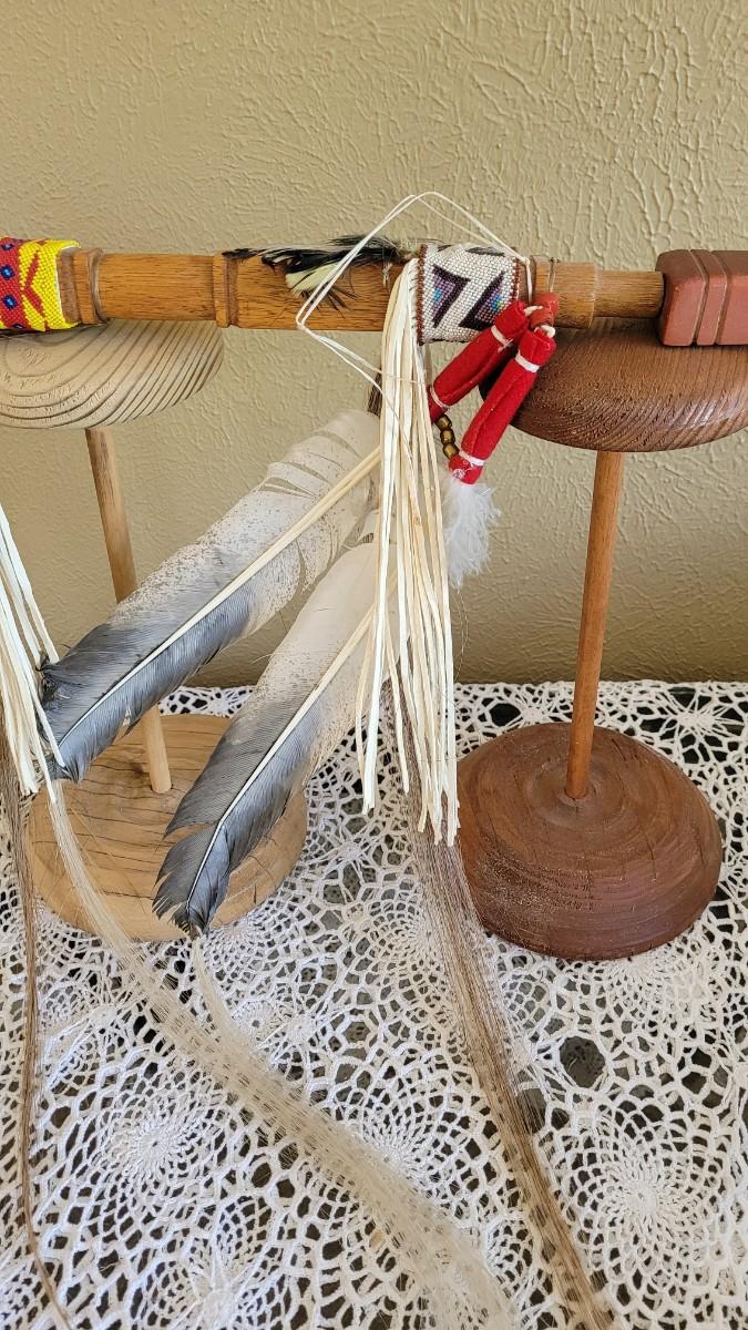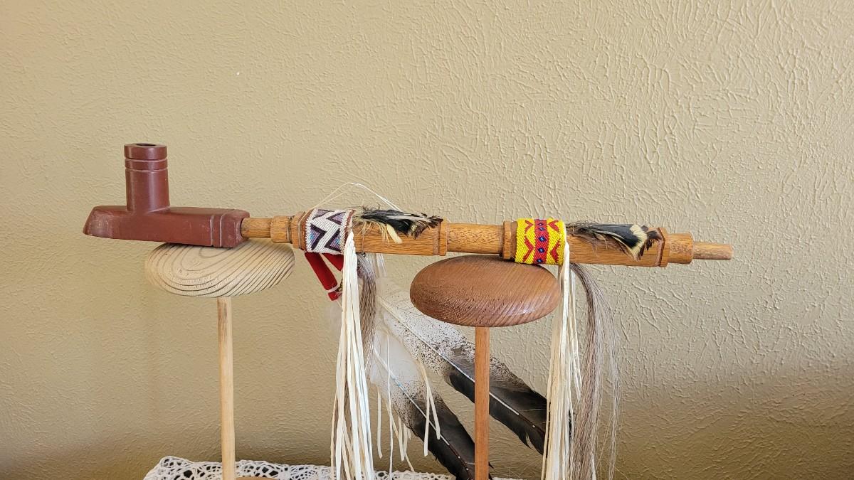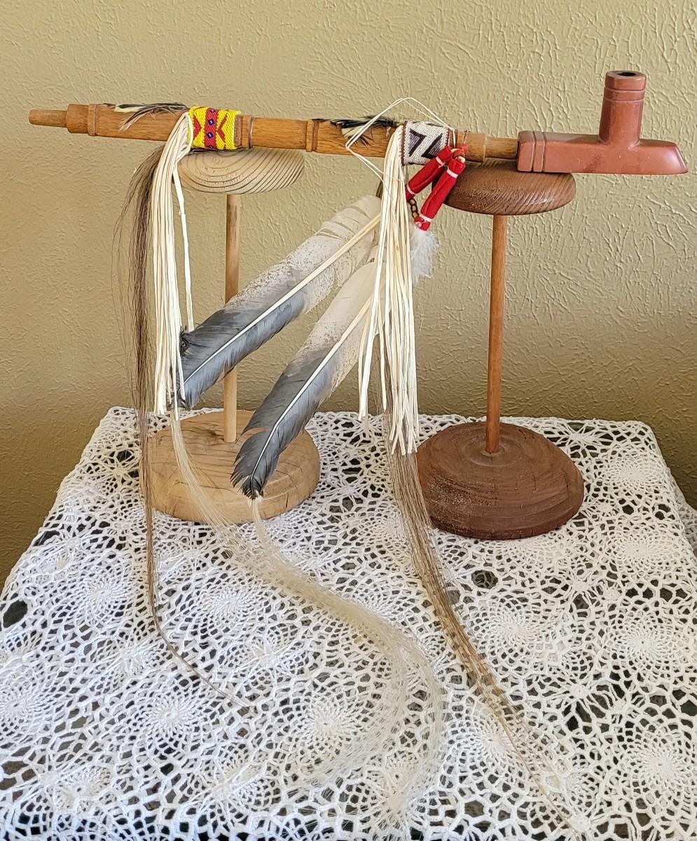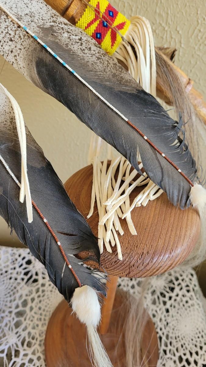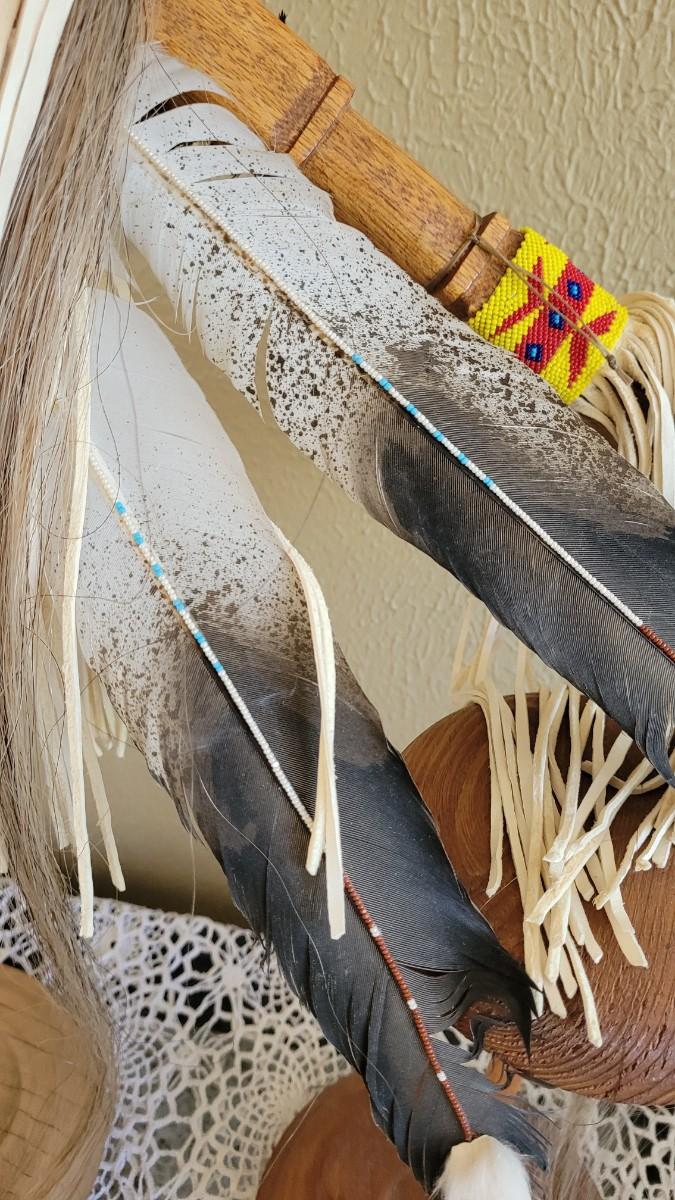 Beautiful Native American Pipe with multiple bead bands, feathers with beadeding down the spine of the feathers and Horsehair Tassels. Truly a work of Art.