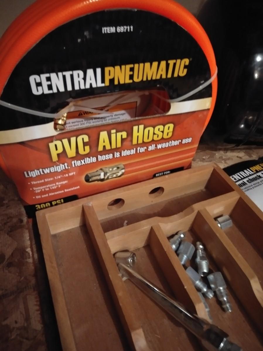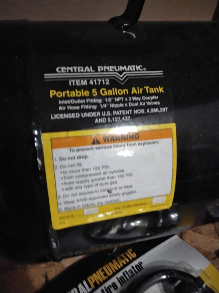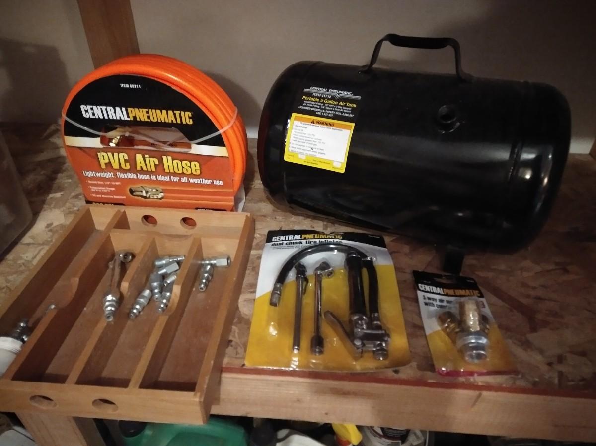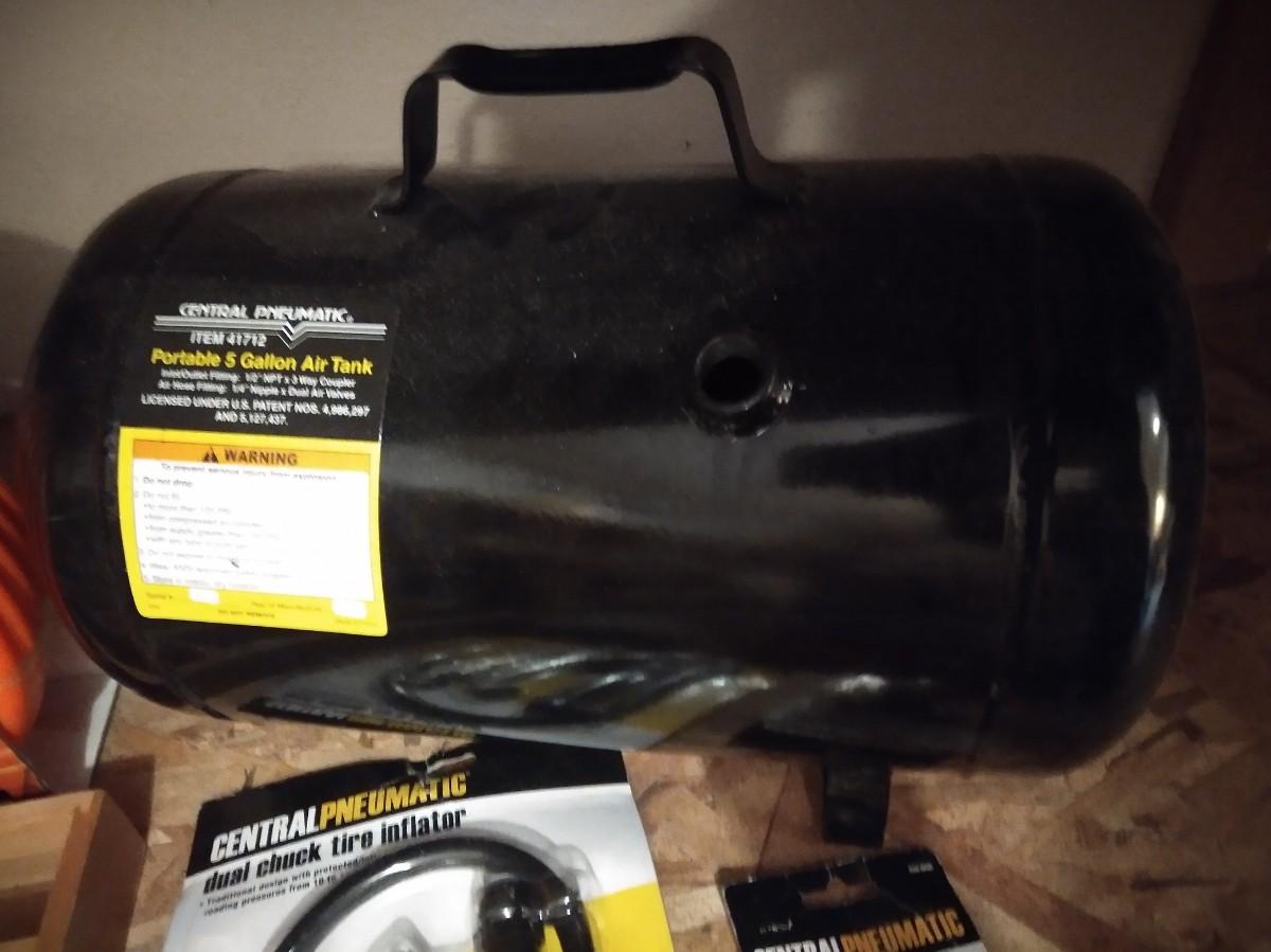 BLACK CENTRAL PNEUMATIC PORTABLE 5 GALLON AIR TANK WITH LIGHTWEIGHT PVC AIRHOSE AND PNEUMATIC FITTINGS.