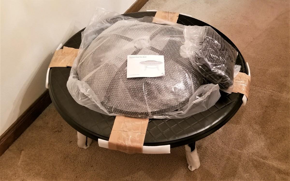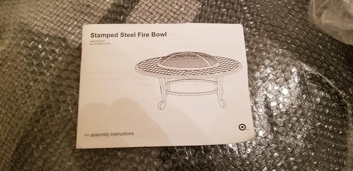 This Stamped Steel fire pit is new and unused - we got rid of the box because it took up too much room. COMPLETE. 34" across, 13" tall. Very nice.