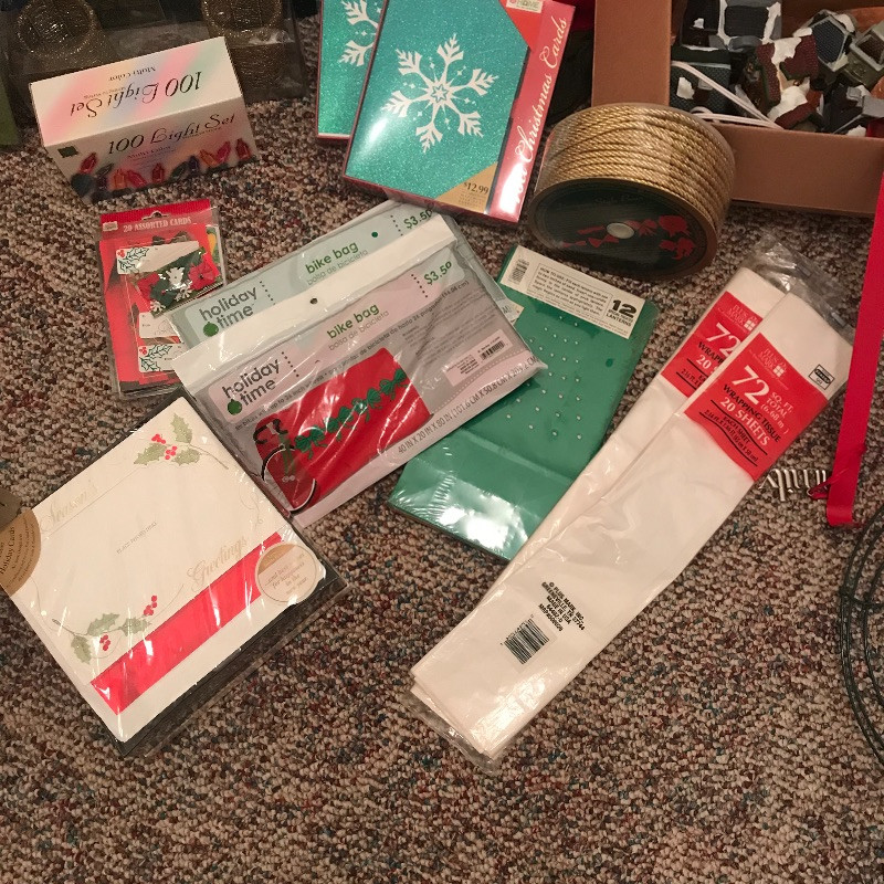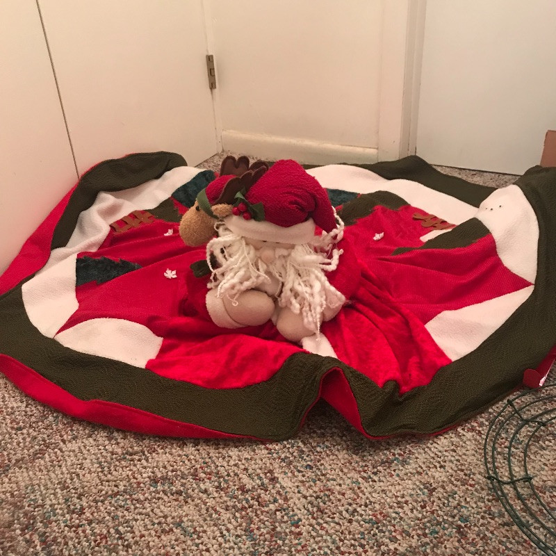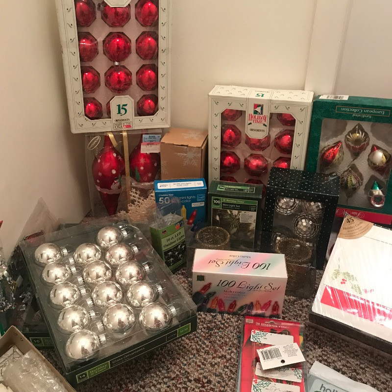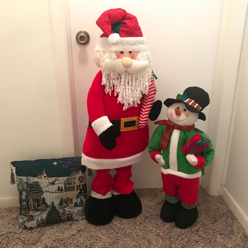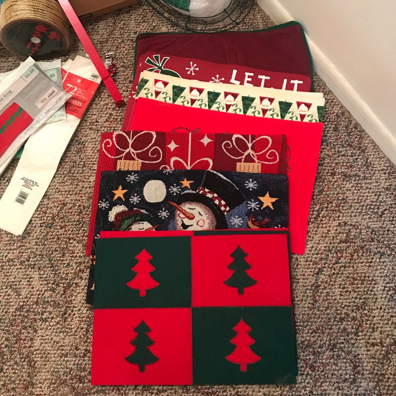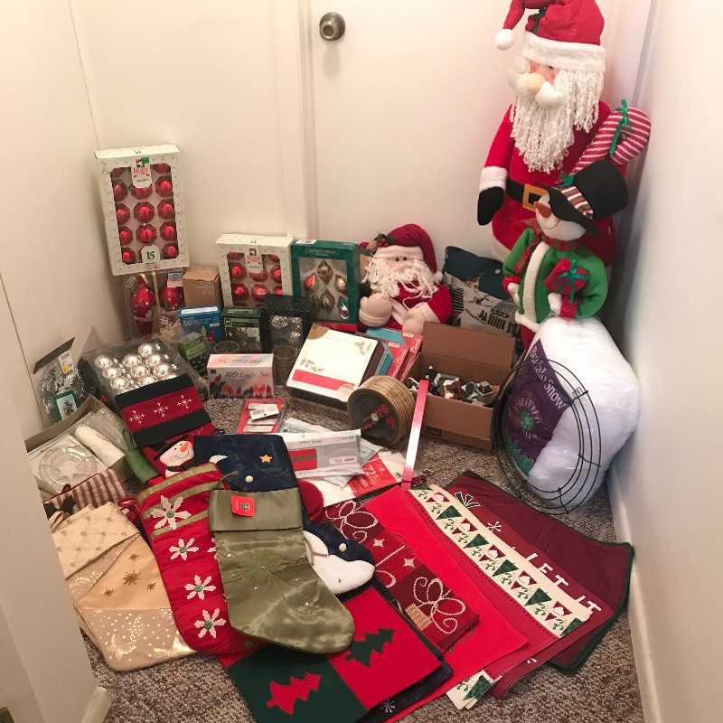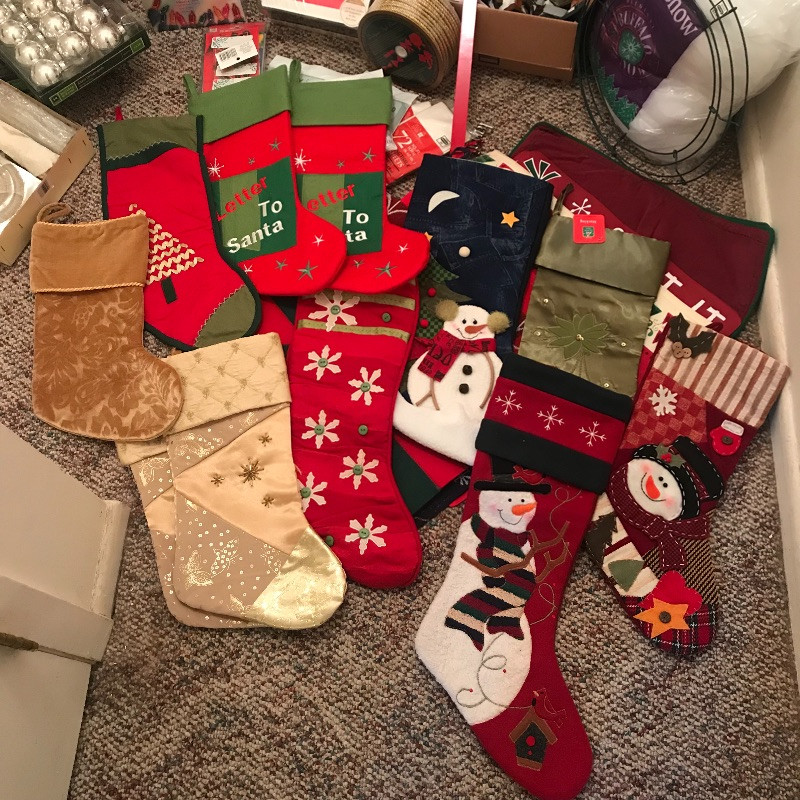 Lot contains eleven Christmas stockings, a few Place Matt’s (no more than three of any design), ornaments, lights, large Santa tree skirt, Santa and snowman soft statues (Santa stands 41” tall) and so much more. See pix for details. Local pick up only.