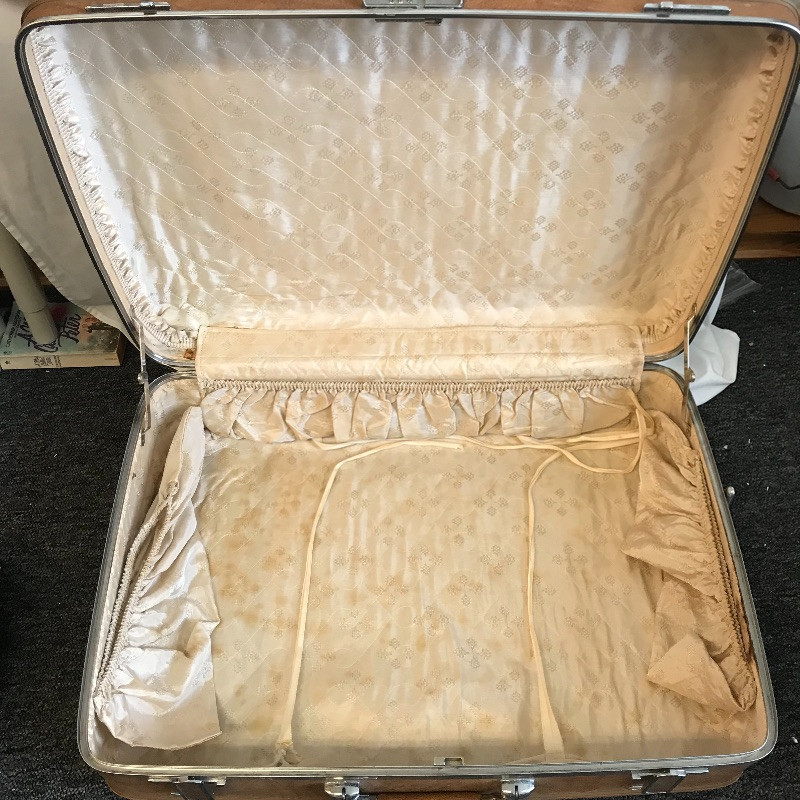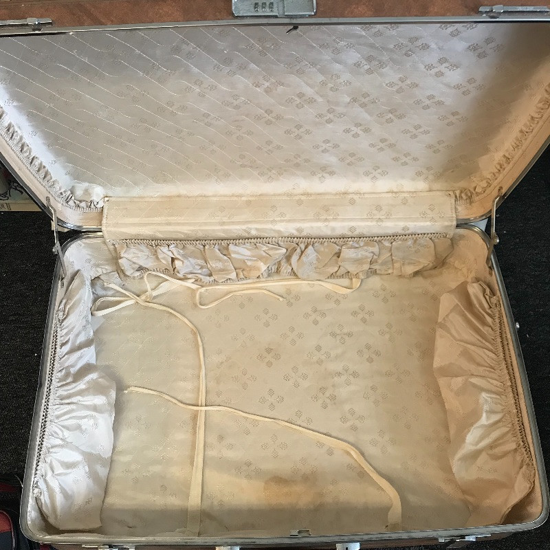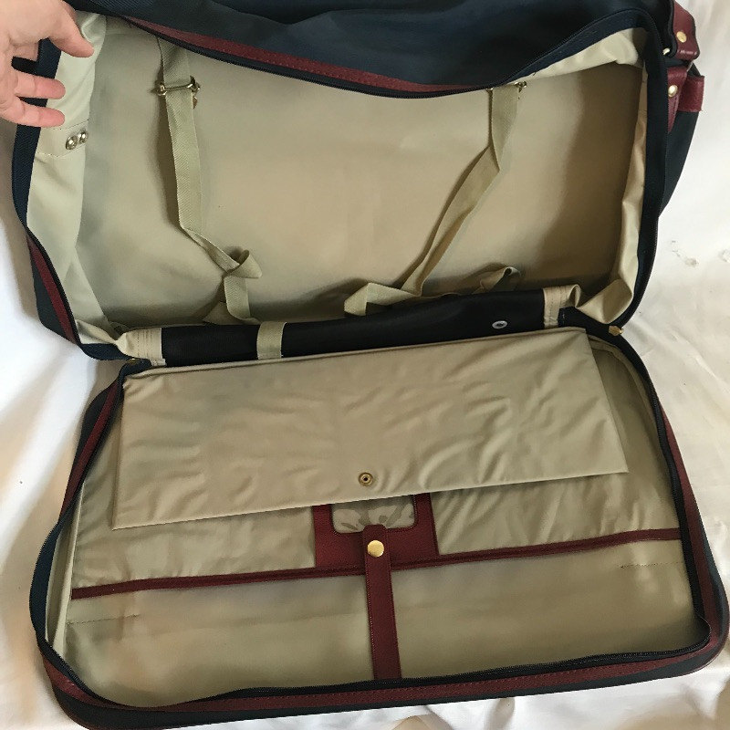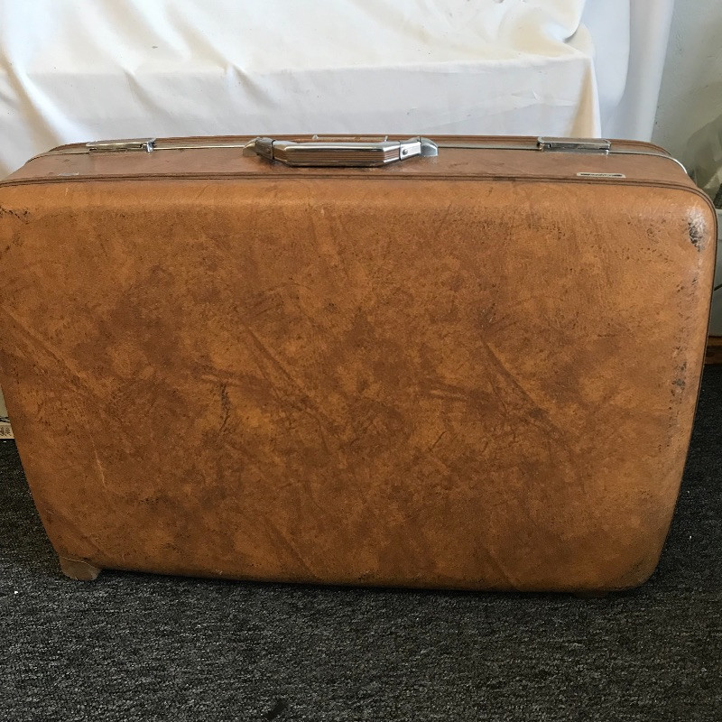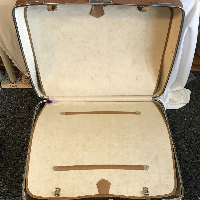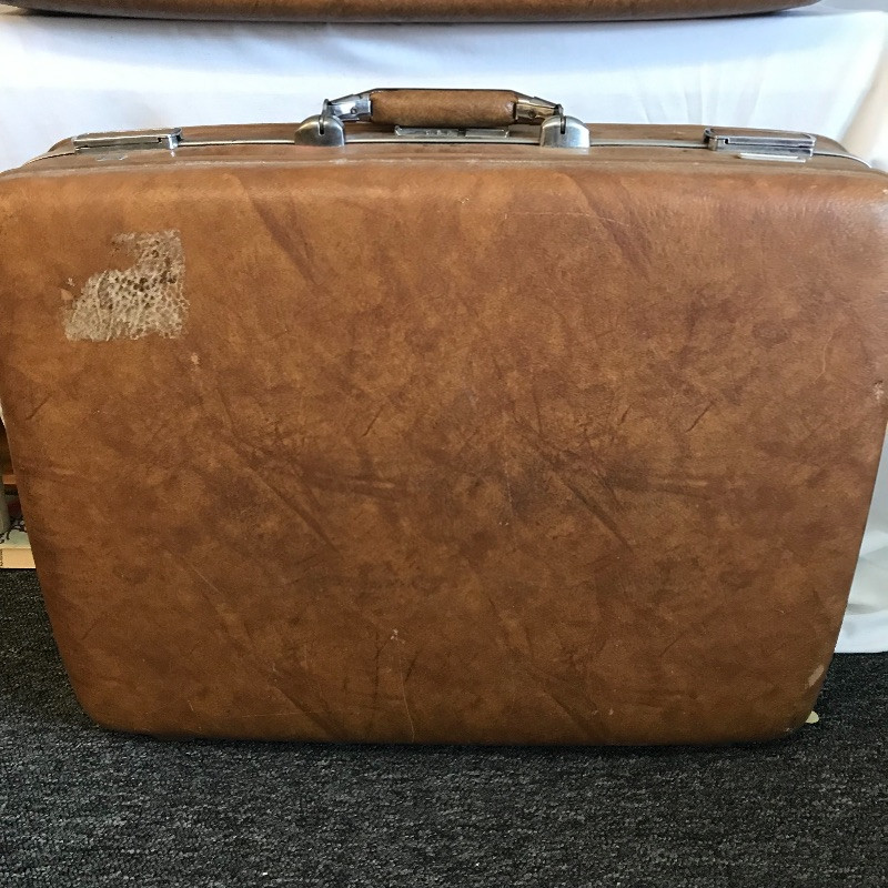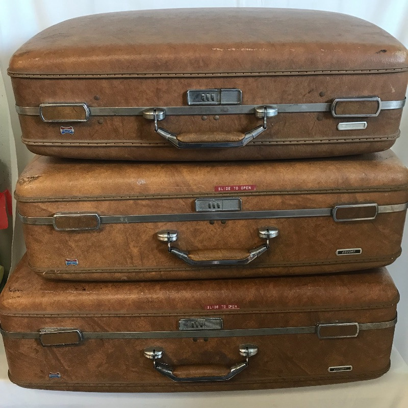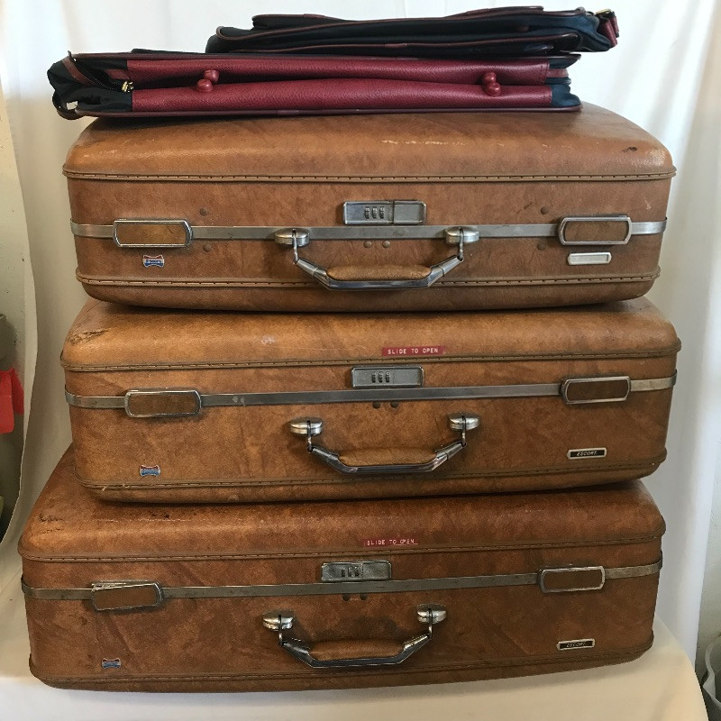 Three vintage leather looking hard suitcases by Escort. These cases appear very sturdy and quite nice for their age. Wear is noted in photos, scuffs on the outside and stains and small tears can be found in the lining. A Special Edition Samsonite soft small suitcase set accompanies the Escort collection. These two appear in like new condition with a smaller bag with lots of pockets and a larger case (it’s face measures 22” x 13.5”), both fold up flat for convenient storage and appear to have maroon leather accents. See Images. Local Pickup Only.