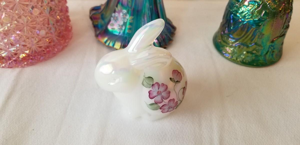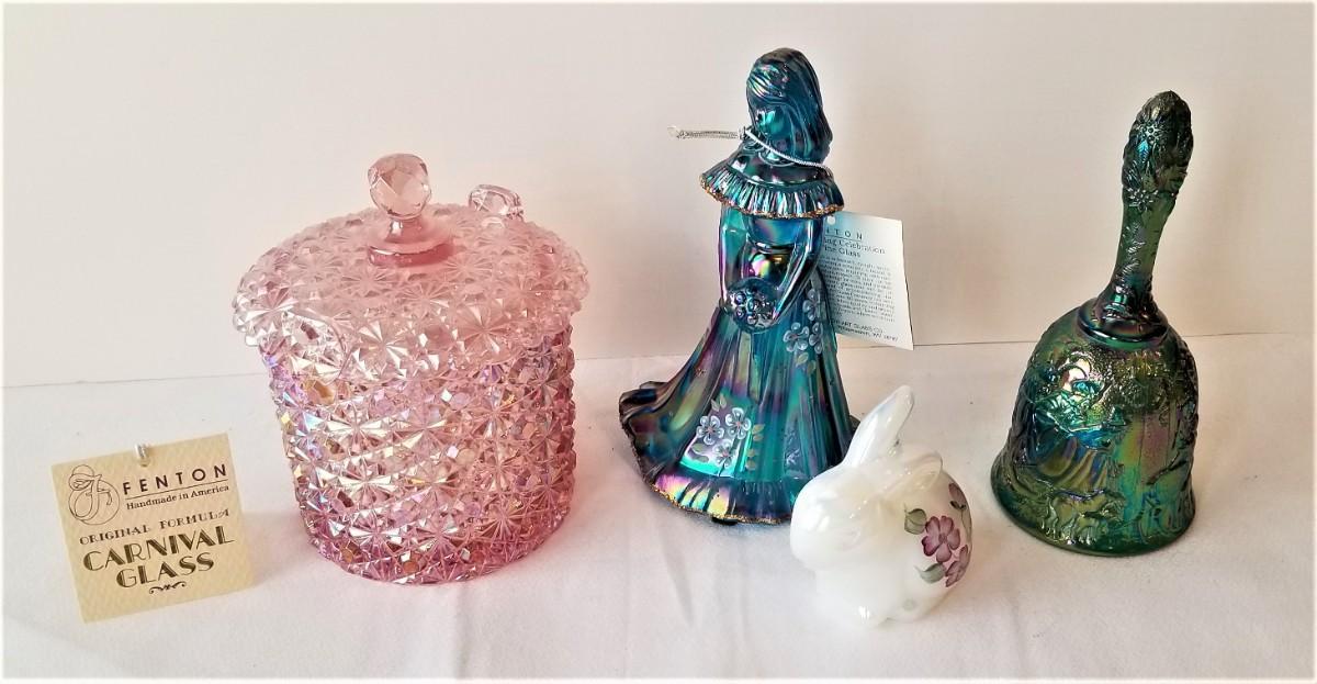 You get all you see here. Daisy Button Box, Bunny, Southern Belle (6.5" tall), Carnival Glass Bell. All in good condition. All are Fenton Art glass.