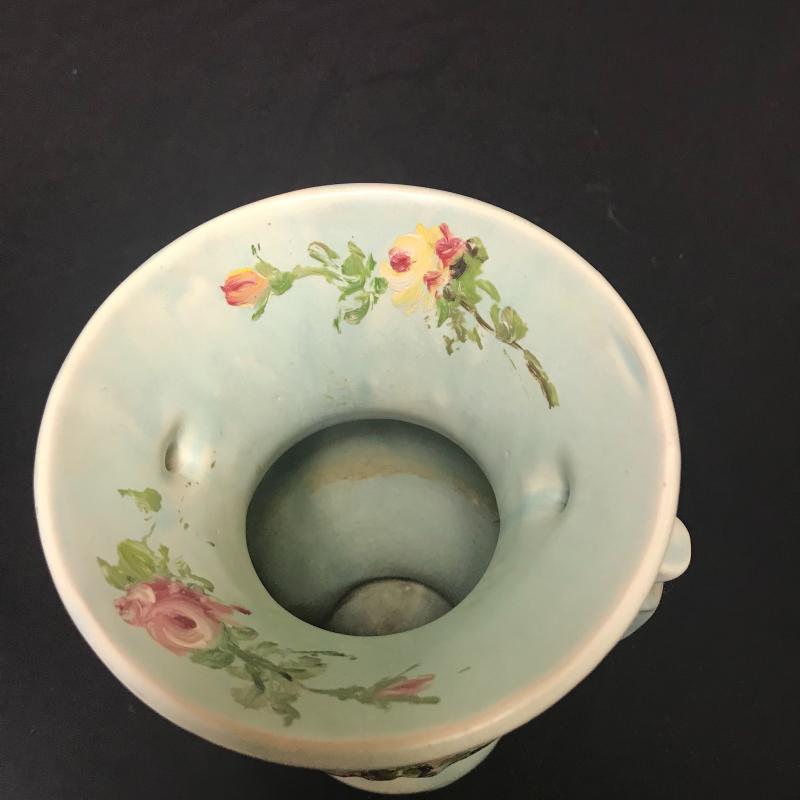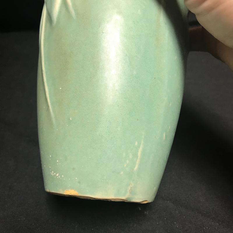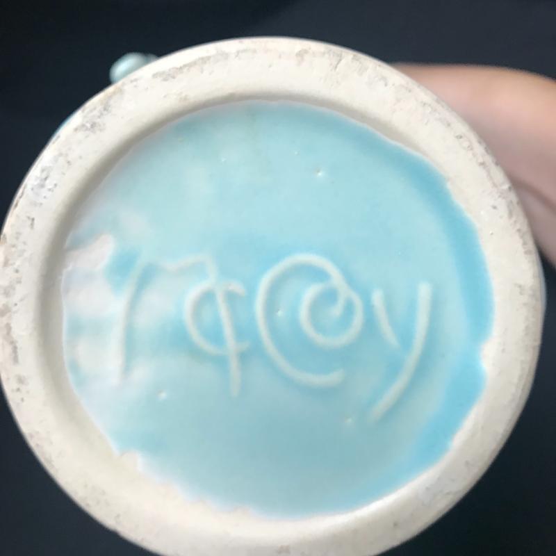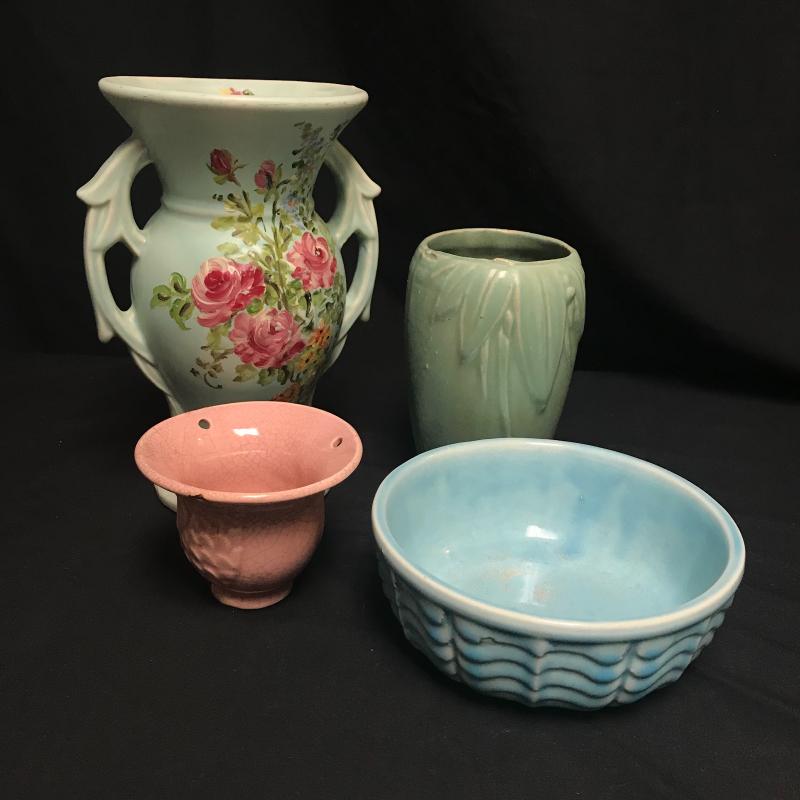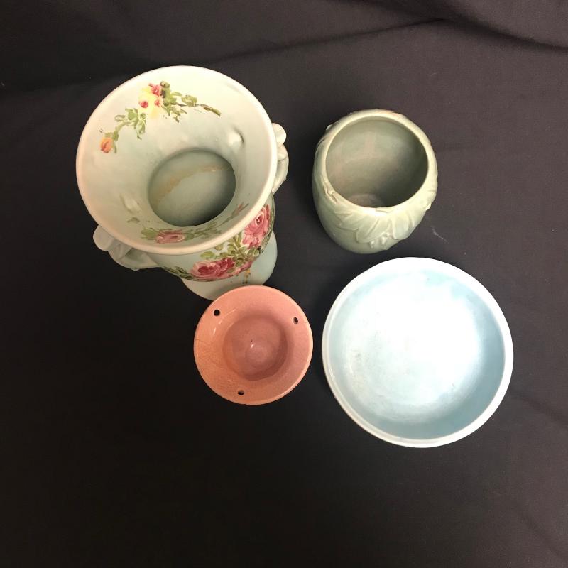4 lovely pottery pieces, large floral painted green McCoy vase measures 9” x7” and is in great condition. Low aqua colored piece by Roseville measures 6.5” x2.5” also in great condition. The other two have no identifying markers. Shipping available.