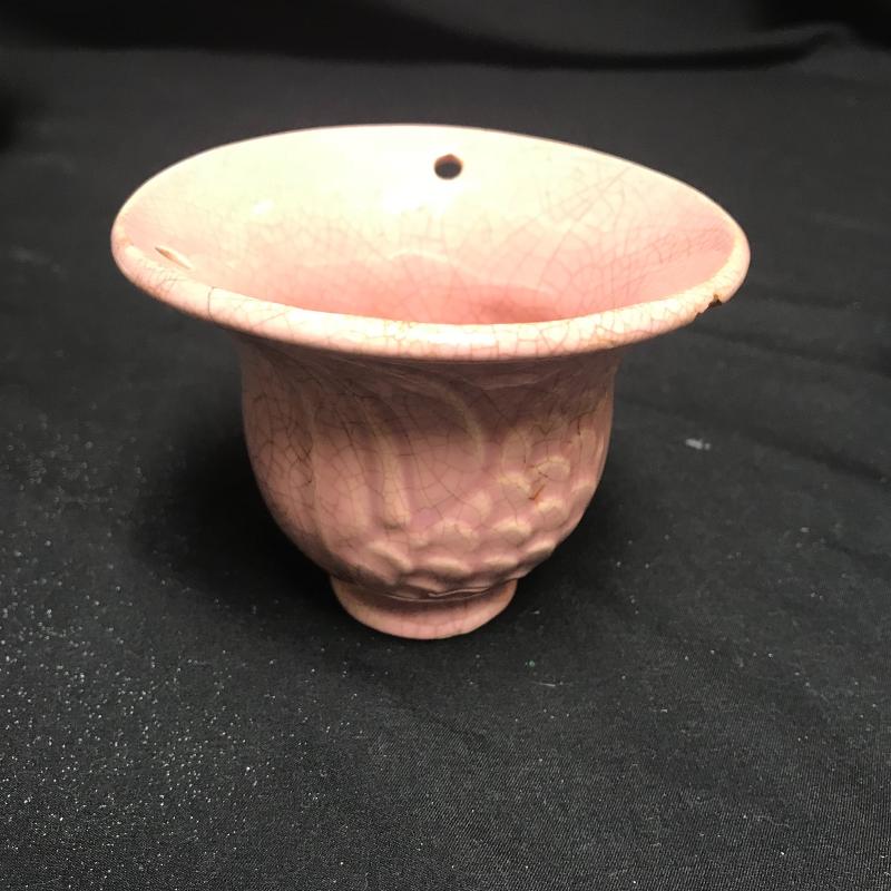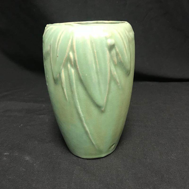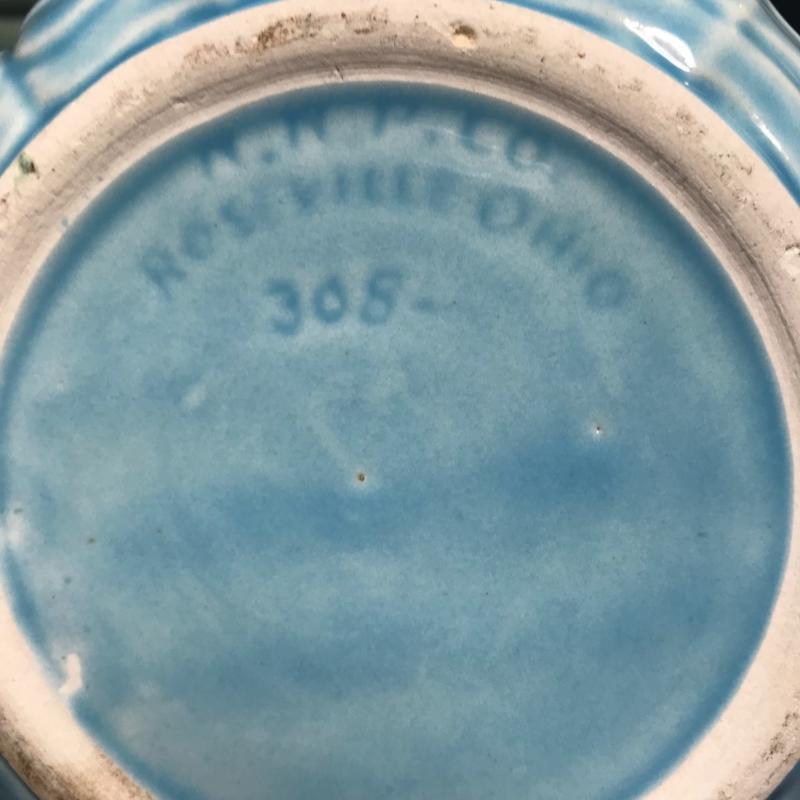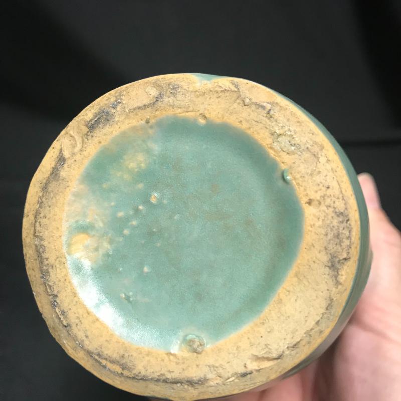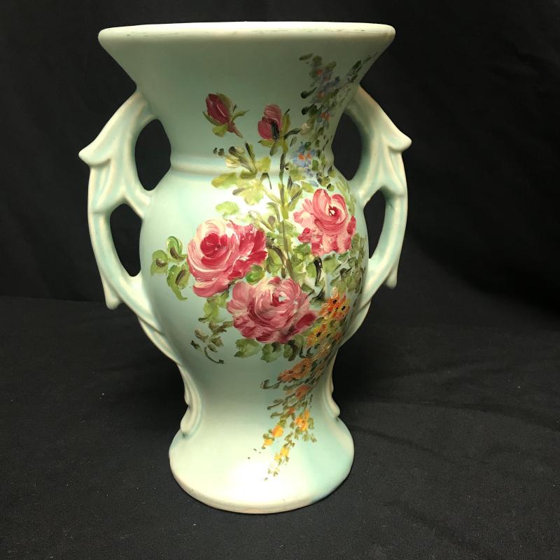4 lovely pottery pieces, large floral painted green McCoy vase measures 9” x7” and is in great condition. Low aqua colored piece by Roseville measures 6.5” x2.5” also in great condition. The other two have no identifying markers. Shipping available.
