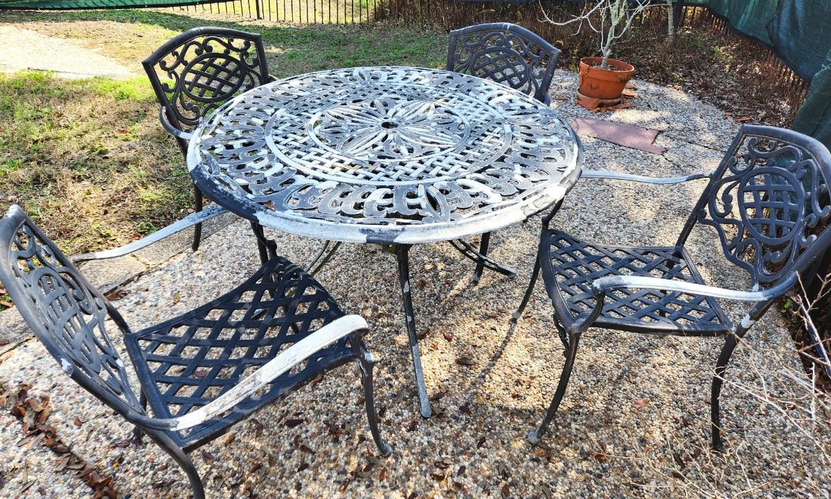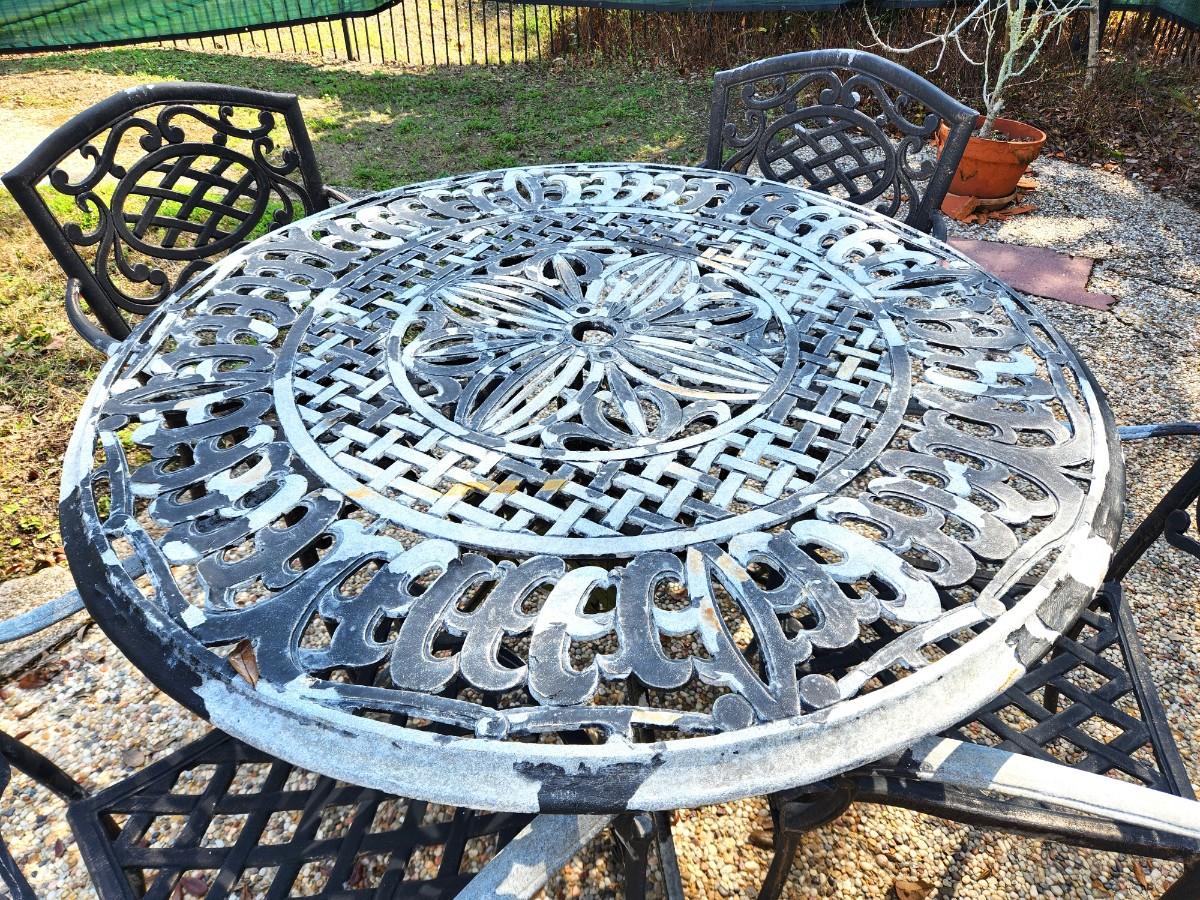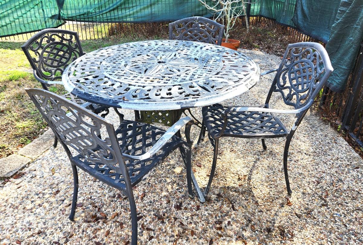 Vintage Patio table (has hole for umbrella) - 4 matching chairs. Metal - note: paint is flecking off in some areas, otherwise good. 48" across, 39" tall.