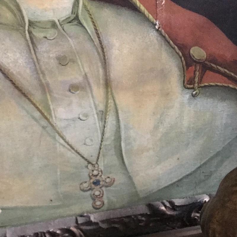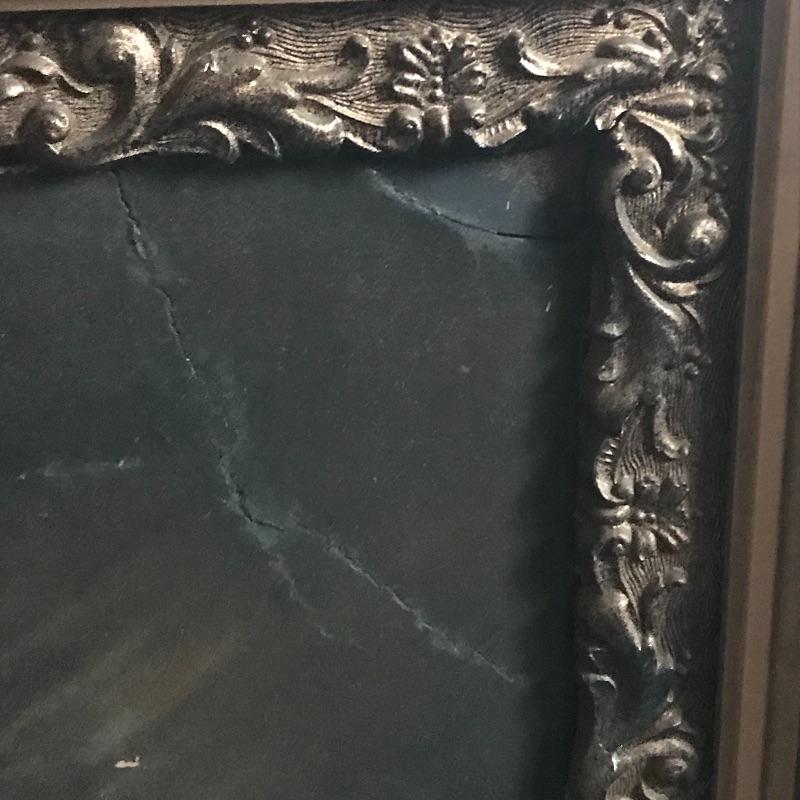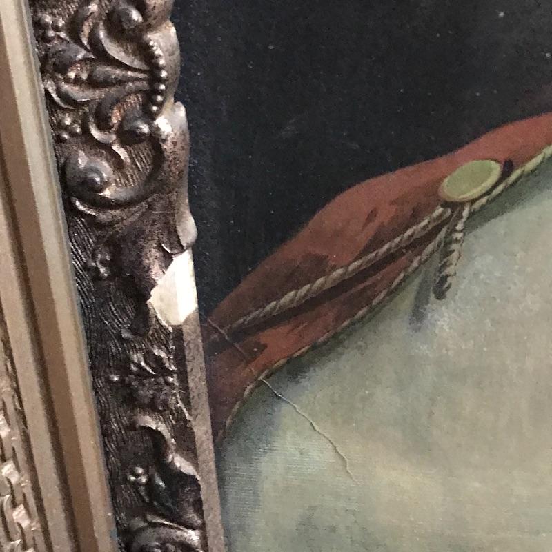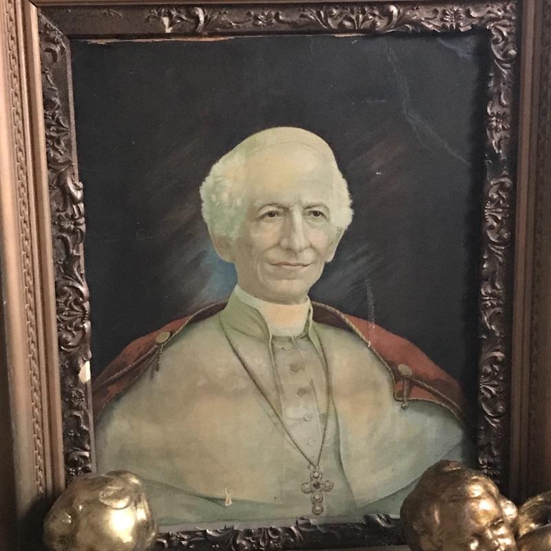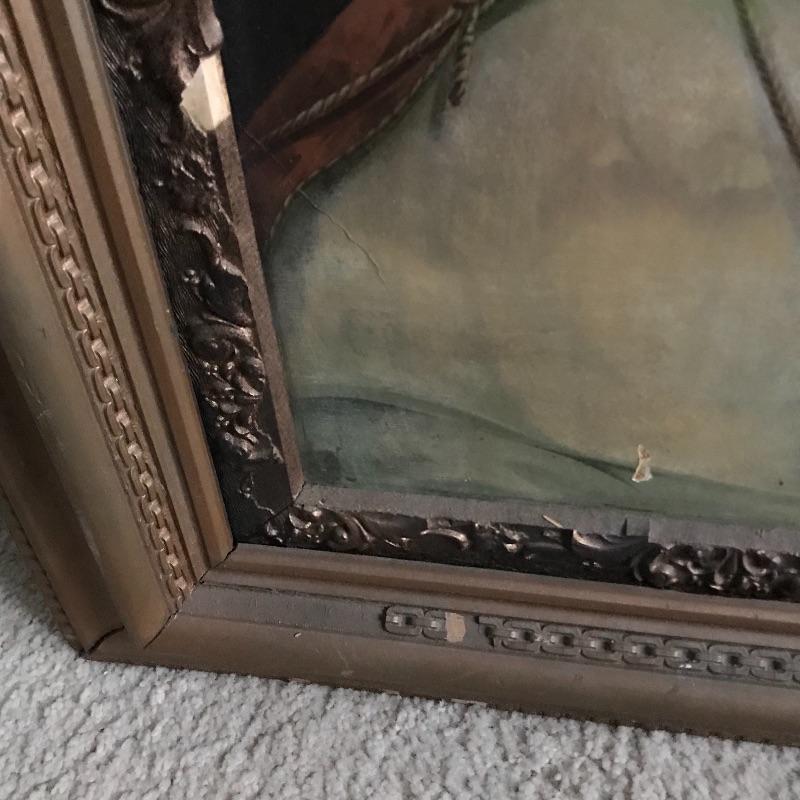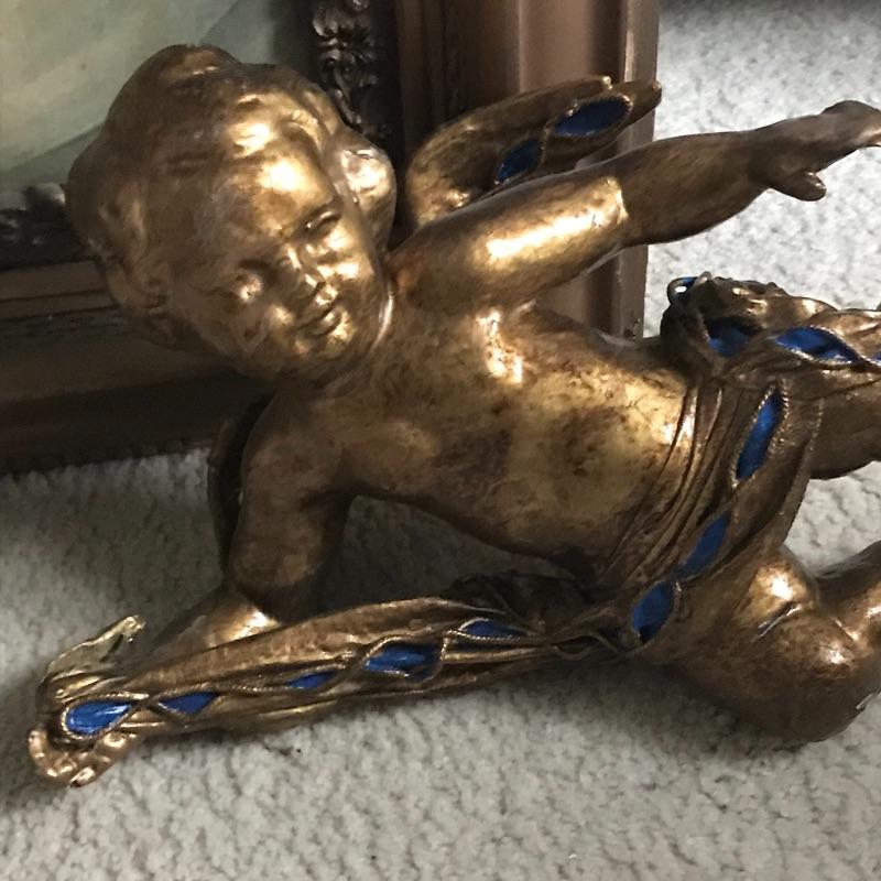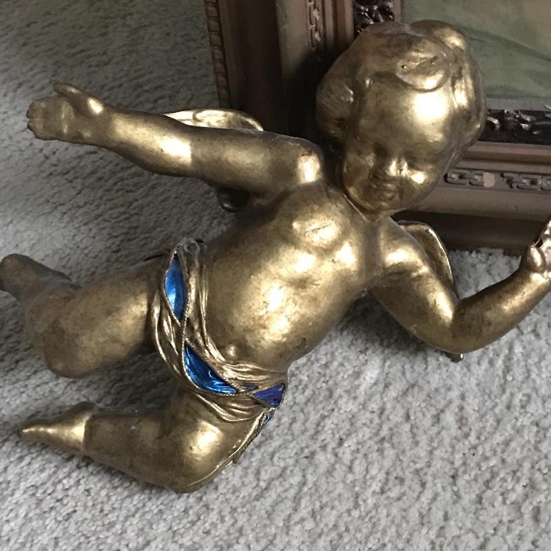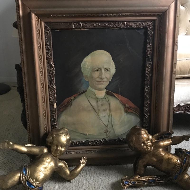Lot contains painting of what appears to be a past pope. No obvious signature. Frame is old and chipped in a few places. Approx. 30” x 26”. Lot also contains two gold cherubs made of painted plastic. Local pickup only.