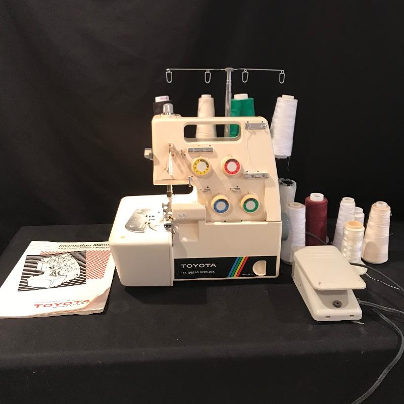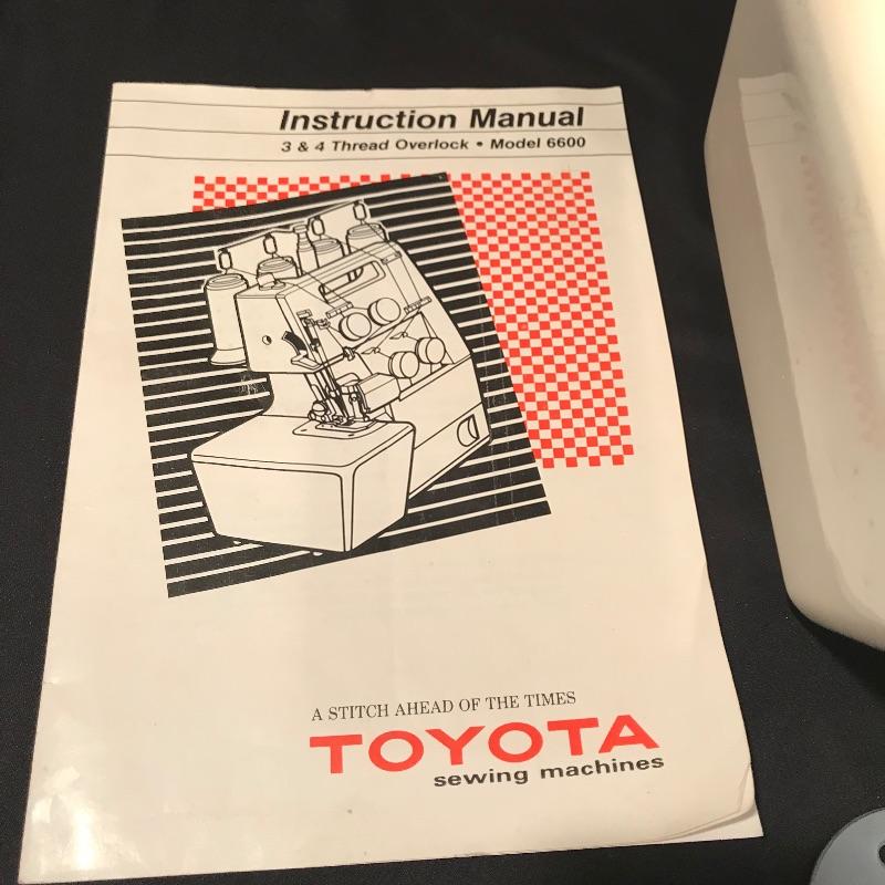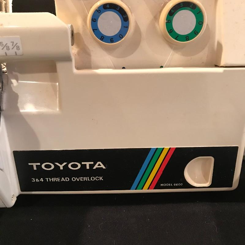 “A Stitch Ahead of the Times” Toyota Sewing machine 3 & 4 Thread Overlock Model 6600. Machine appears to work fine. Toyota is accompanied by about twelve bobbins of different colors and materials. Machine also has owner’s manual and pedal. See photos. Shipping available.