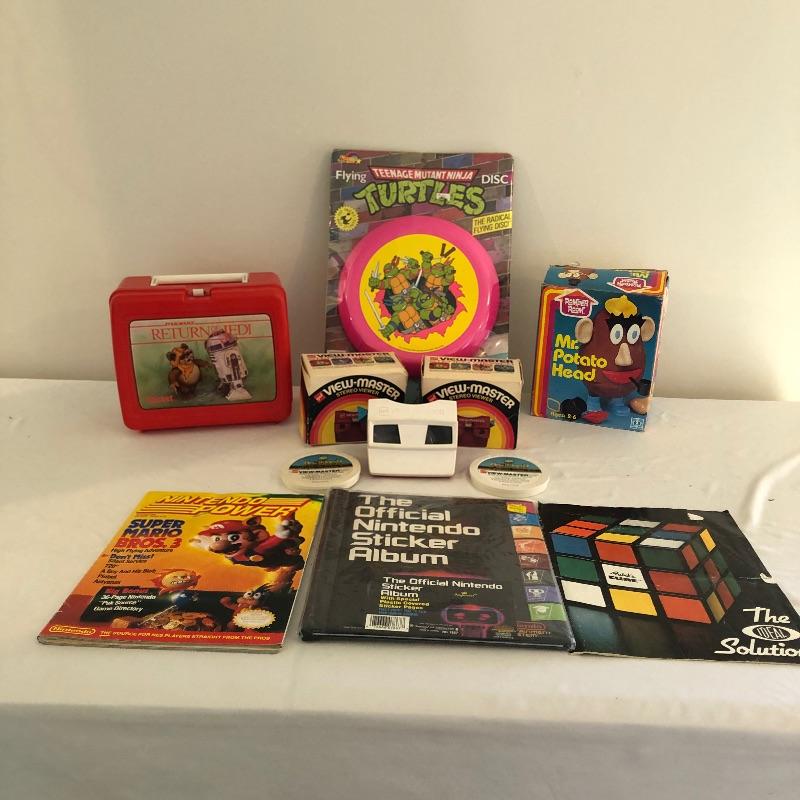 Have a great time with these View-Masters and more. Lot includes three View-Masters, two stereo wheels for View-Master of Walt Disney World, Nintendo stickers and magazine, Teenage Mutant Ninja Turtles flying disc, Mr Potato Head and a Return of the Jedi lunch box.