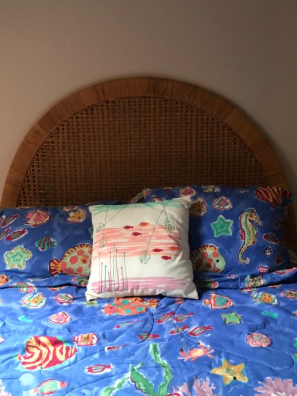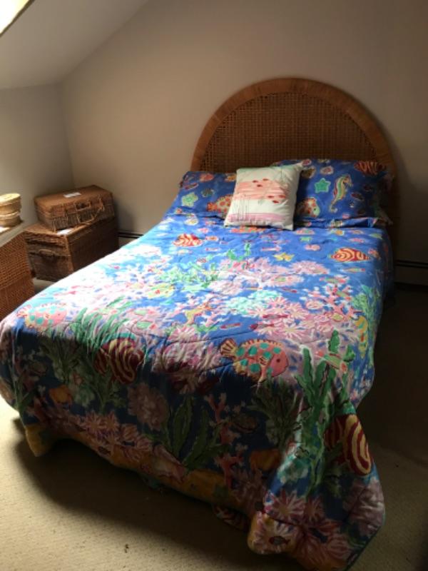 Full size wicker headboard, frame and bedding. Bedding by Home Innovation.
