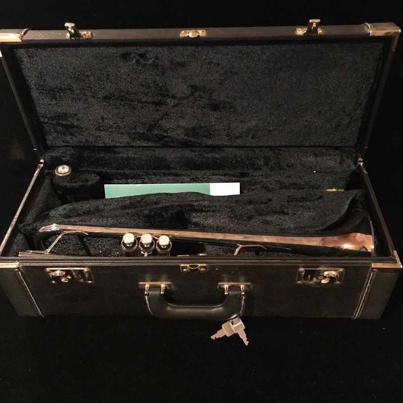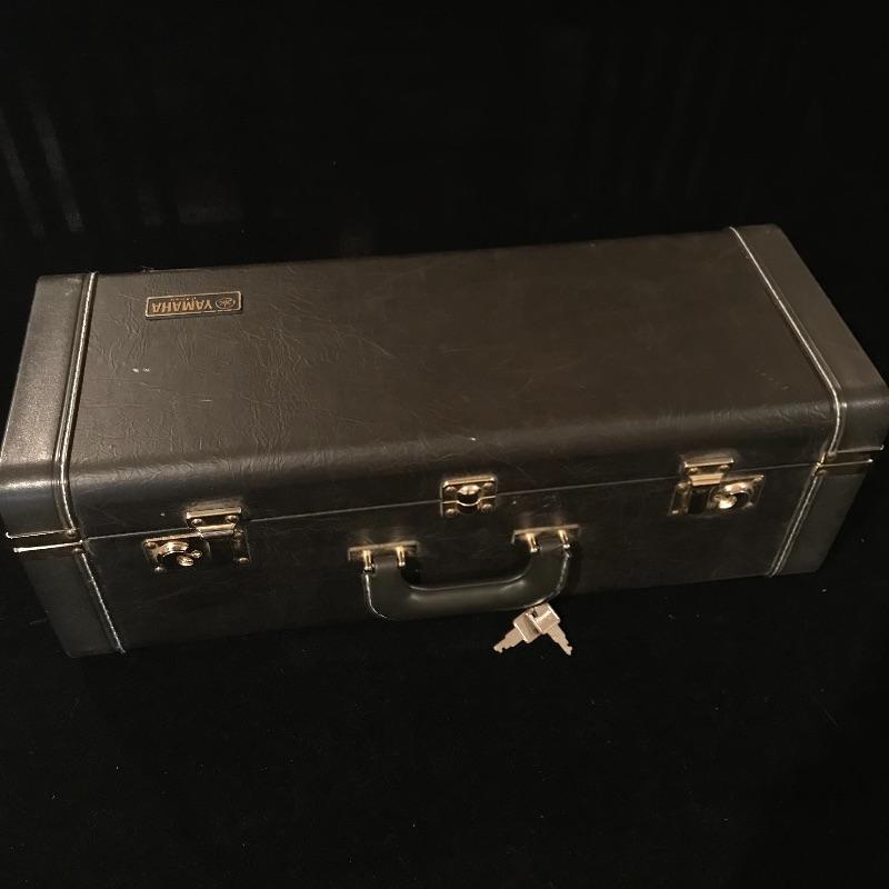 Silver and brass colored Yamaha stamped “YTR 6335 HS” and “001050”. Appears to be silver plated and can use a little polishing. Valves push down, but need help back to original position. Trumpet is complete with Yamaha hard case with keys and mouthpiece. Waterkey appears to be in working order. Sound quality has not been tested. Case measures approximately 22” x 8” x 7.5”. Shipping available.