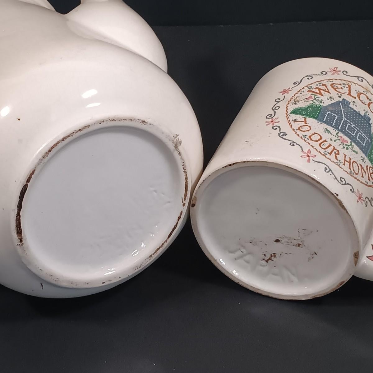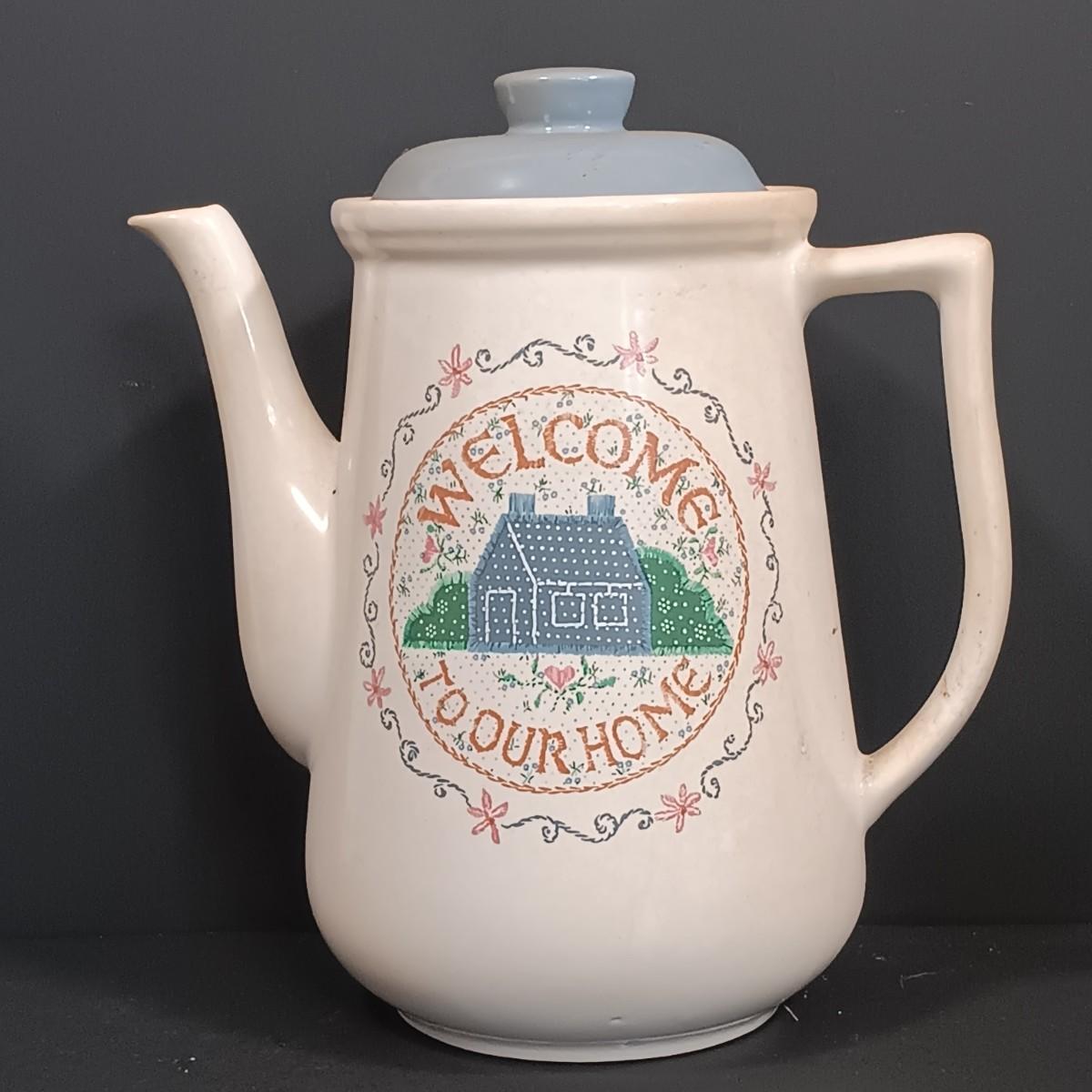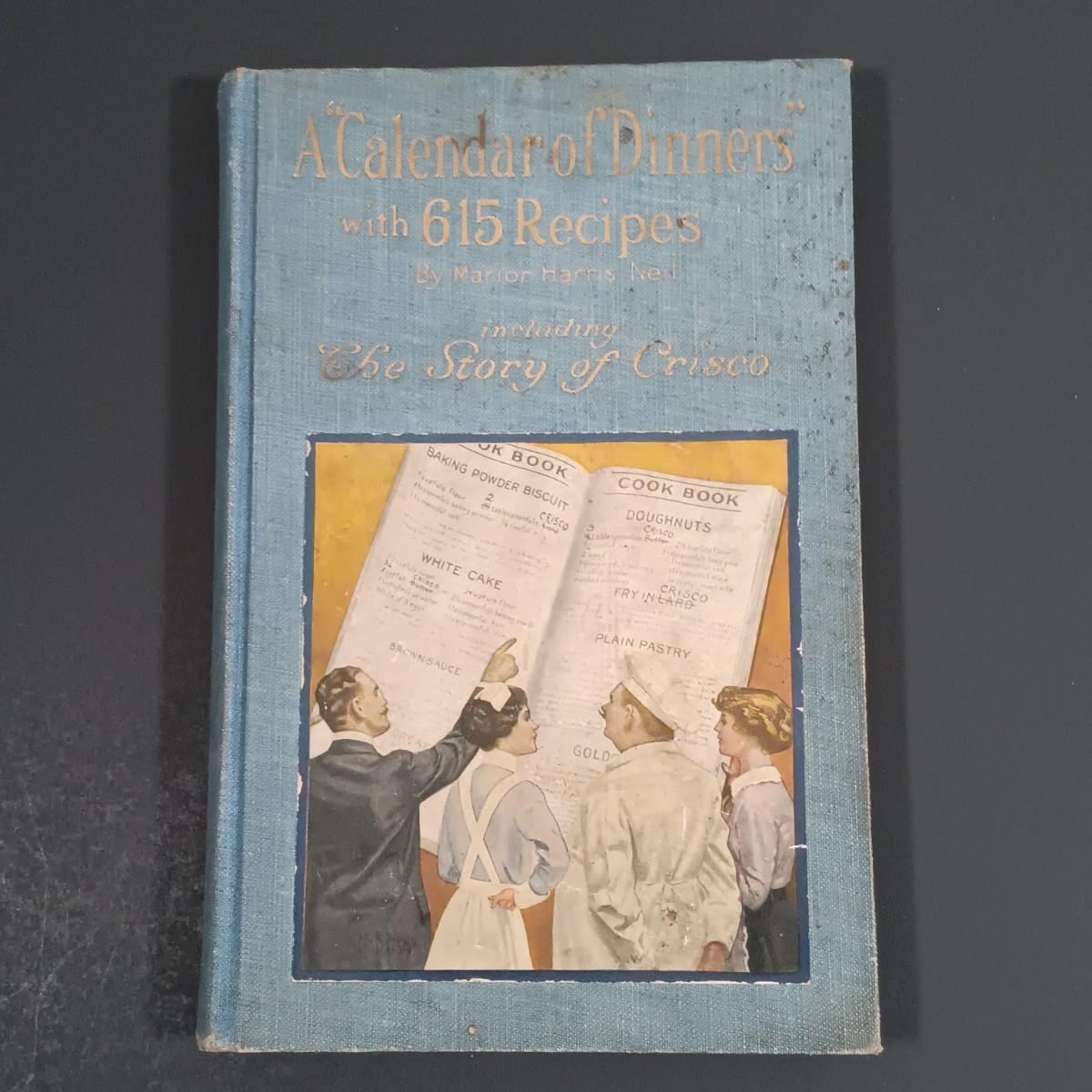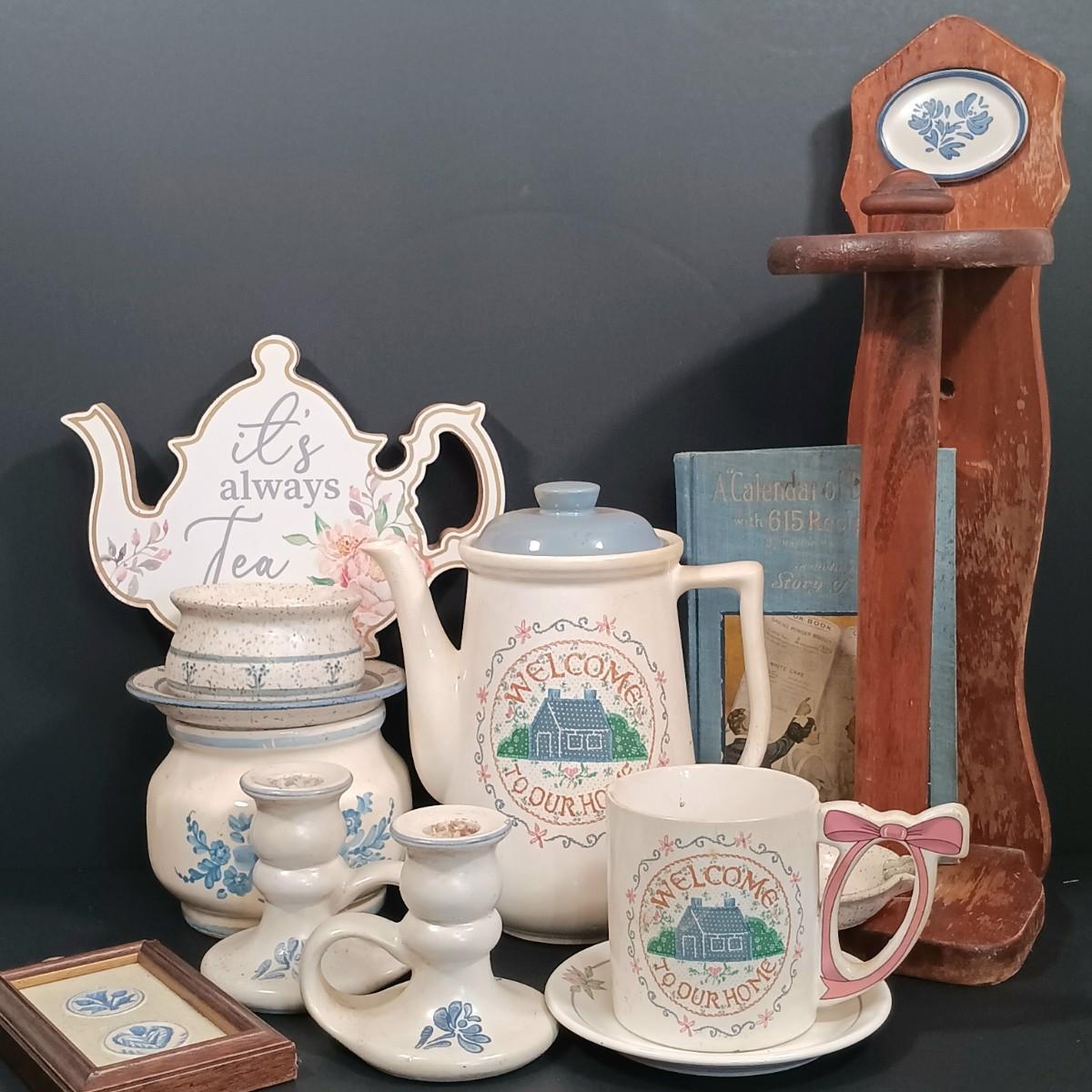 LOT 212K: Vintage Ceramic Coffee Pot & Mug w/ 'A Calendar of Dinners' Cookbook, Framed Butter Molds & More