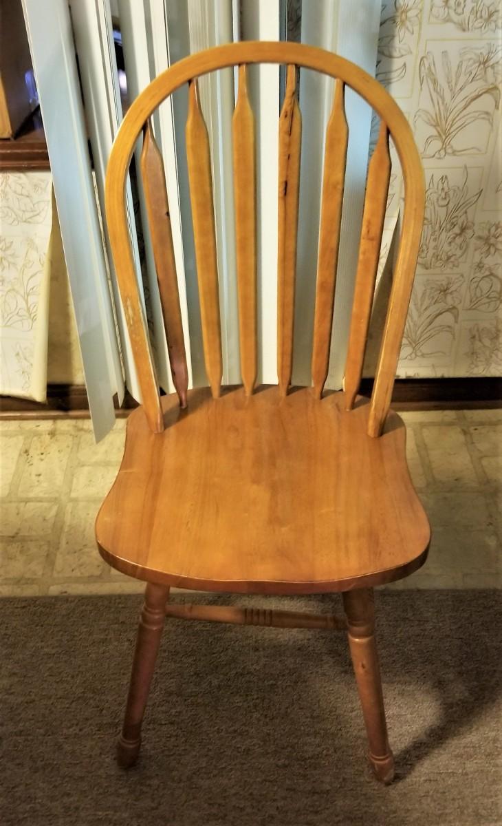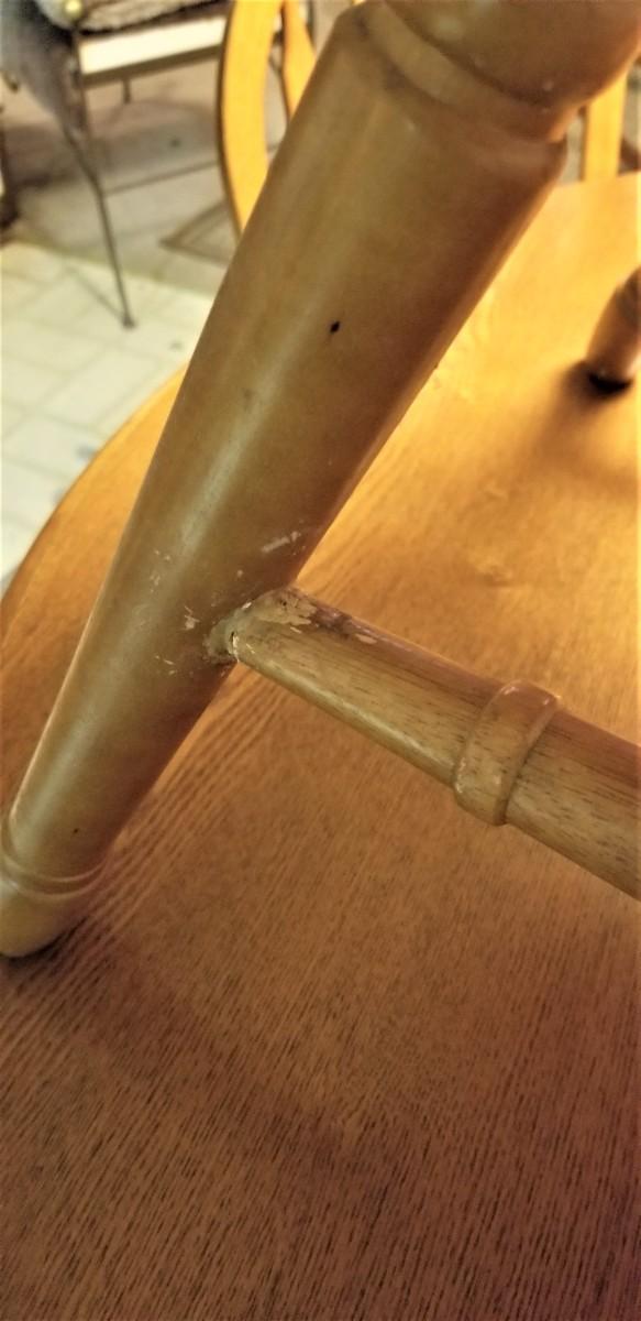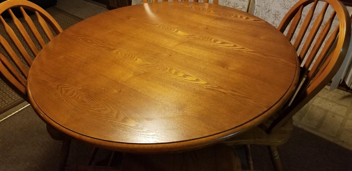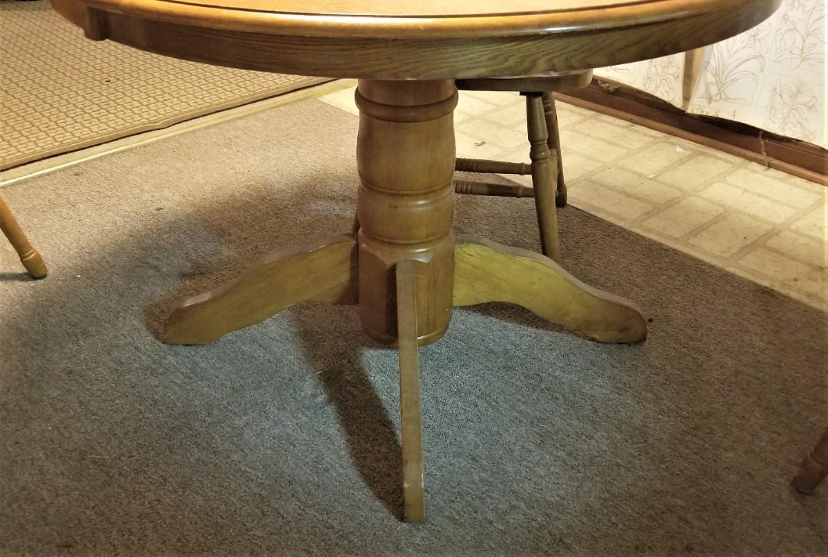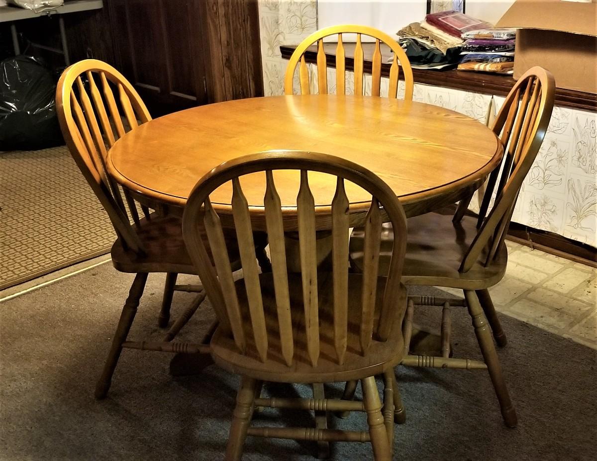 Gently used - one chair show evidence of an old repair (not noticeable). Solid wood 1980's colonial style round pedestal dining table with four matching chairs. 41" across, 29" tall - chairs are 17.5" across, 37" tall at the back. Perfect for a college student, first apartment, or second home.