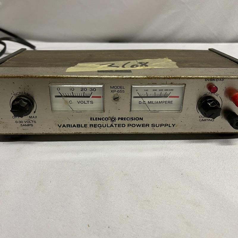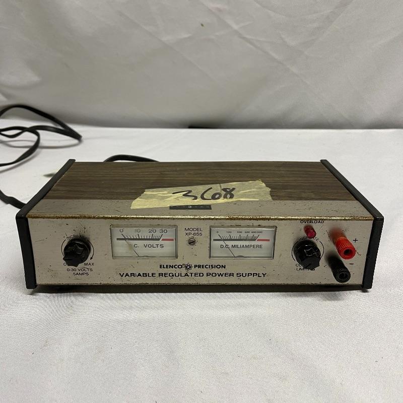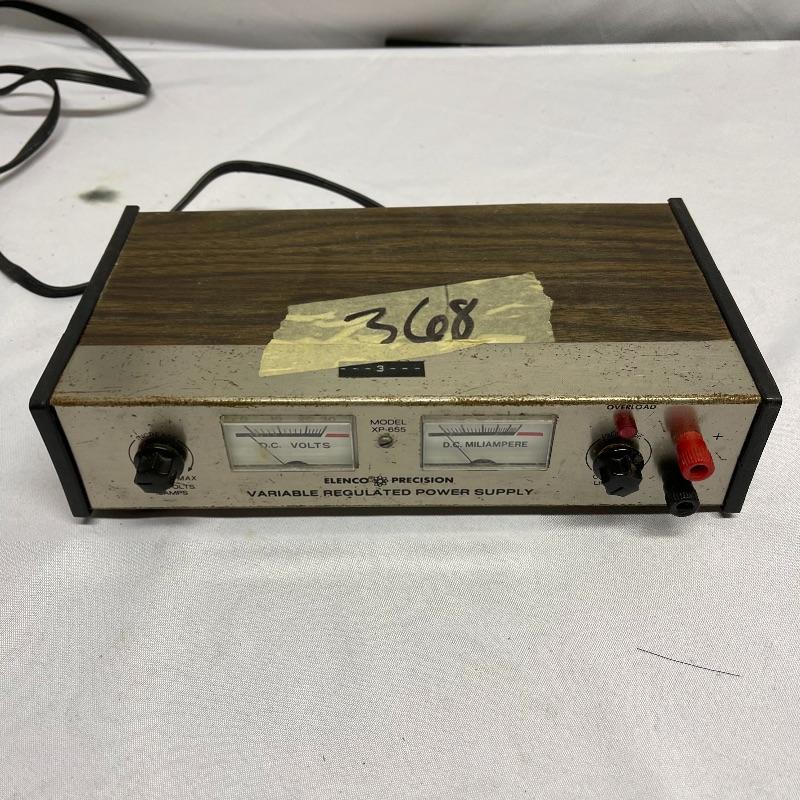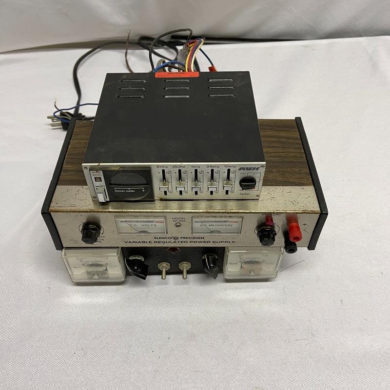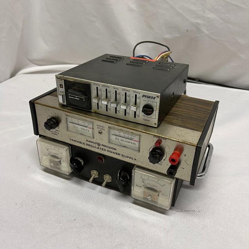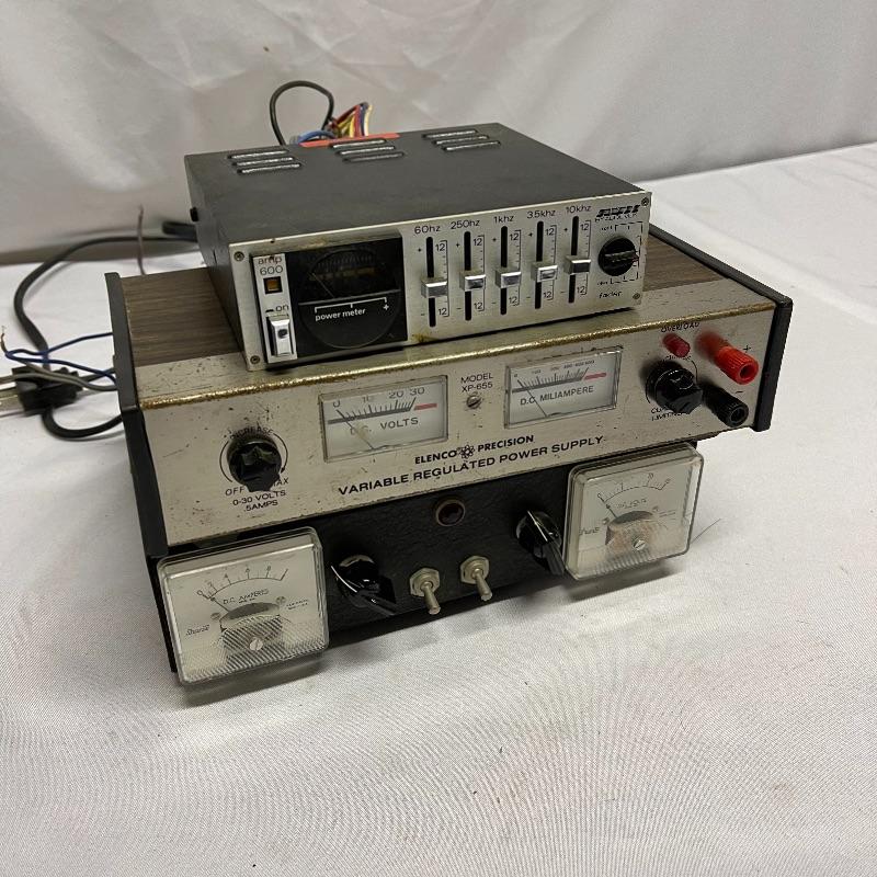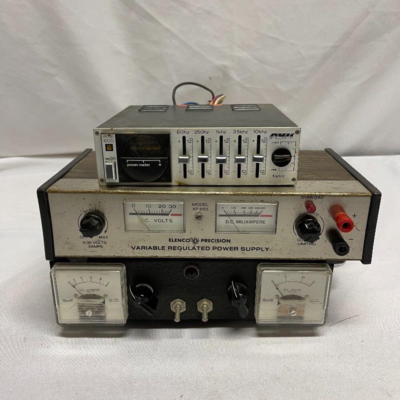 Three units of power equipment. The first is a Shurite model 850. The second is an Elenco Precision variable regulated power supply, model XP-655. When plugged in, it powered on. The last is a fader by Audiovox, model number AMP-600C.