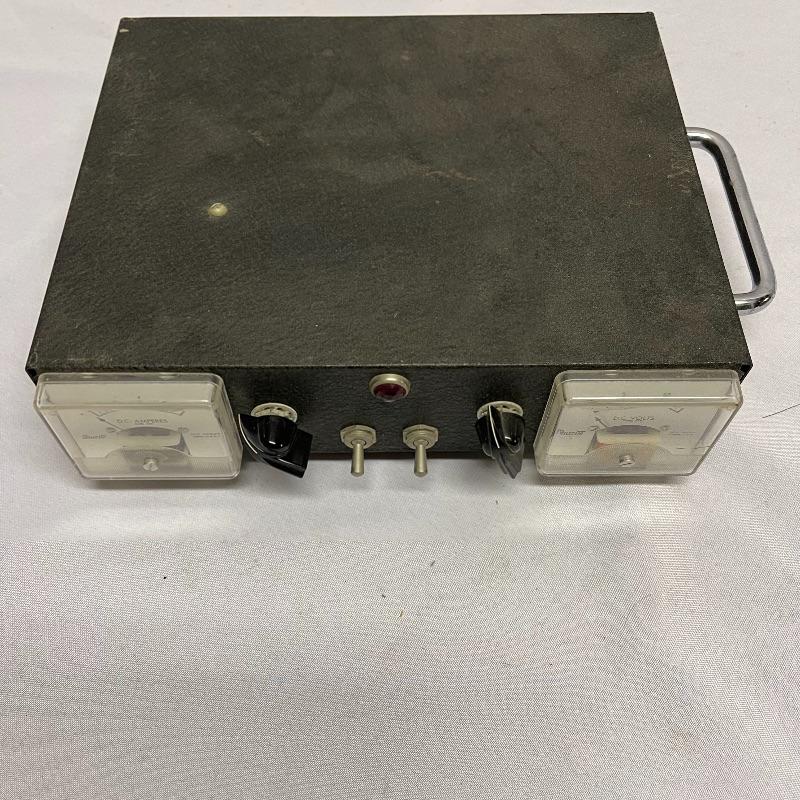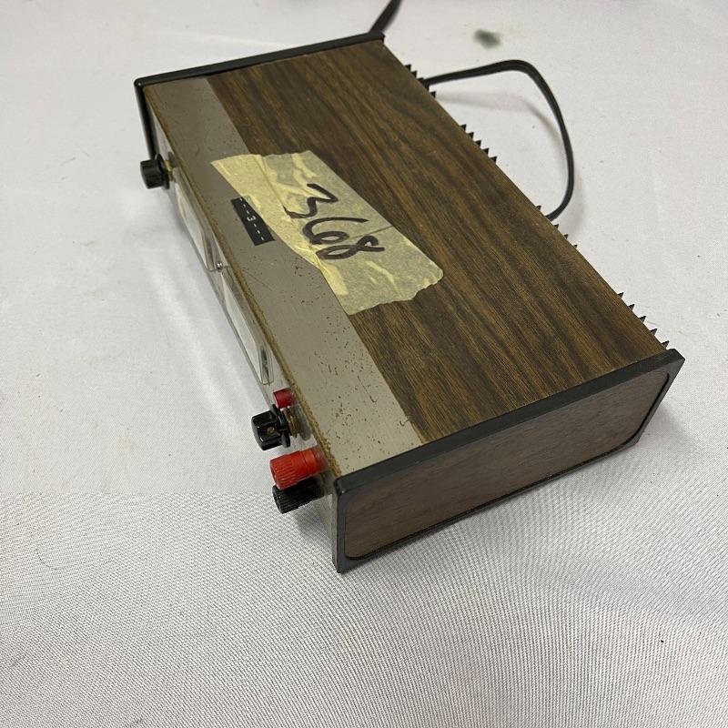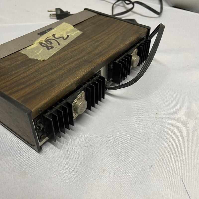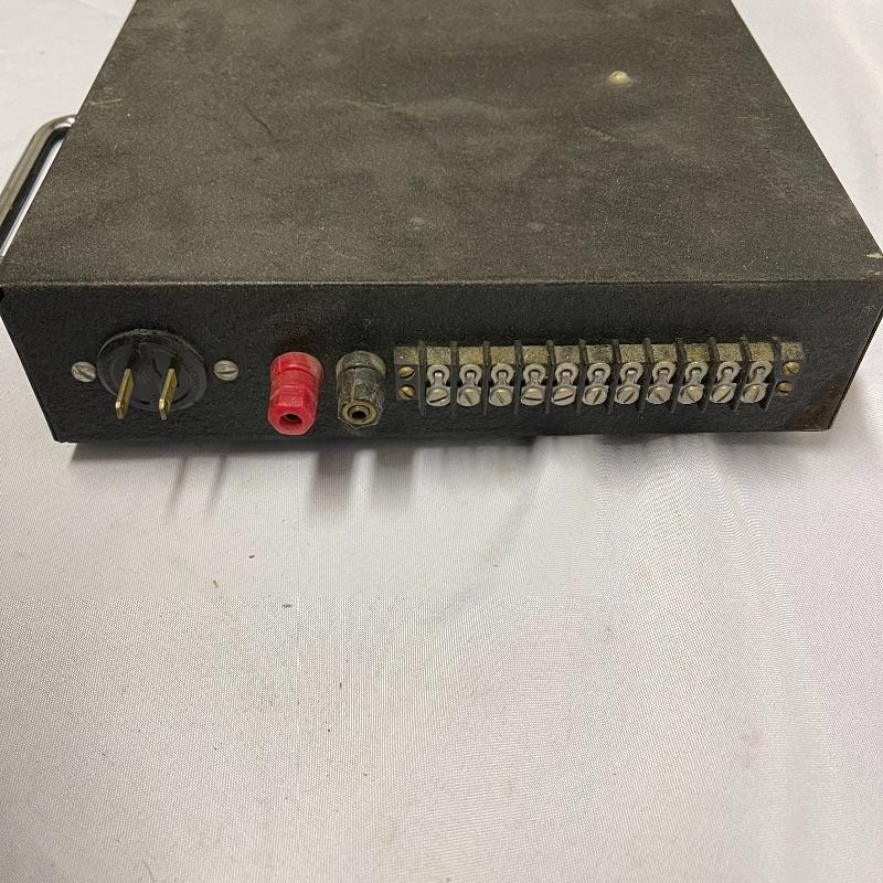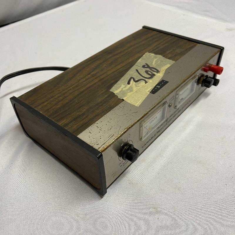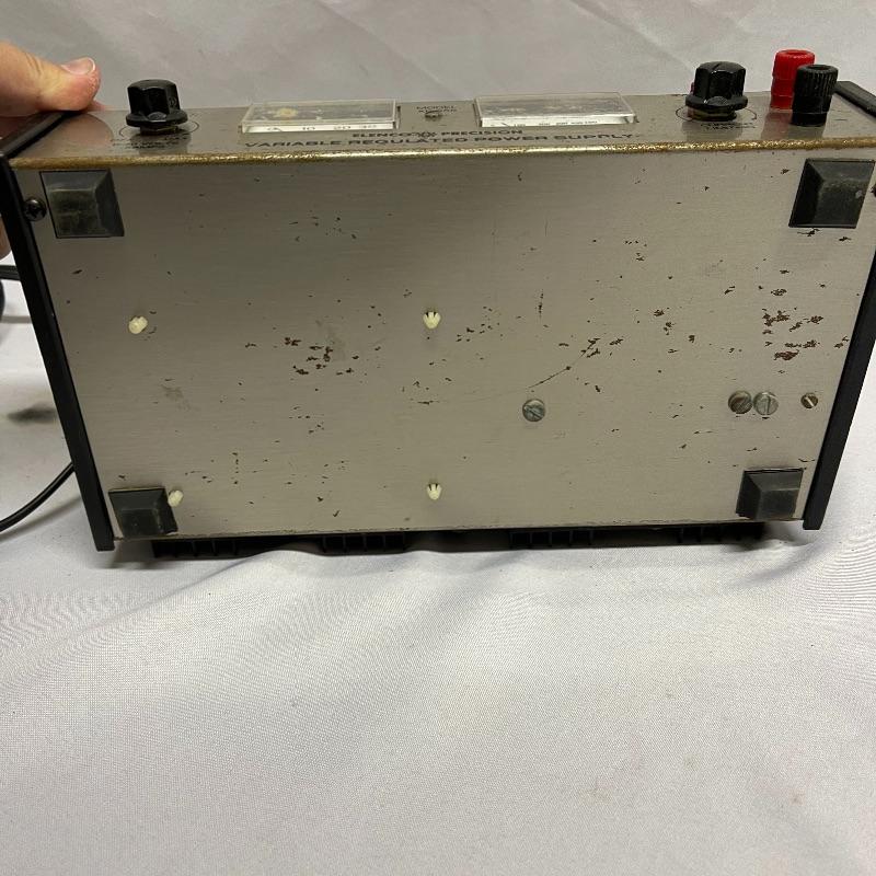 Three units of power equipment. The first is a Shurite model 850. The second is an Elenco Precision variable regulated power supply, model XP-655. When plugged in, it powered on. The last is a fader by Audiovox, model number AMP-600C.