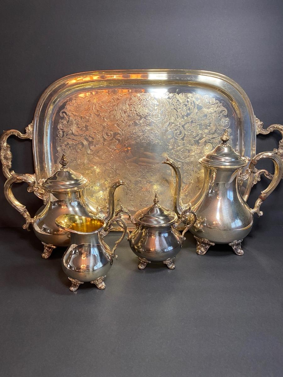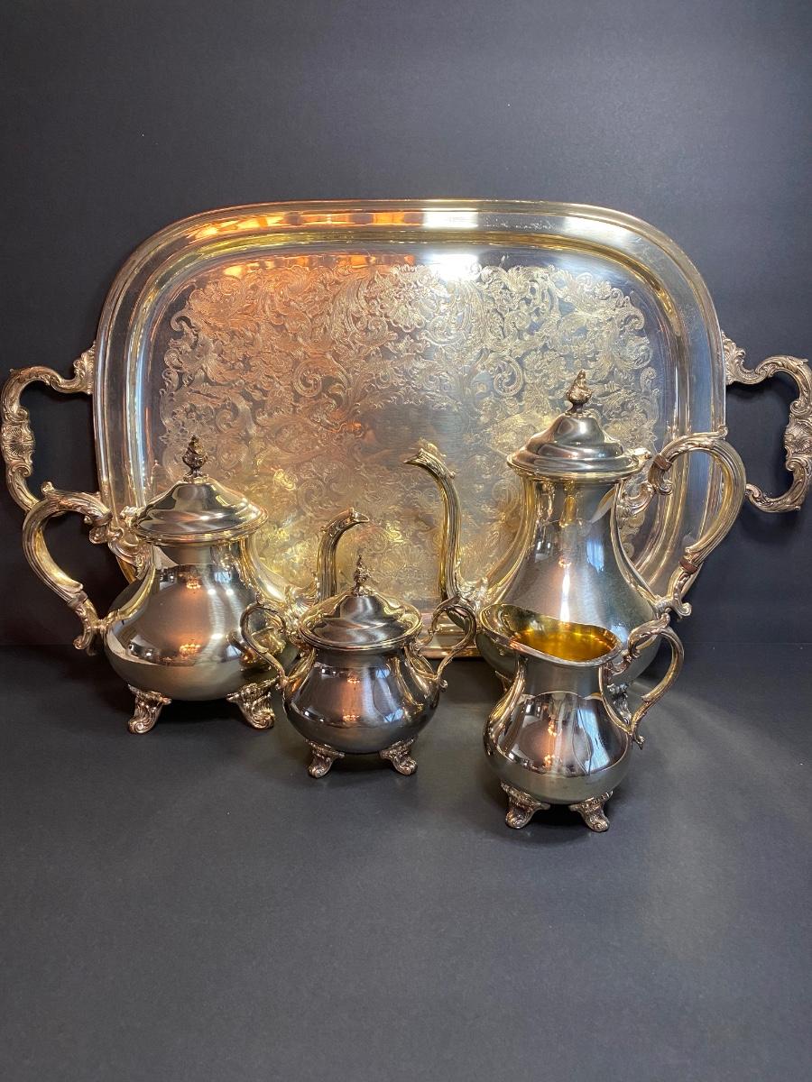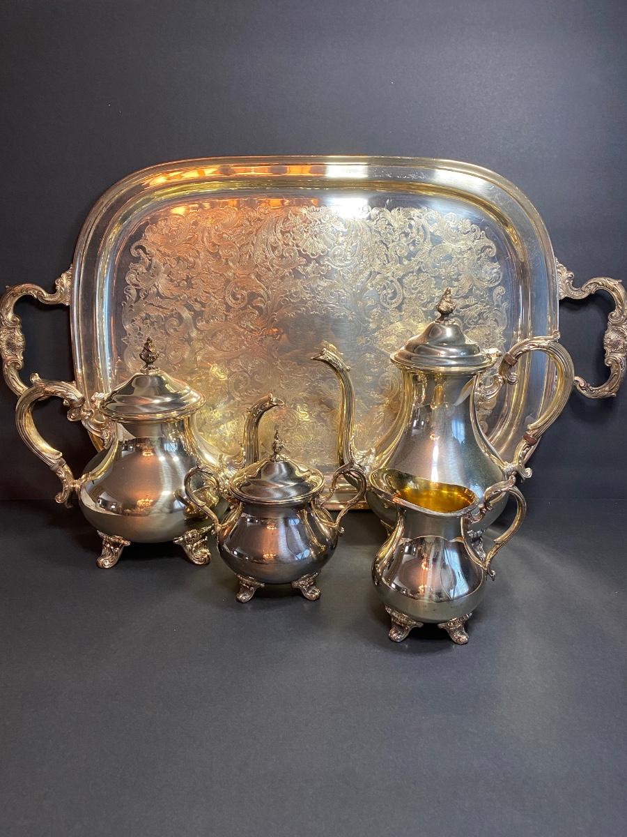 Gorham Silver Original tea set. Lot includes tray and four serving pieces.