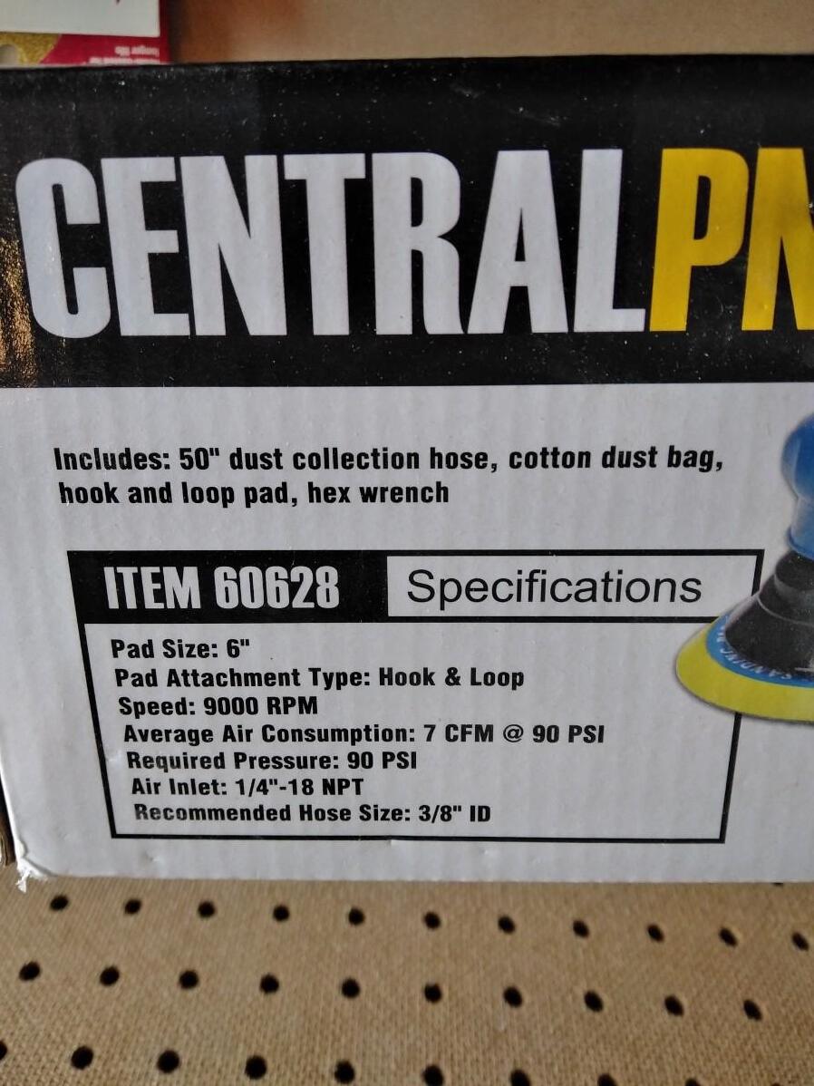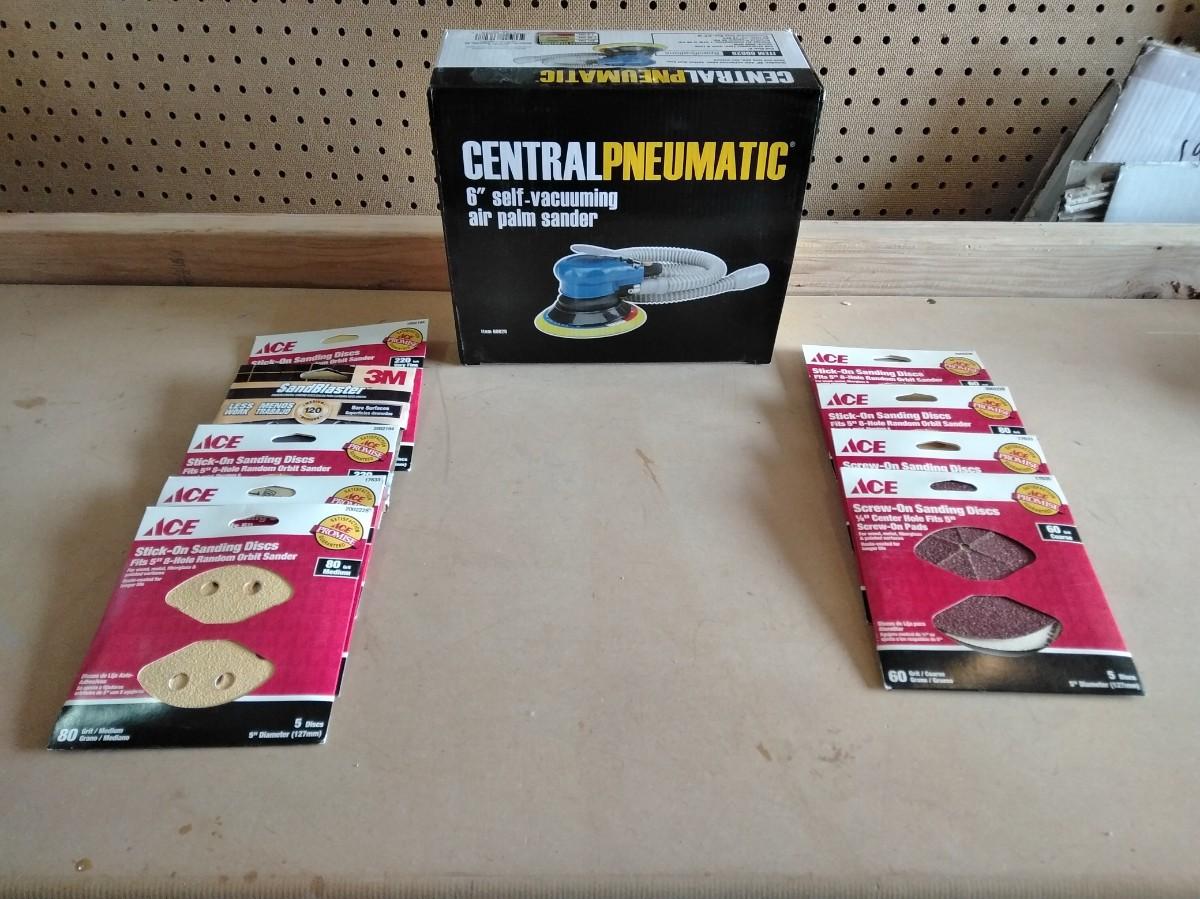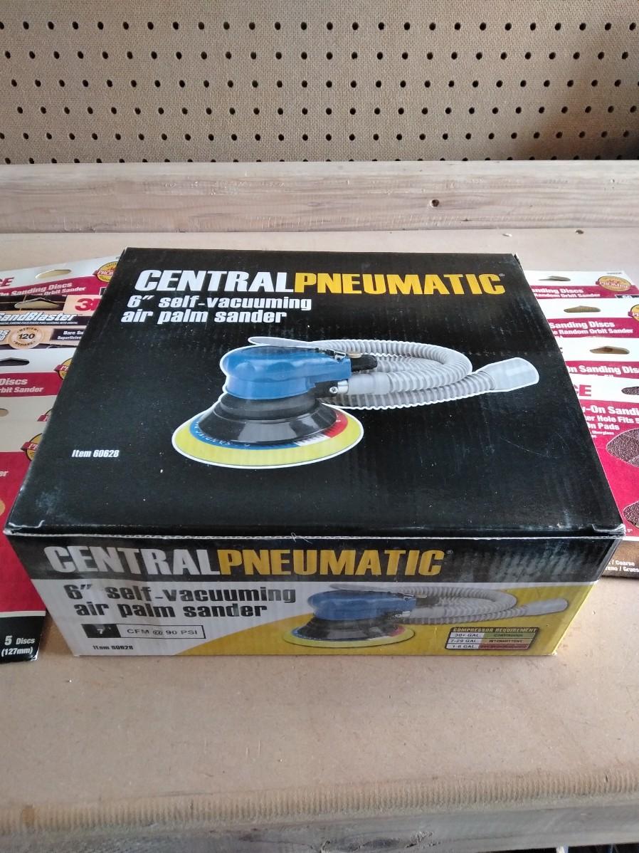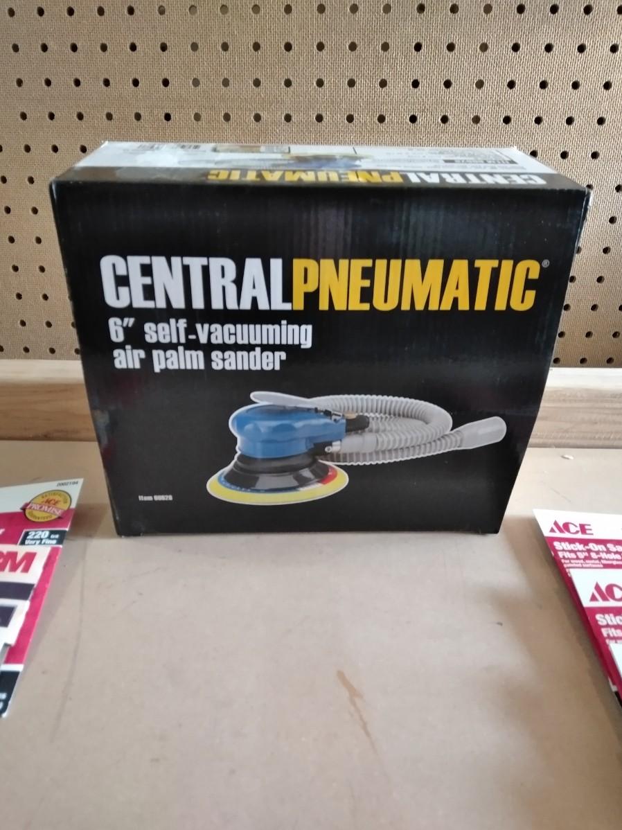 CENTRAL PNEUMATIC SELF VACUUMING 6" AIR PALM SANDER AND SANDPAPER