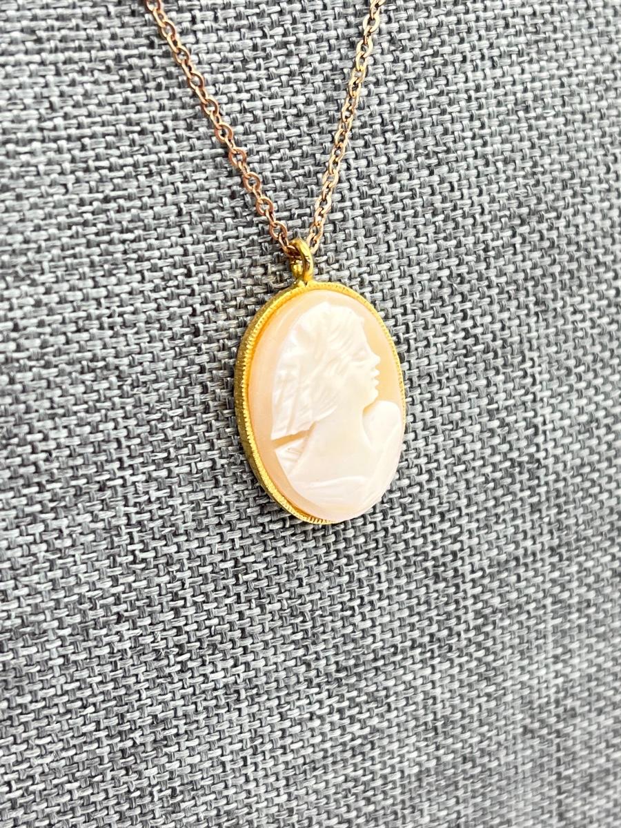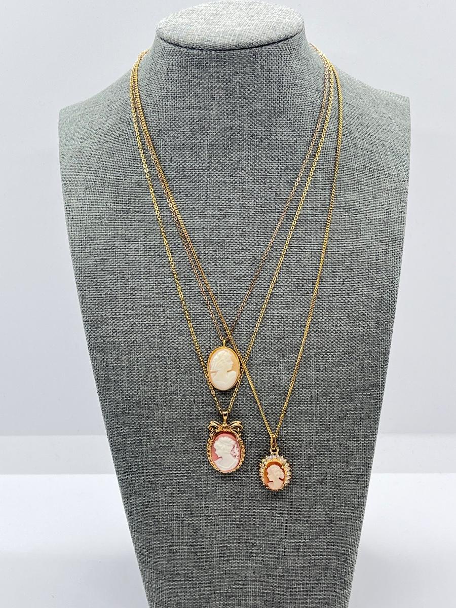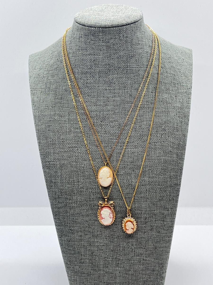 LOT 213: Three Small Cameo Pendants on Thin Goldtone Chains