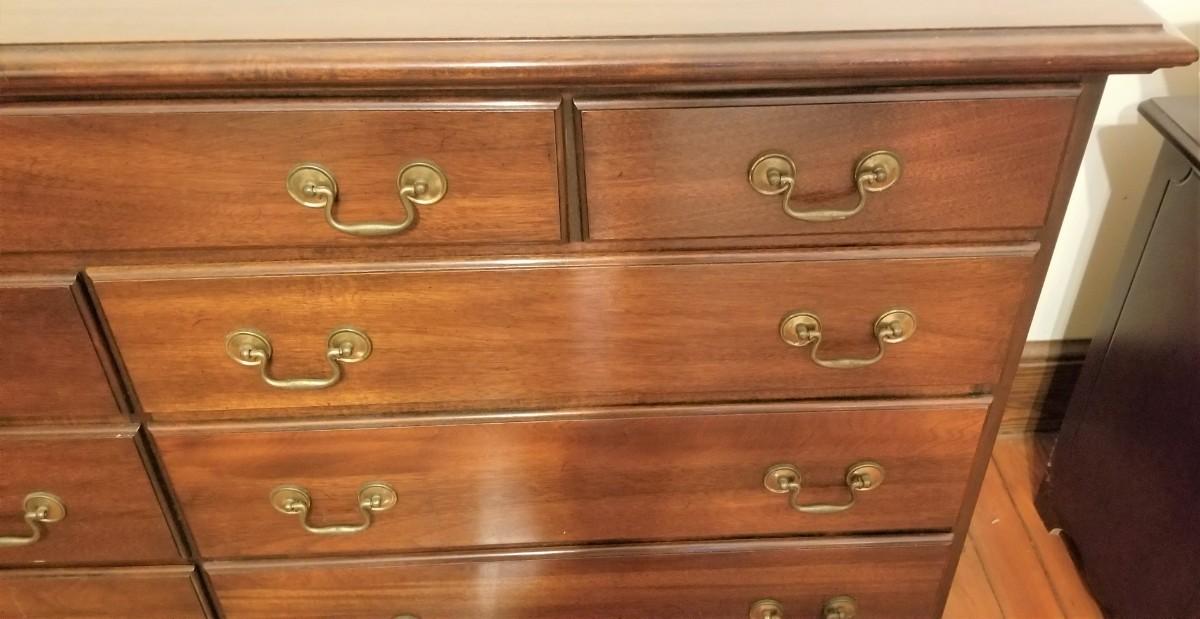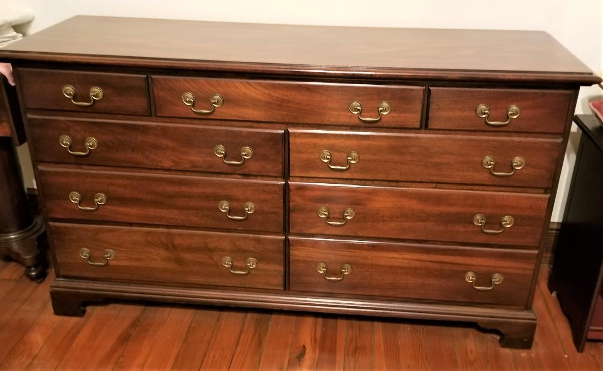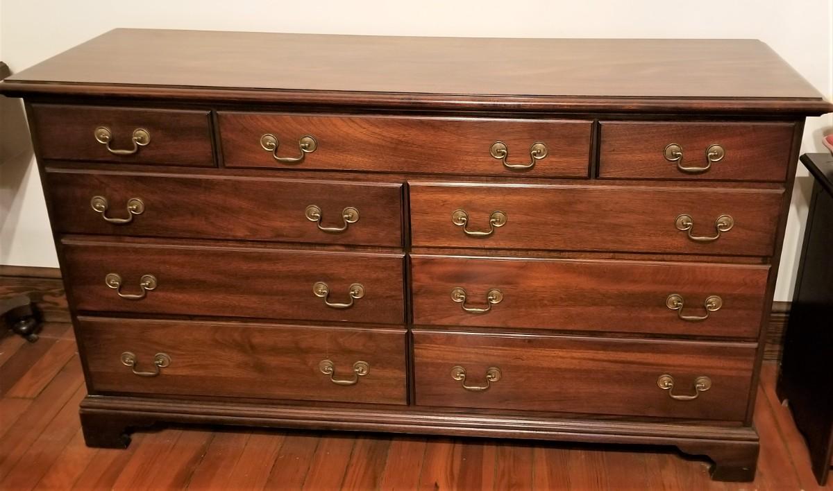 This 9 drawer chest is well made and in good used condition. Lots of storage here - use in a bedroom or as a sideboard. 19.5" deep, 61" across, 34.5" tall.