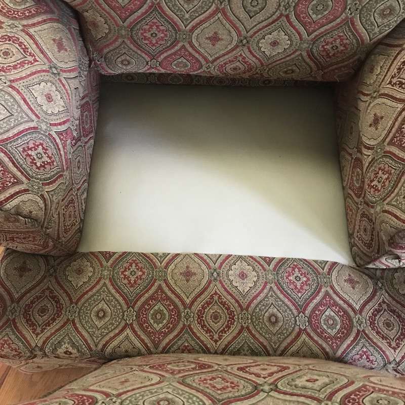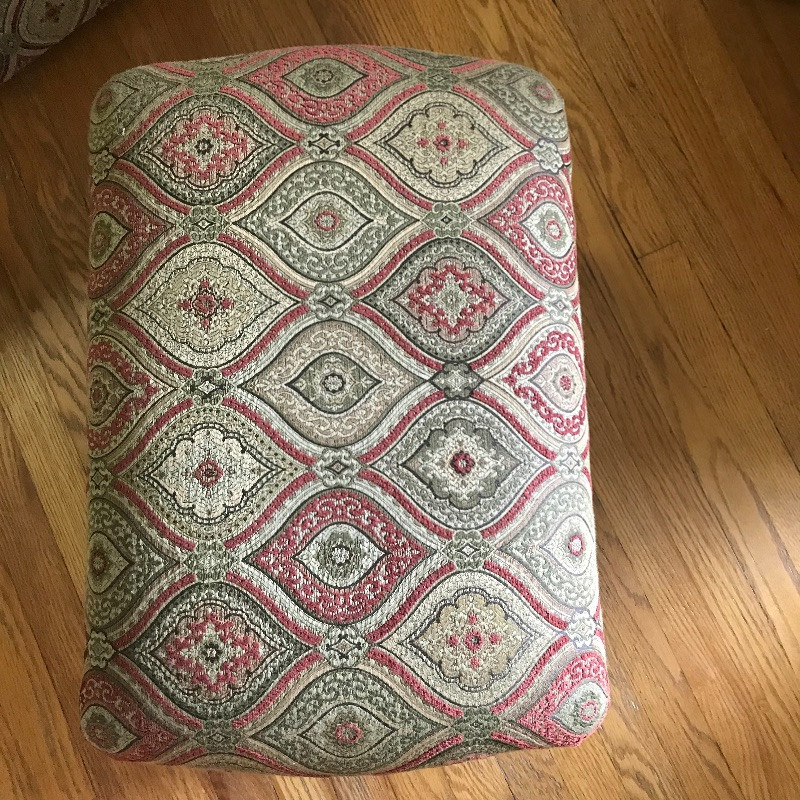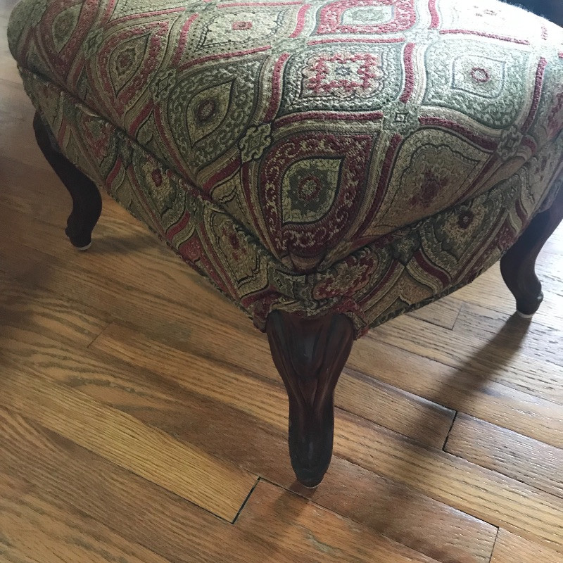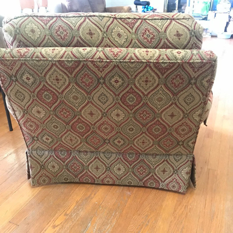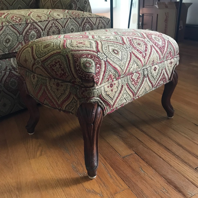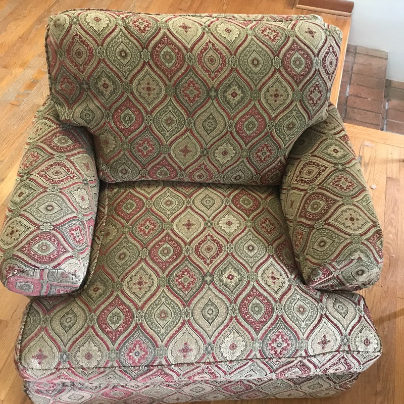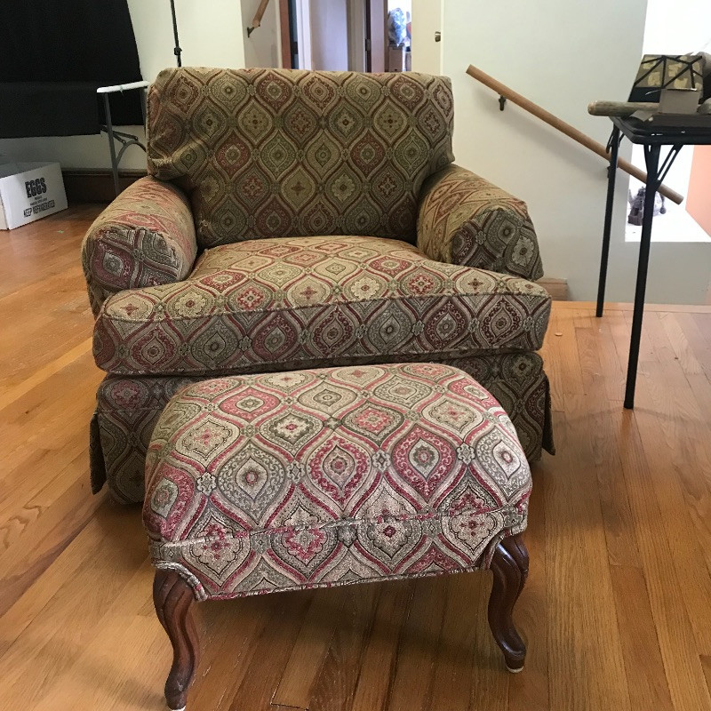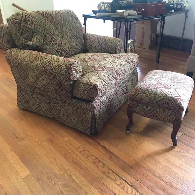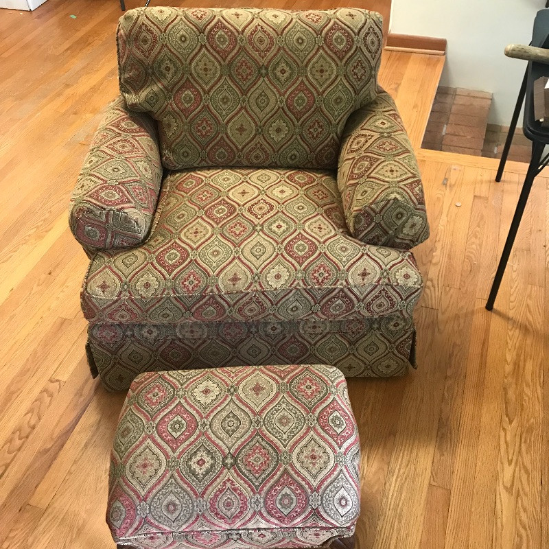 This lovely set is in great condition and comfortable. Colts are olive, brick, tan and gold. No manufacturer name. Chair measures 36” x38” x29” and wooden footed ottoman measures 22” x15” x14”. This set matches the set in Lot #215. Local pick up only.
