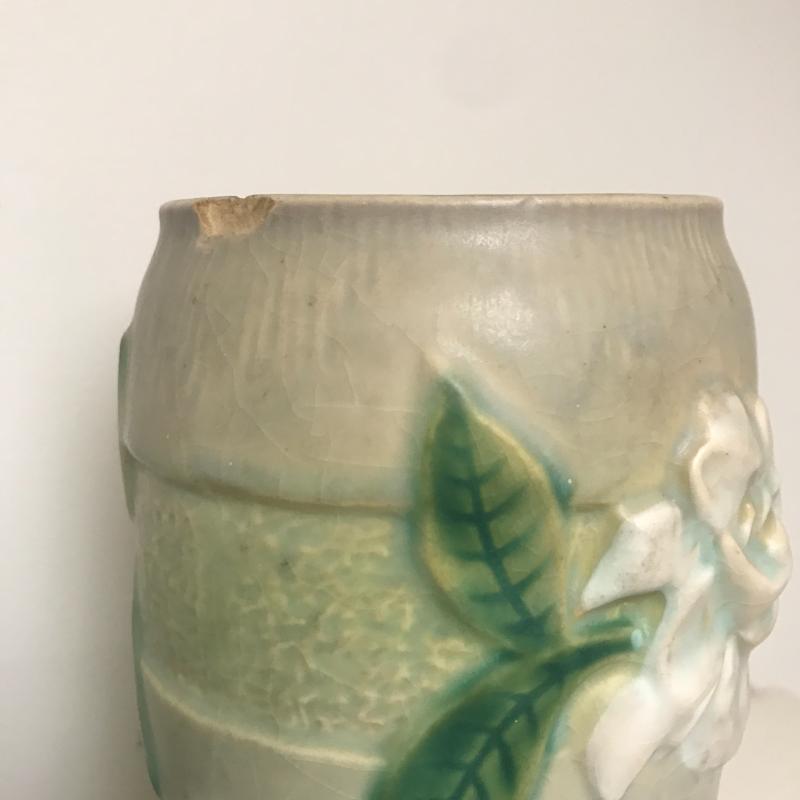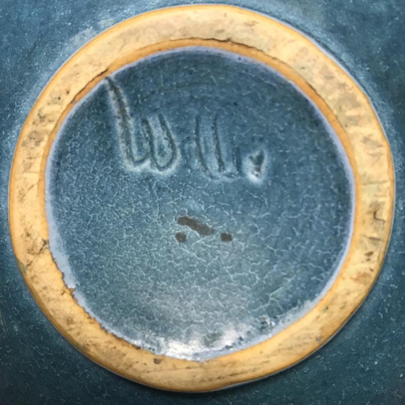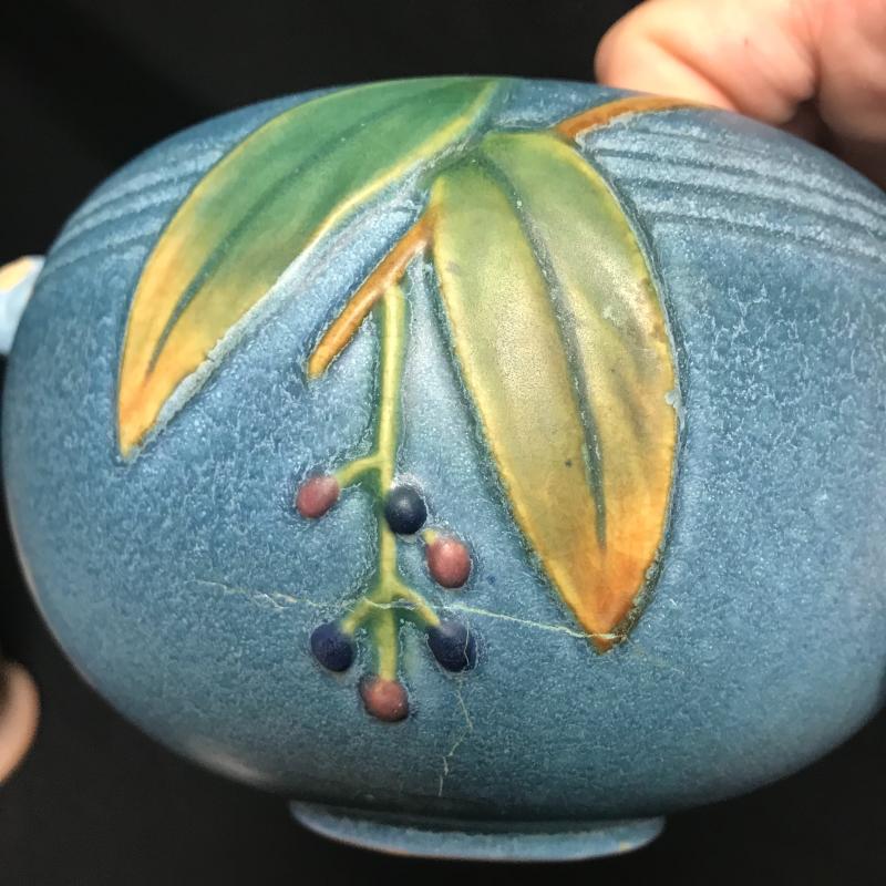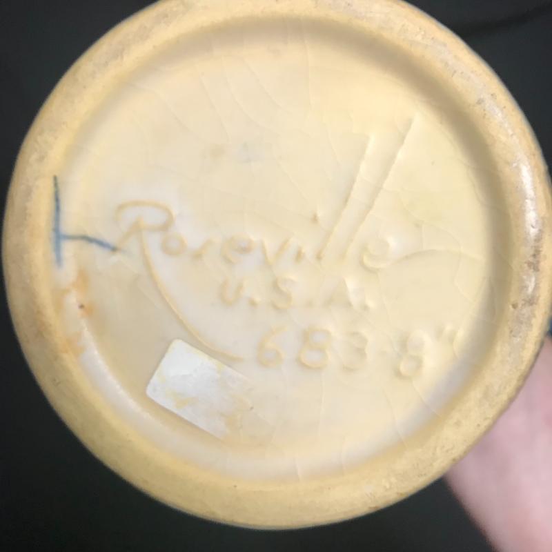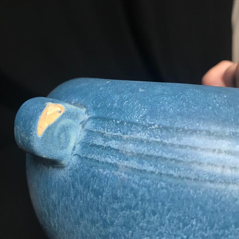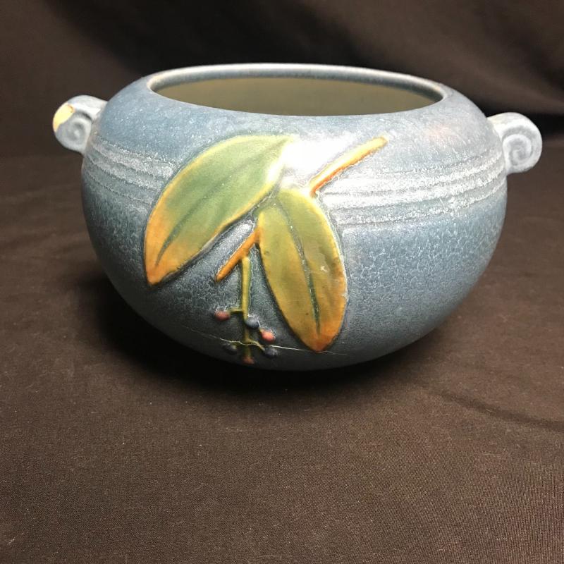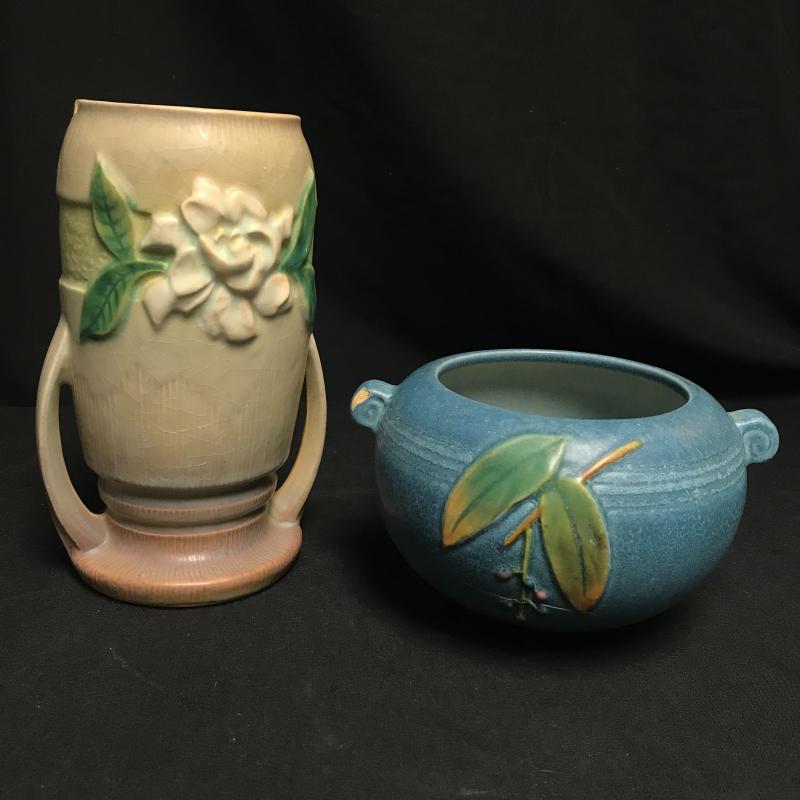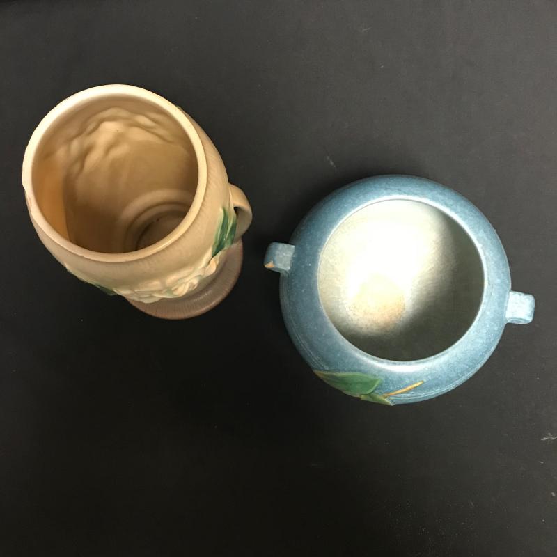 Tall Roseville piece measures 8” x5” and blue piece is signed and measures 7” x4”. Each has one chip but overall good condition. Shipping available.