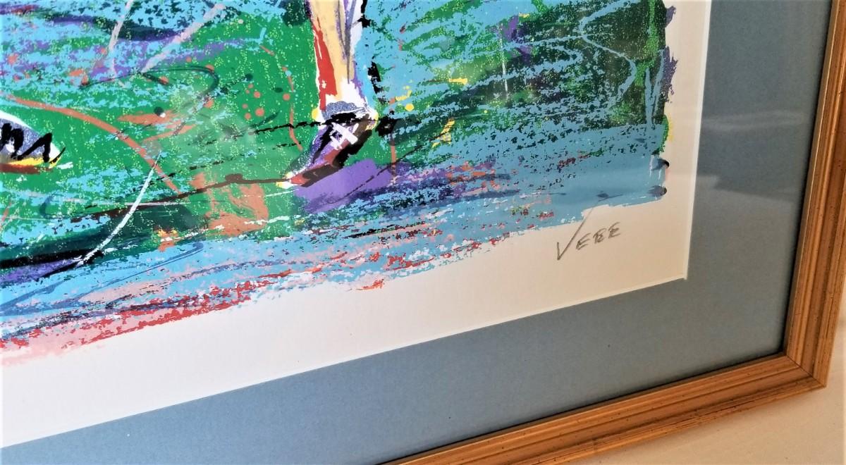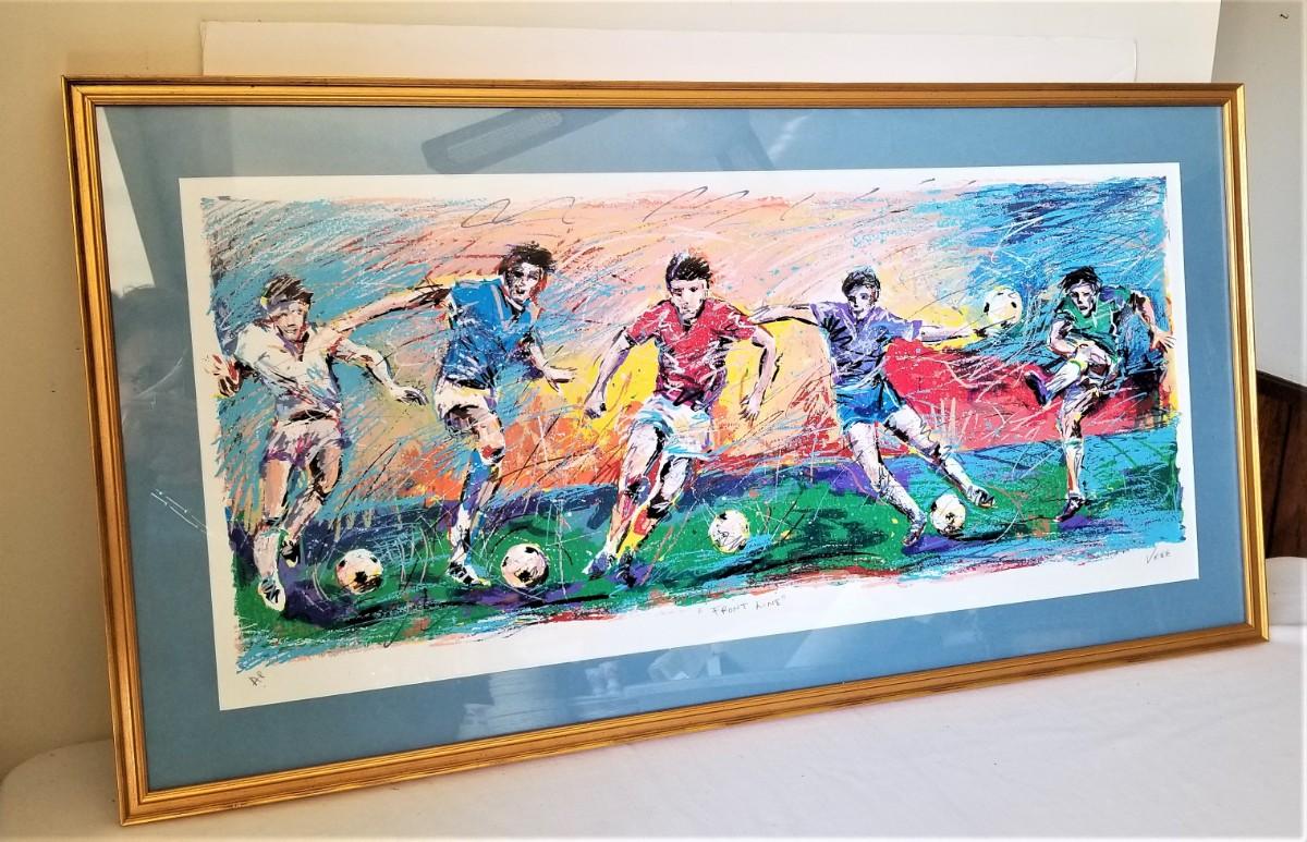 Another great framed print by Juli Veee - Hungarian/American Soccer Star - this one is an Artist's Proof entitled "Front Line." Well framed - 36" across, 19" tall. We offered another one of his prints in Lot #198. Good condition.