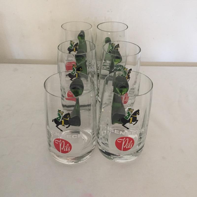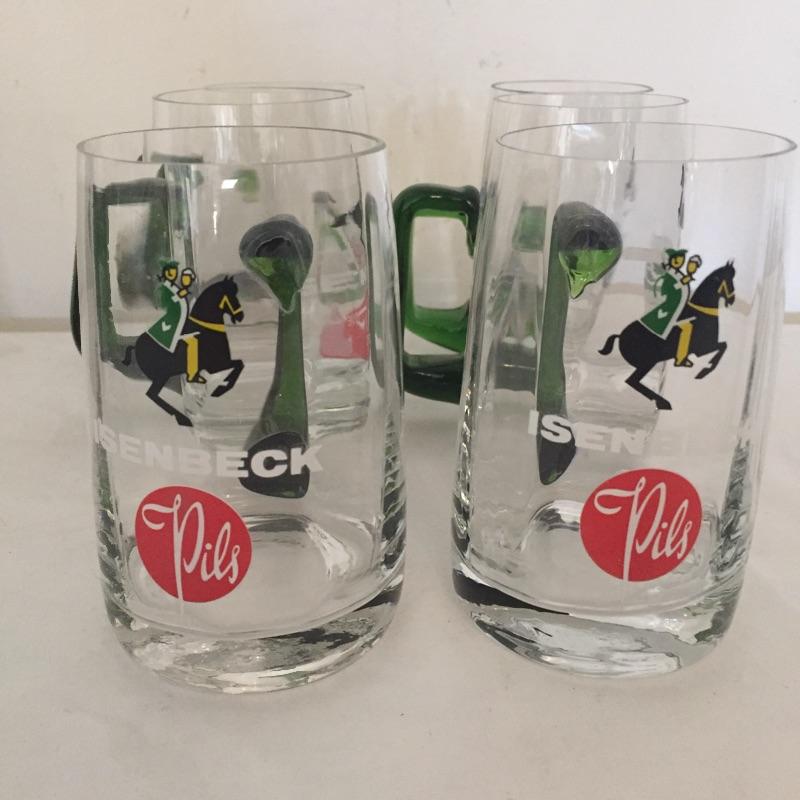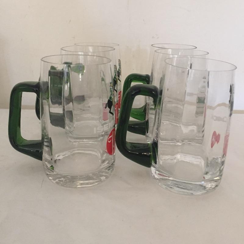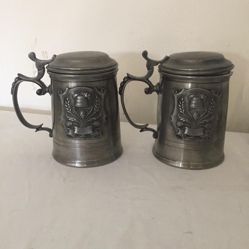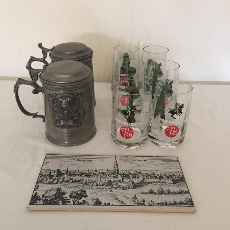 Pair of steins with six glass mugs and one decorative tile. You will be ready for spring with this lot of steins and mugs. Steins measure 5.5” tall.