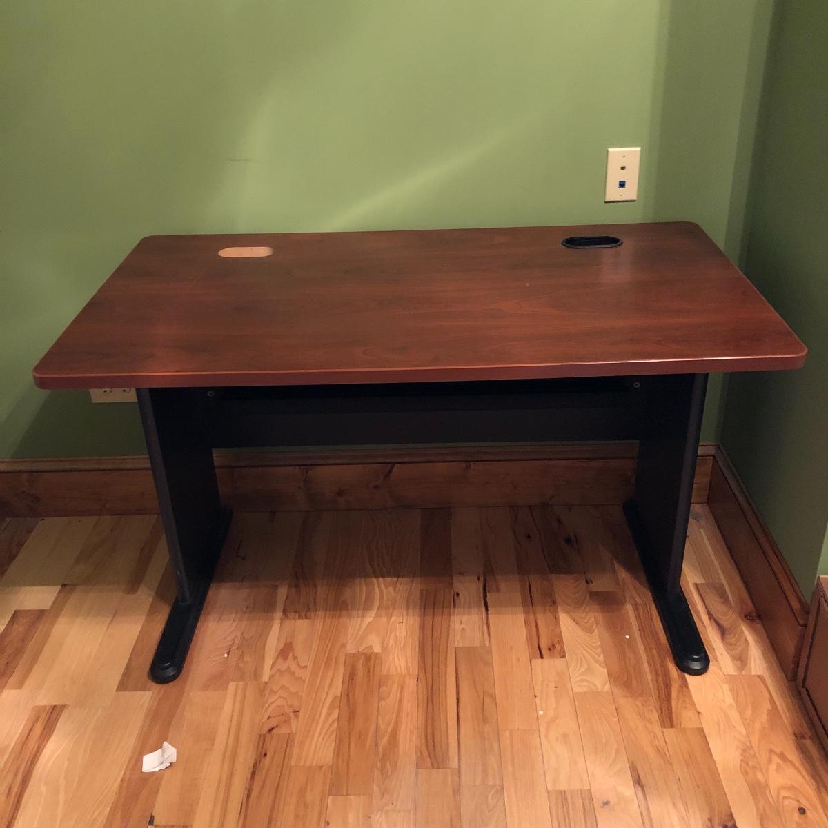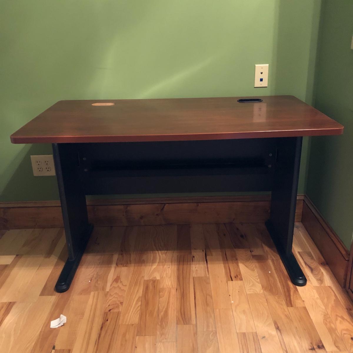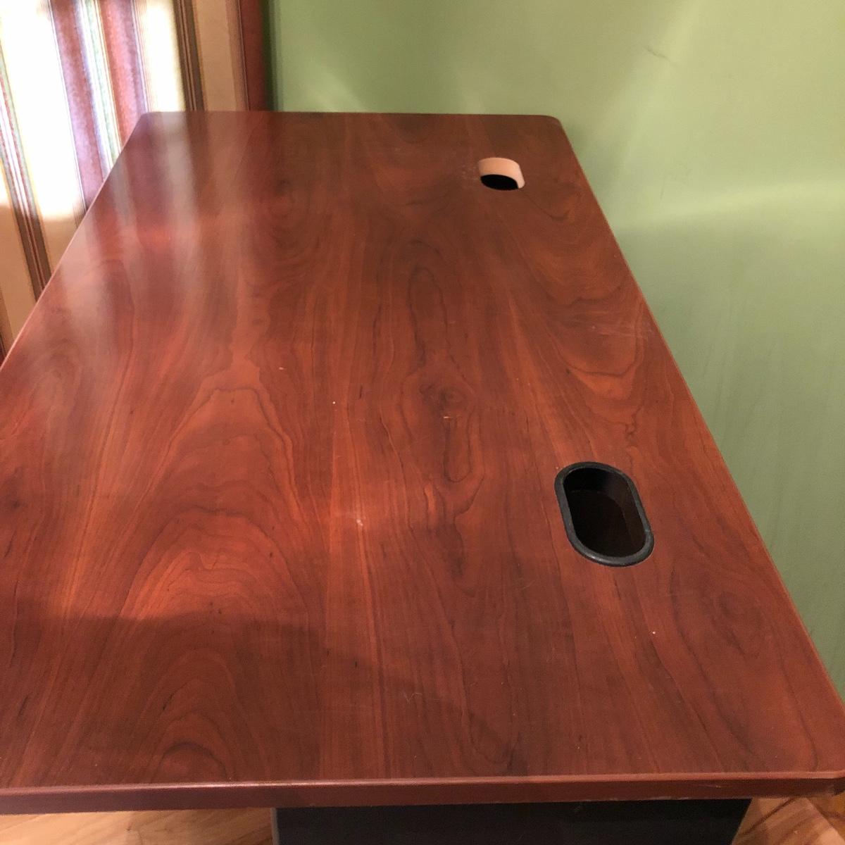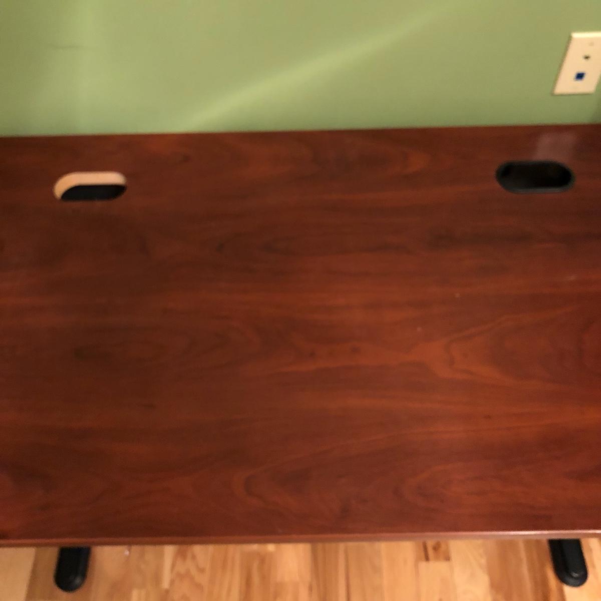 The desk has two openings for cables and cords to pass through and a plastic tray underneath to keep the wires hidden. Table has a laminated top with some scratches and one hole is missing the plastic surround. Desk measures 27” x 47.5” x 30”.