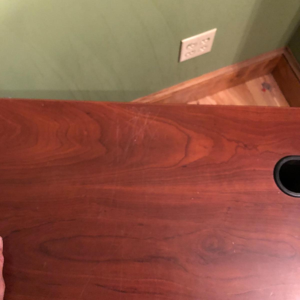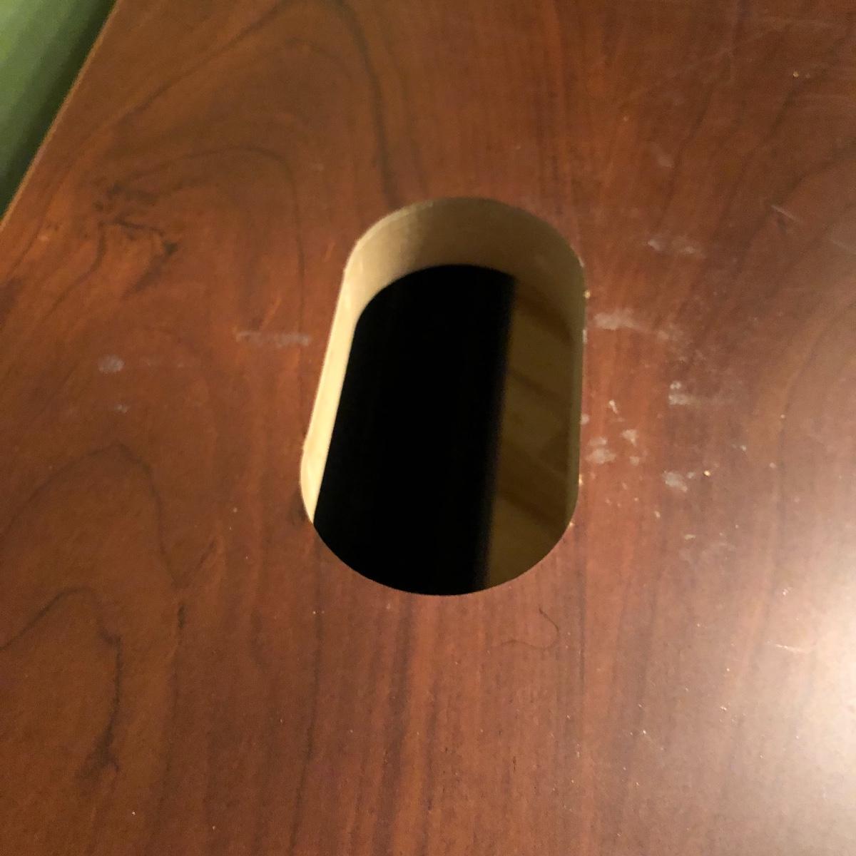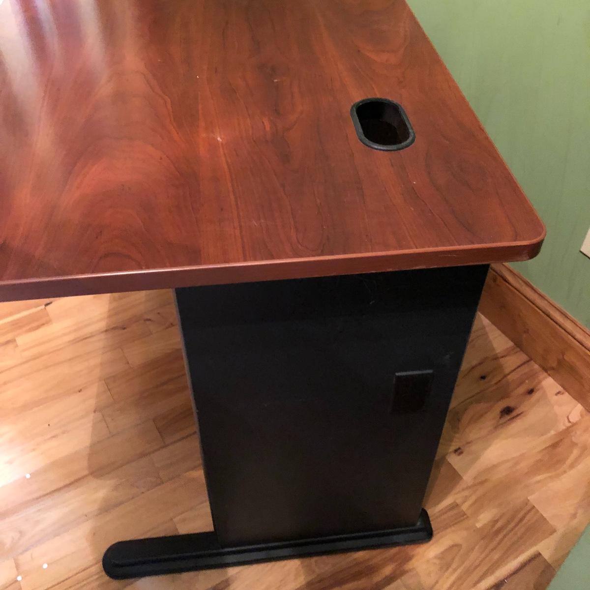 The desk has two openings for cables and cords to pass through and a plastic tray underneath to keep the wires hidden. Table has a laminated top with some scratches and one hole is missing the plastic surround. Desk measures 27” x 47.5” x 30”.