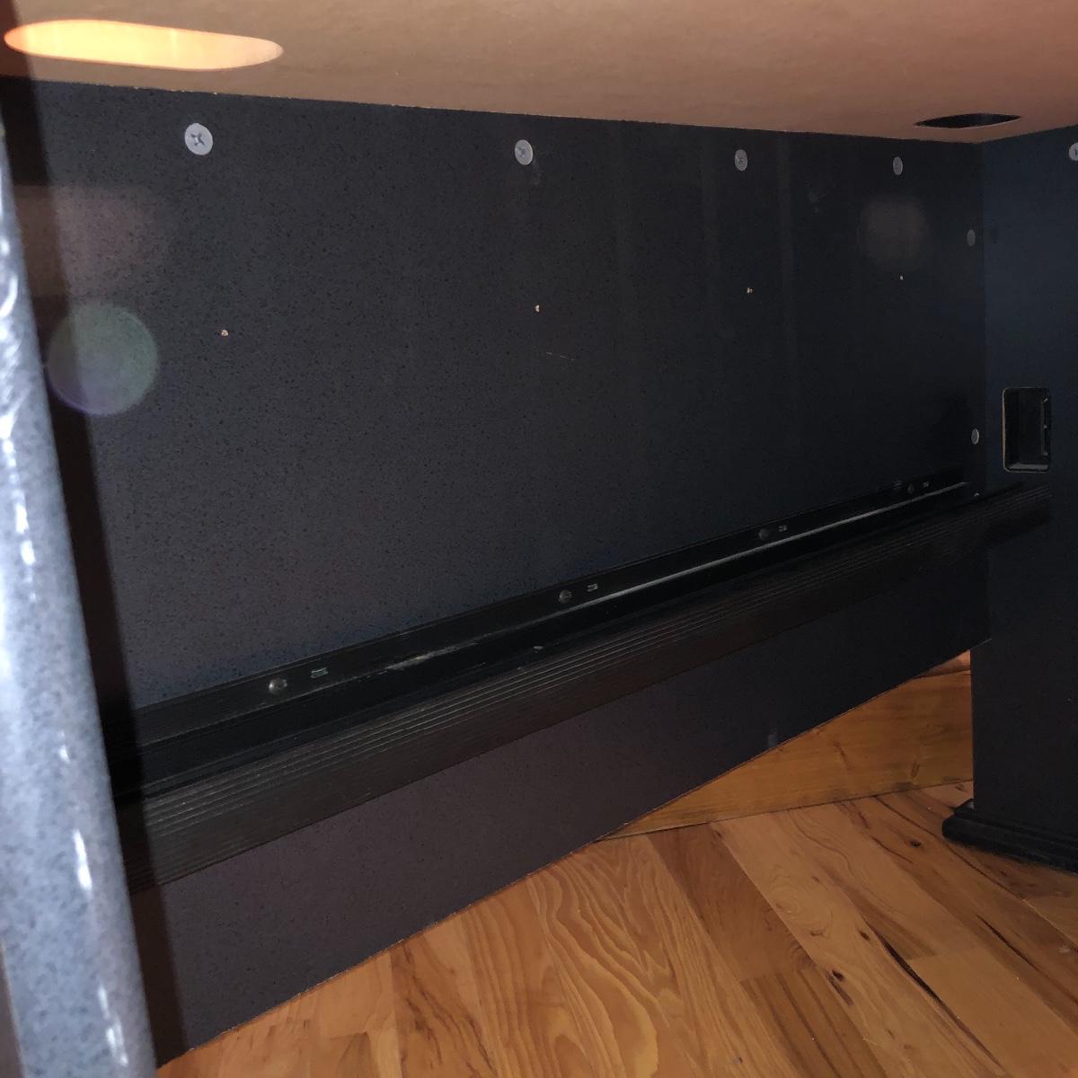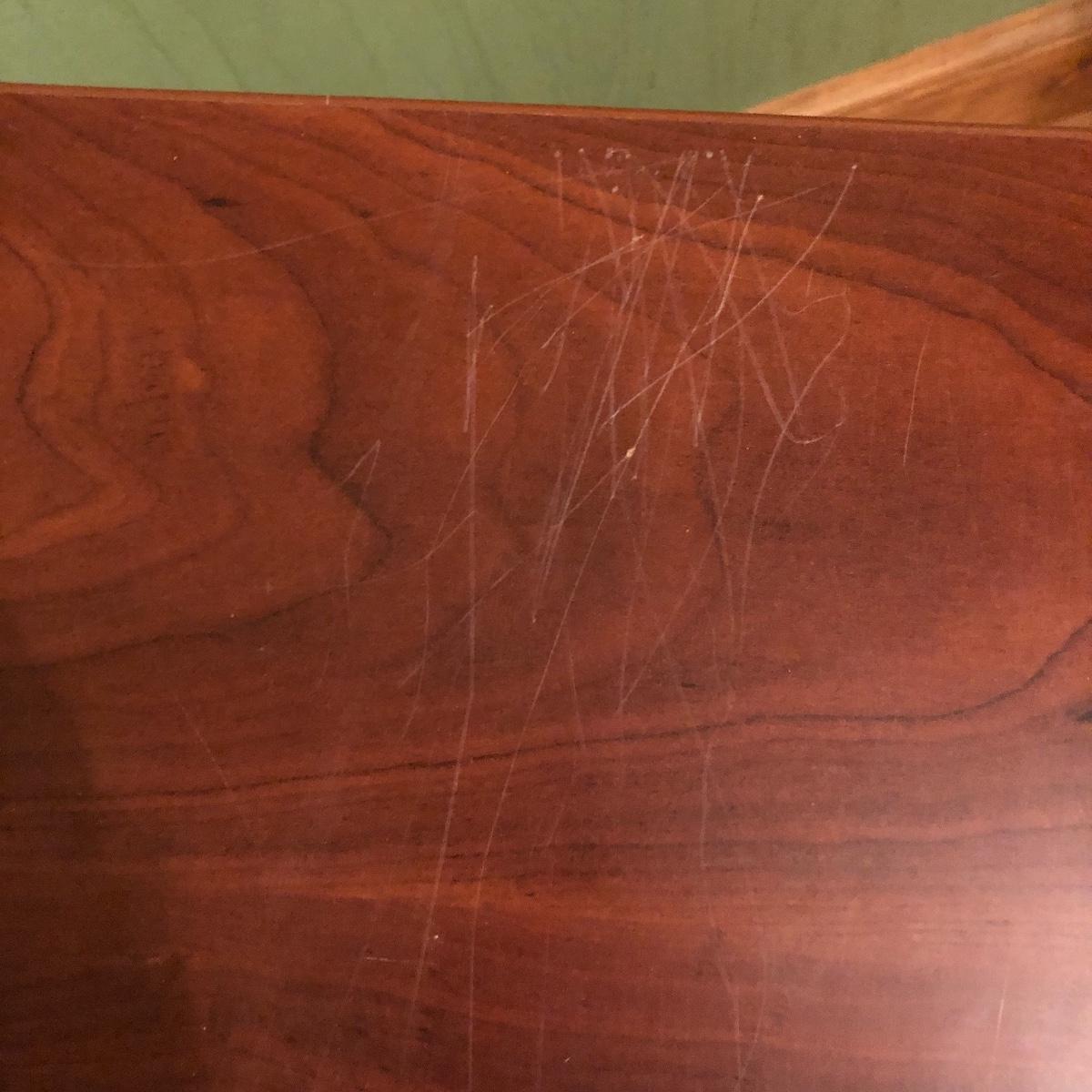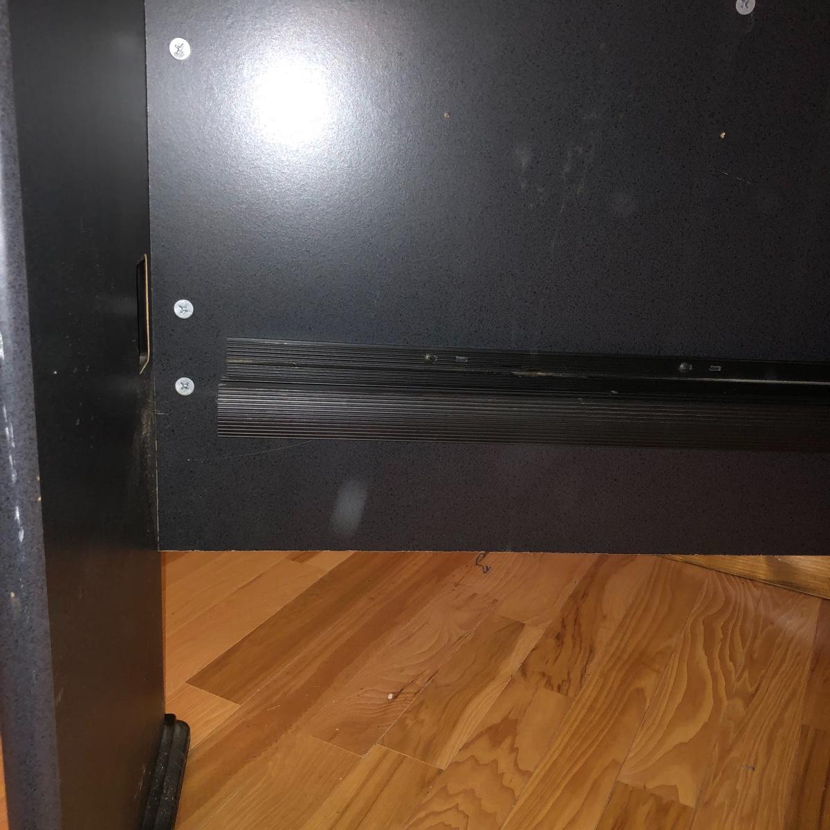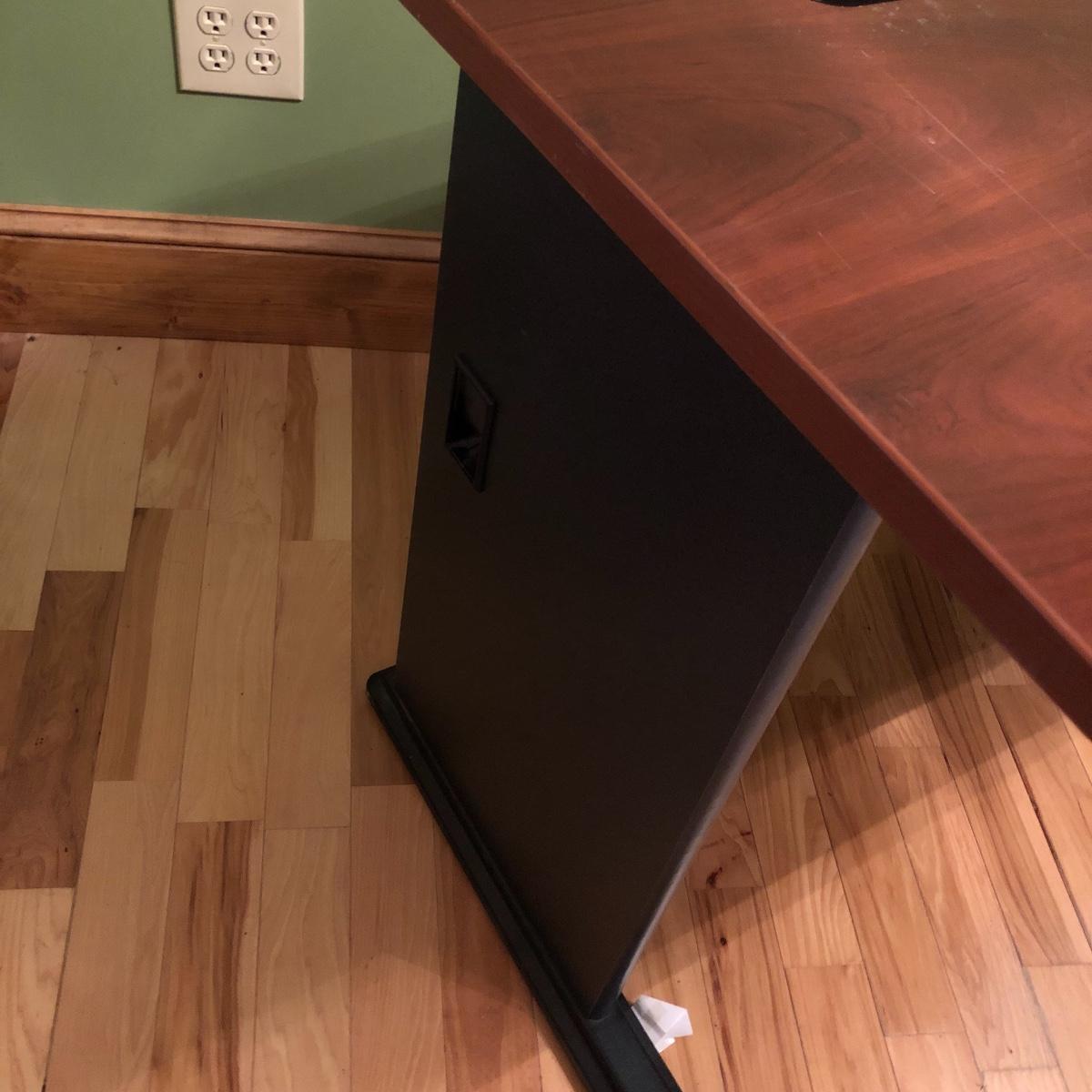 The desk has two openings for cables and cords to pass through and a plastic tray underneath to keep the wires hidden. Table has a laminated top with some scratches and one hole is missing the plastic surround. Desk measures 27” x 47.5” x 30”.