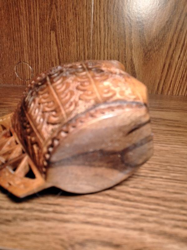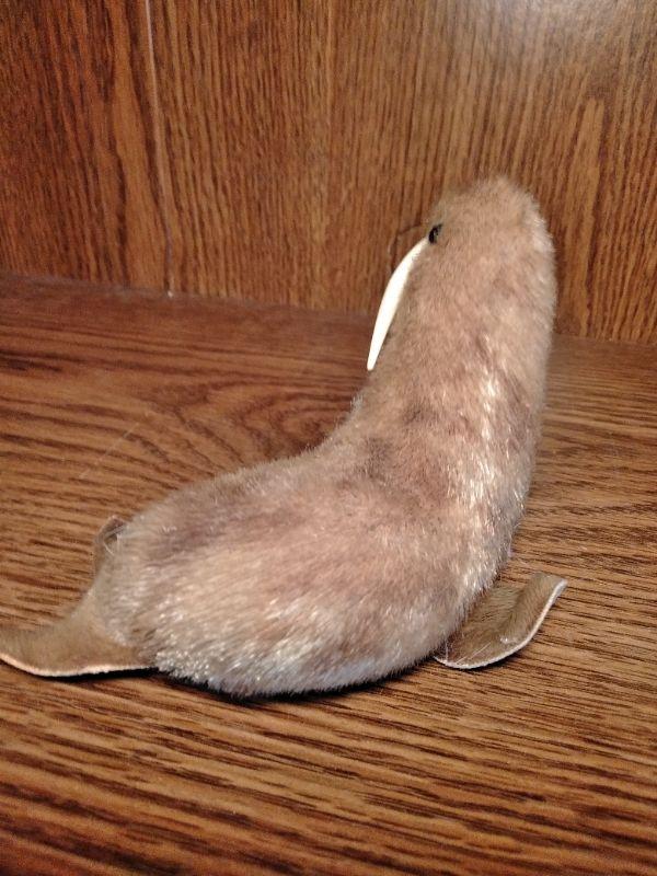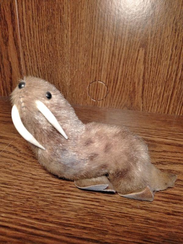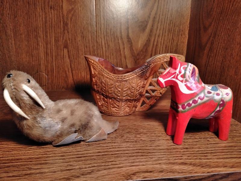 FUR WALRUS WITH TUSKS, WOOD CARVED SMALL PITCHER CARVED IN AFRICA, AND A NILS OLSSON WOODEN HORSE.