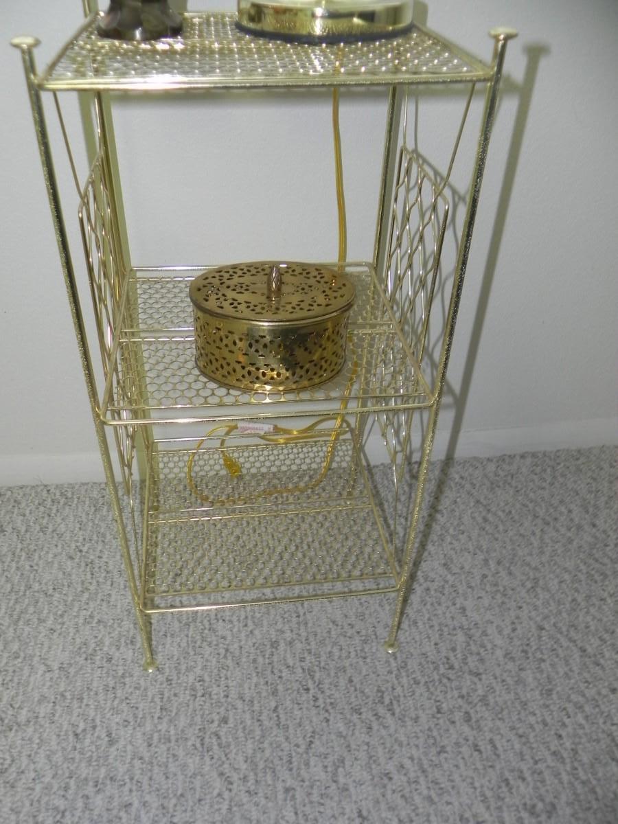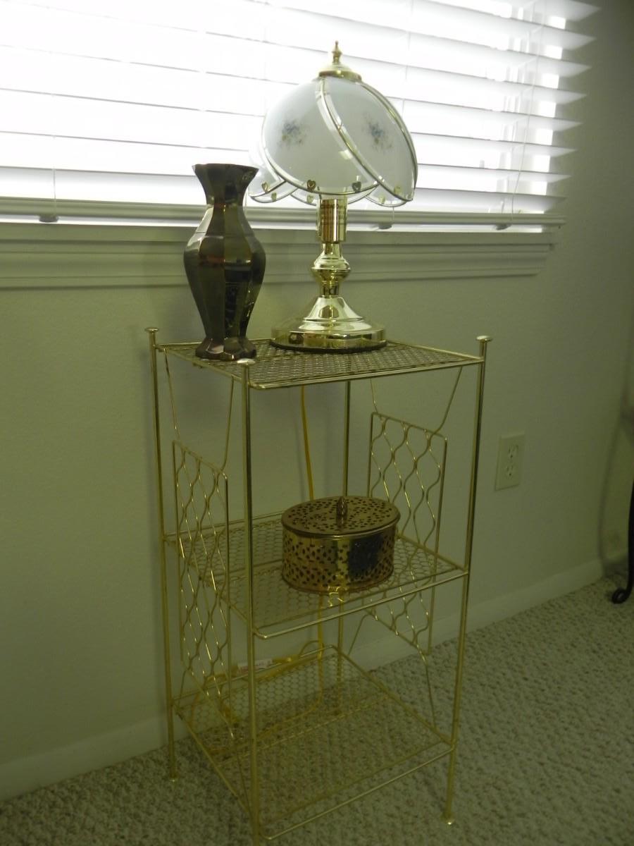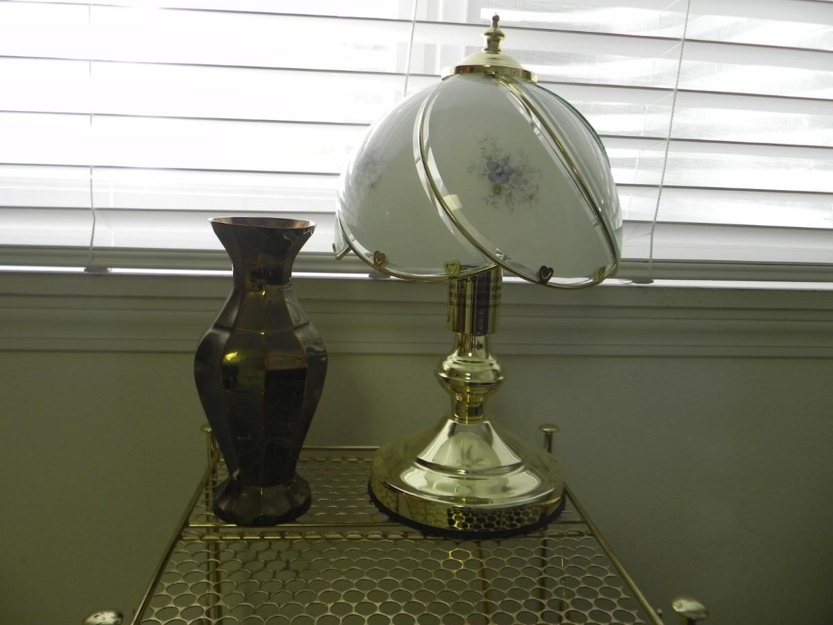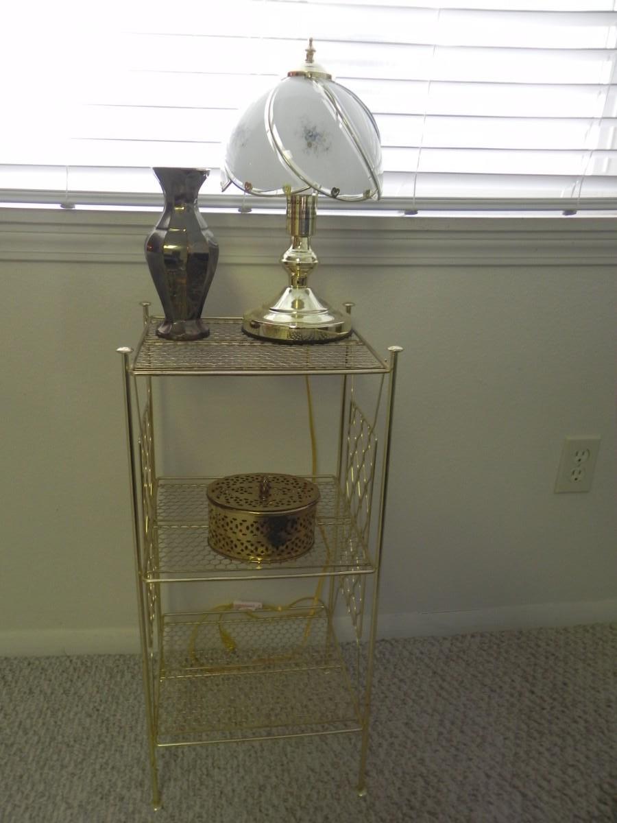 3 SHELF STAND 12X12X16 BRASS VASE AND TOUCH LAMP