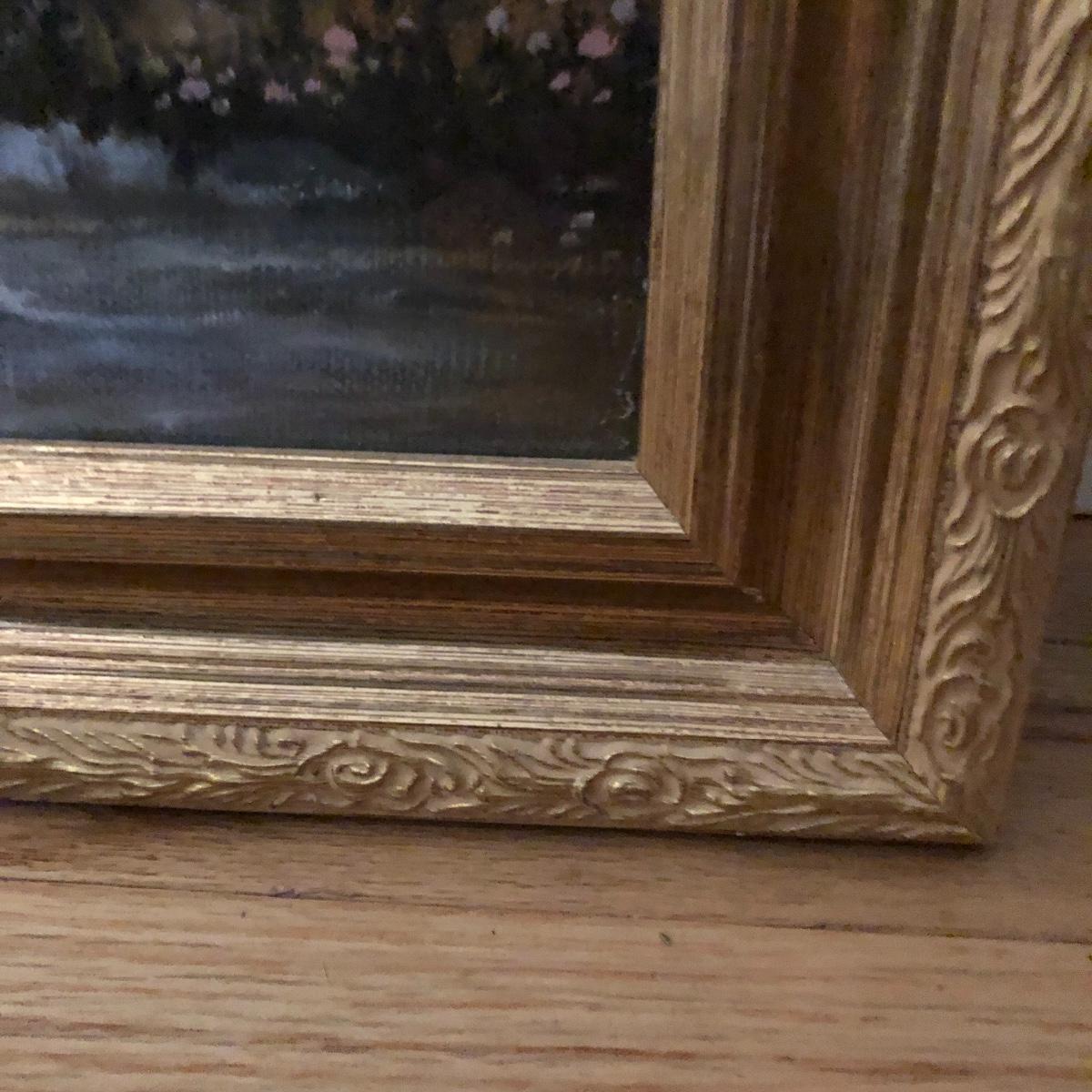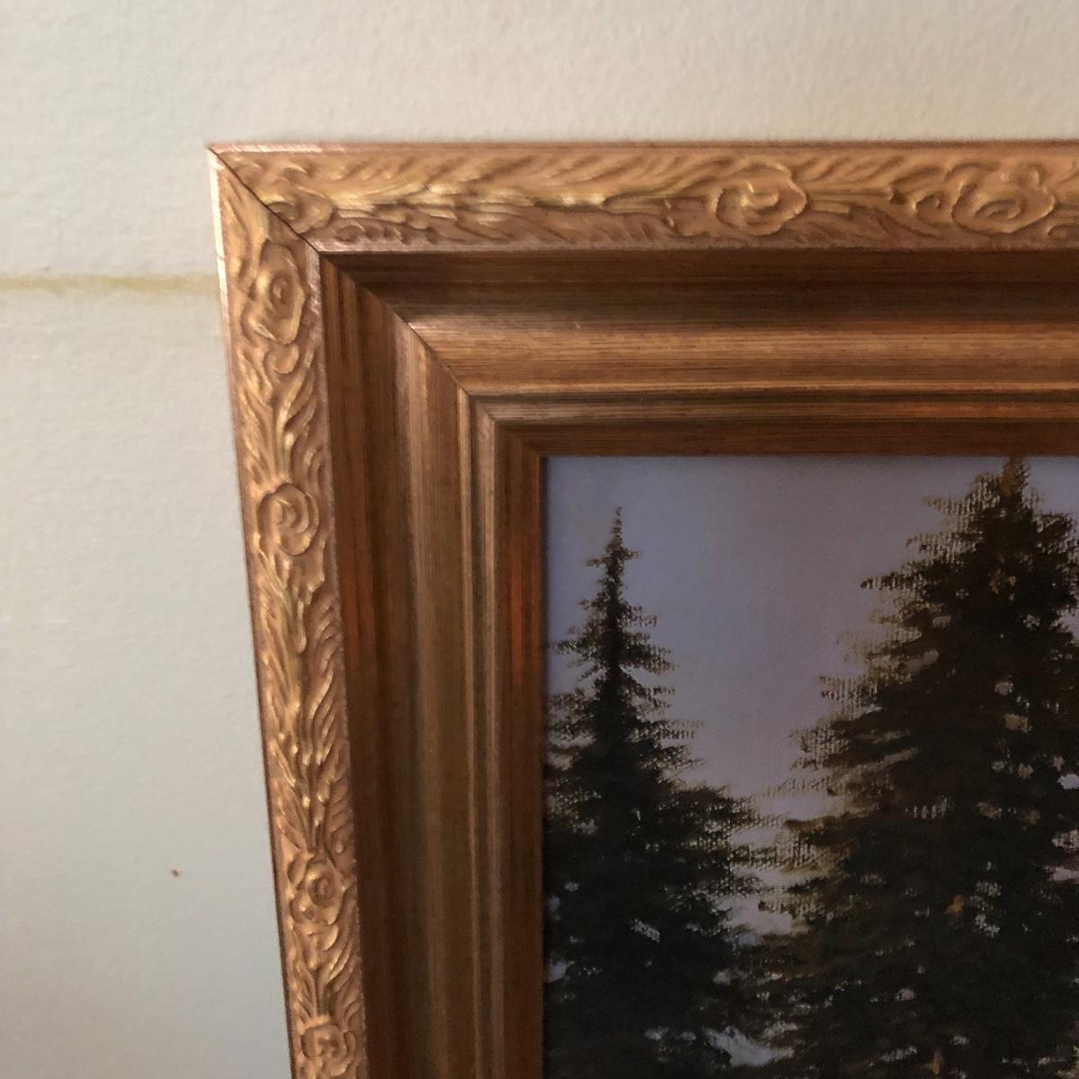A lovely framed print of a waterfall in the mountains by Larry Prellop. Has a ornate gold colored frame.Frame measures 26.5” x 32.5”.