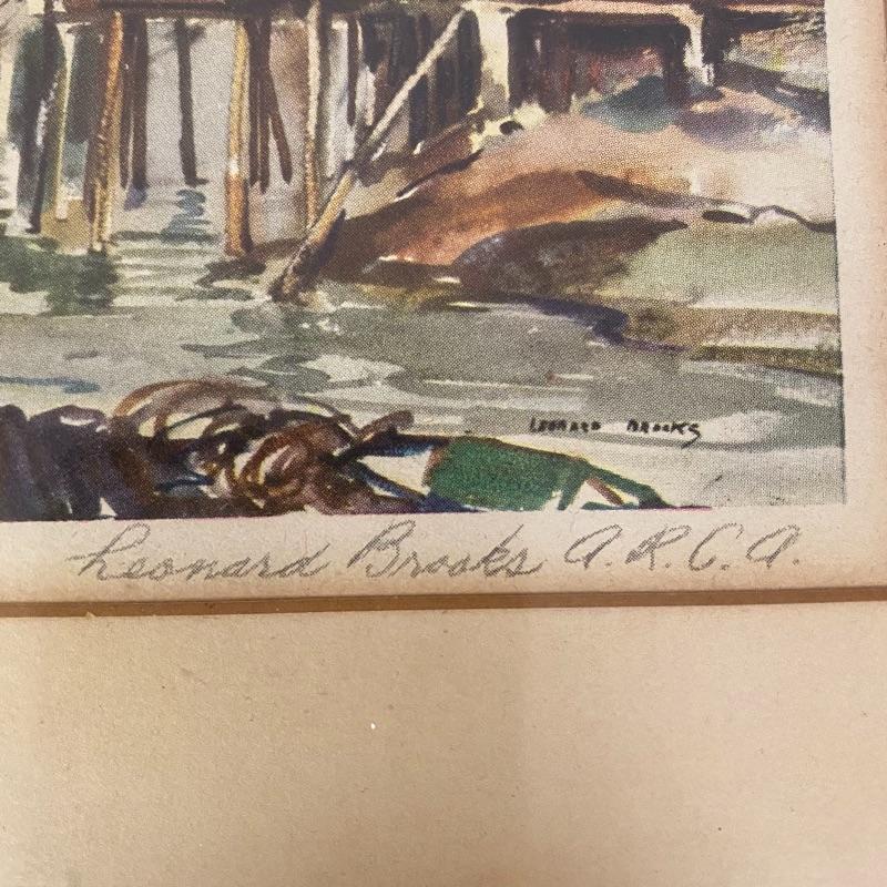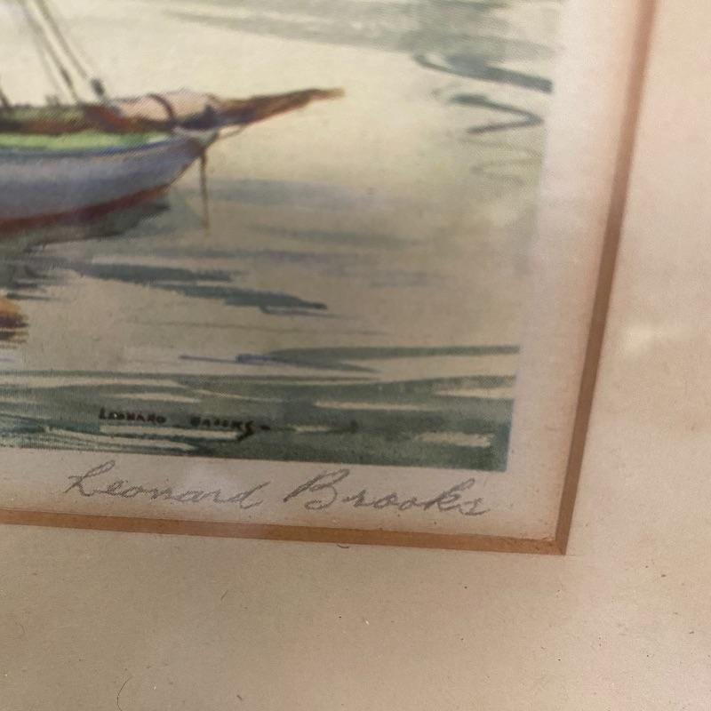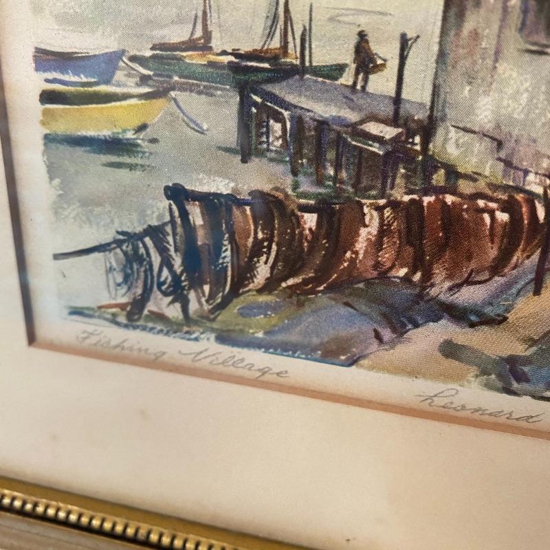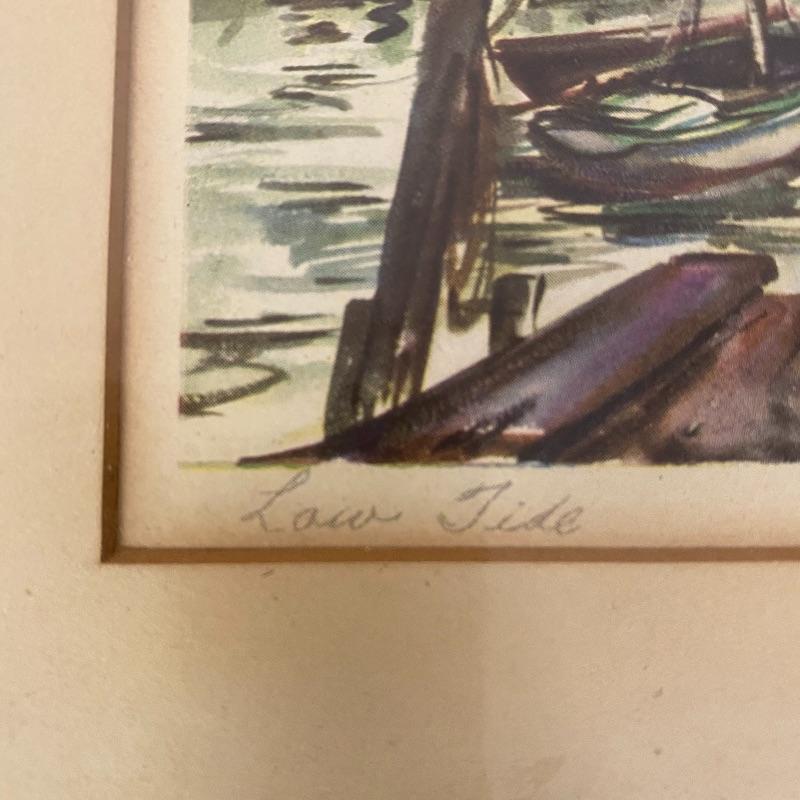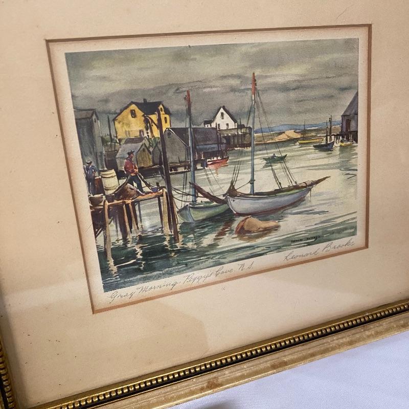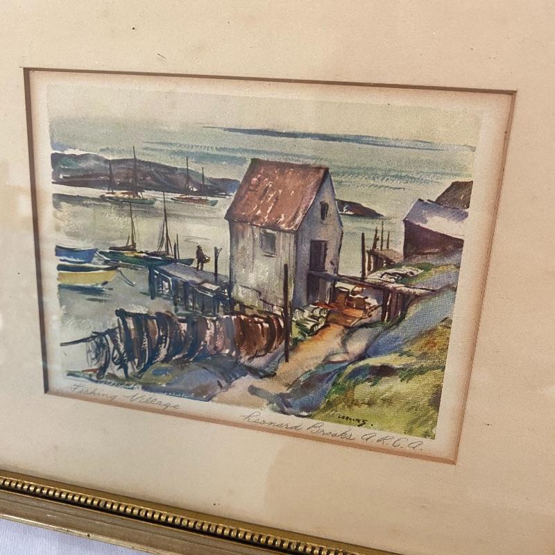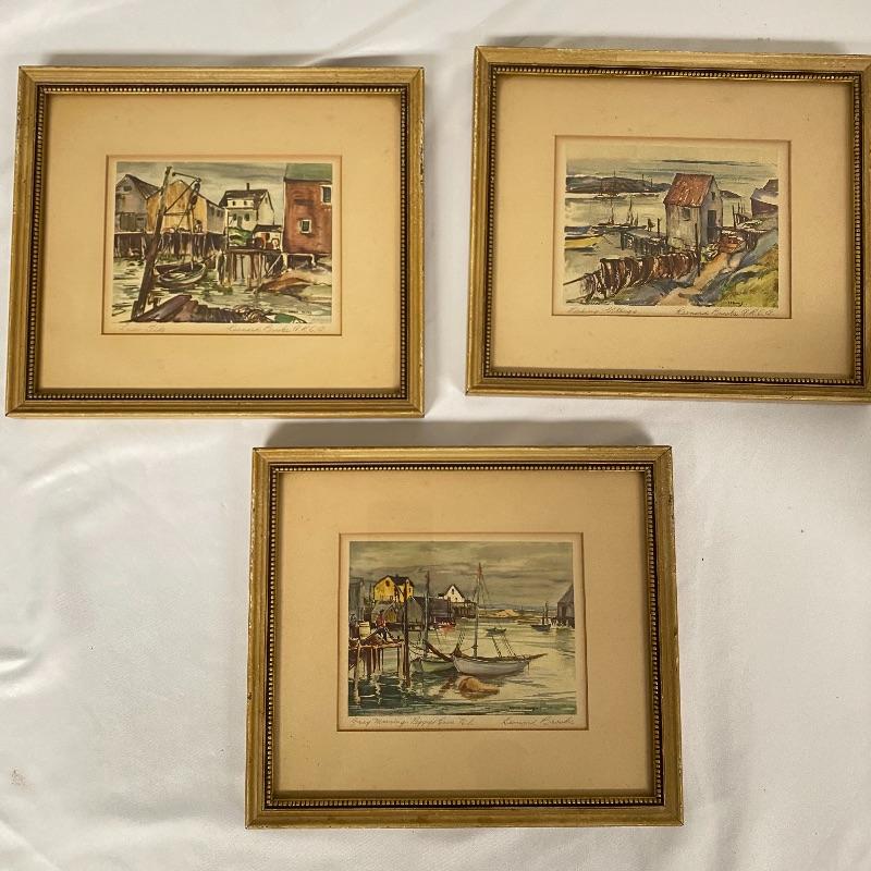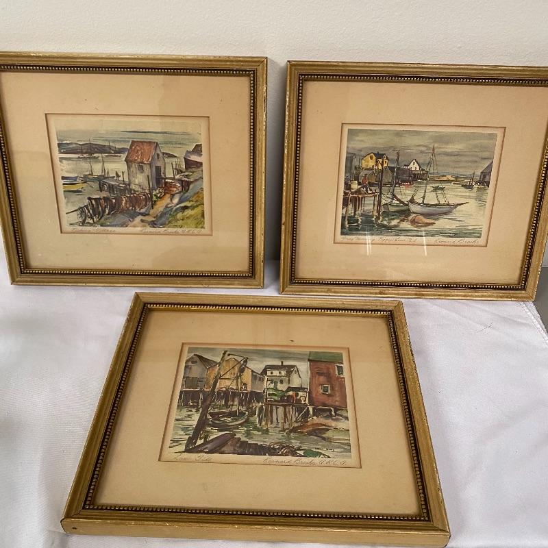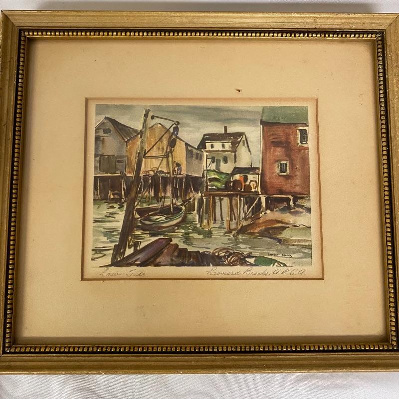 Sweet trio of signed prints by Leonard Brooks. Nice waterfront scenes. Three matching gold frames make them easy to hang together. Includes “Low Tide”, “Gray Morning”, and “Fishing Village”. All measure the same at 9.5” x 8”. Shipping available