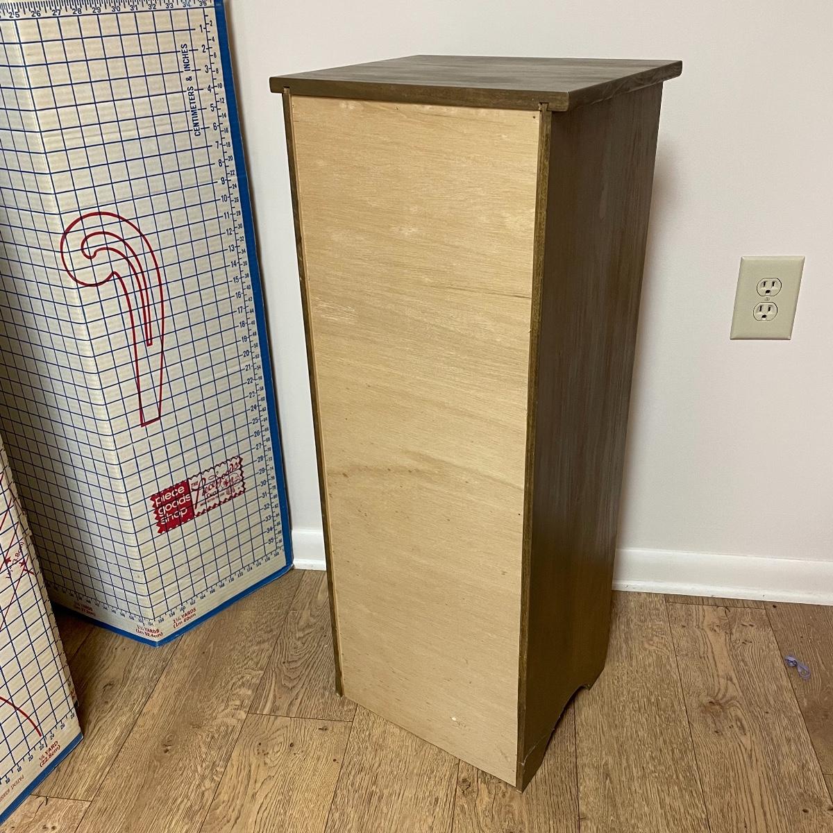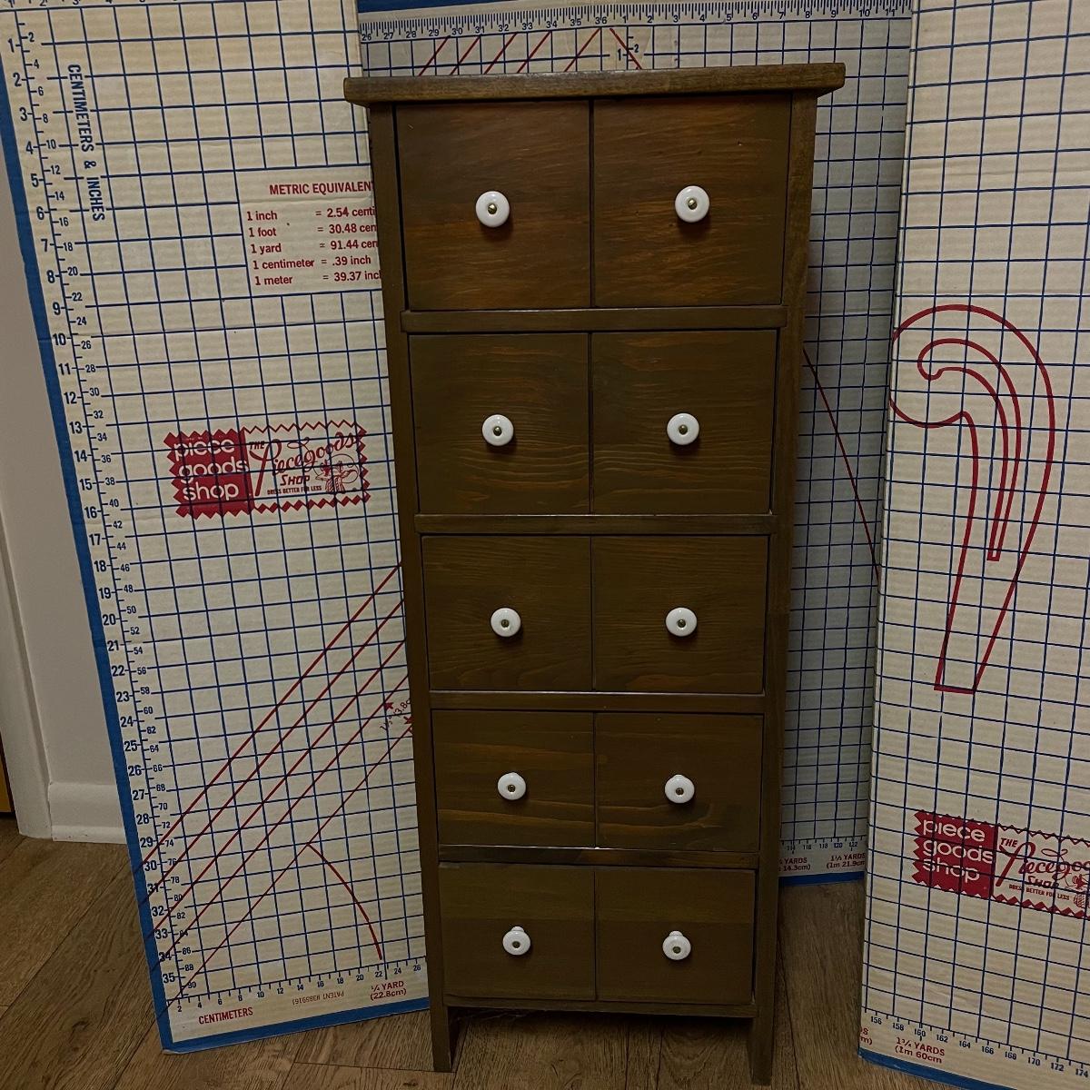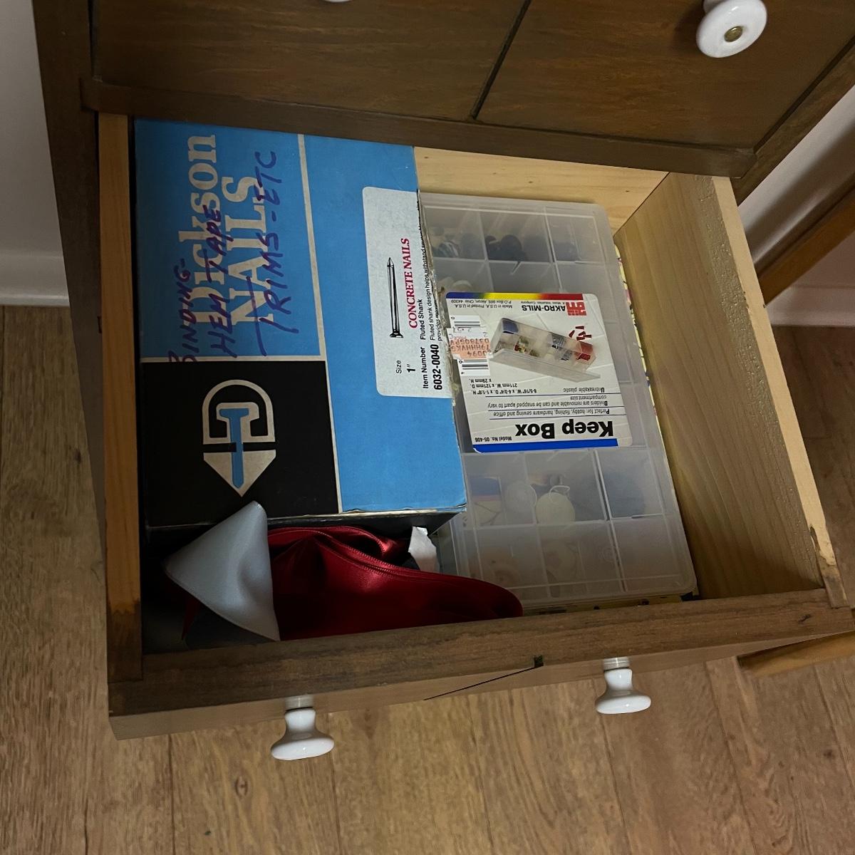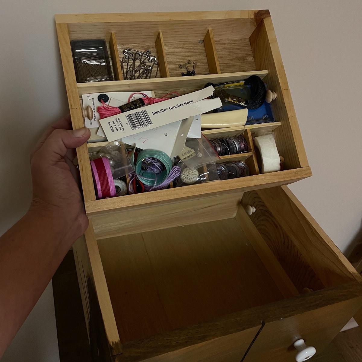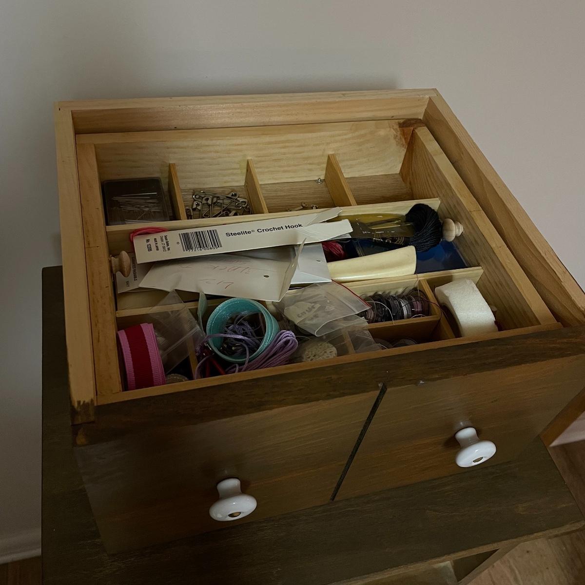 Sew many sewing supplies! Lot starts off with a five drawer chest, each containing sewing supplies in a mostly organized fashion. Supplies include patterns (we did not verify contents), thread, needles, pins, buttons, fasteners and more! The chest appears to be a sturdy, hand made mix of pressed and solid wood. It measures 14.25” x 11.5” x 36”. The top drawer has an organizer that pulls out to reveal the lower part of the drawer. Lastly lot features a sturdy cardboard cutting board with dimensions up to 36”sq. See images. Local pick up only.