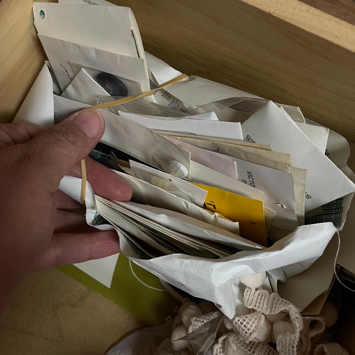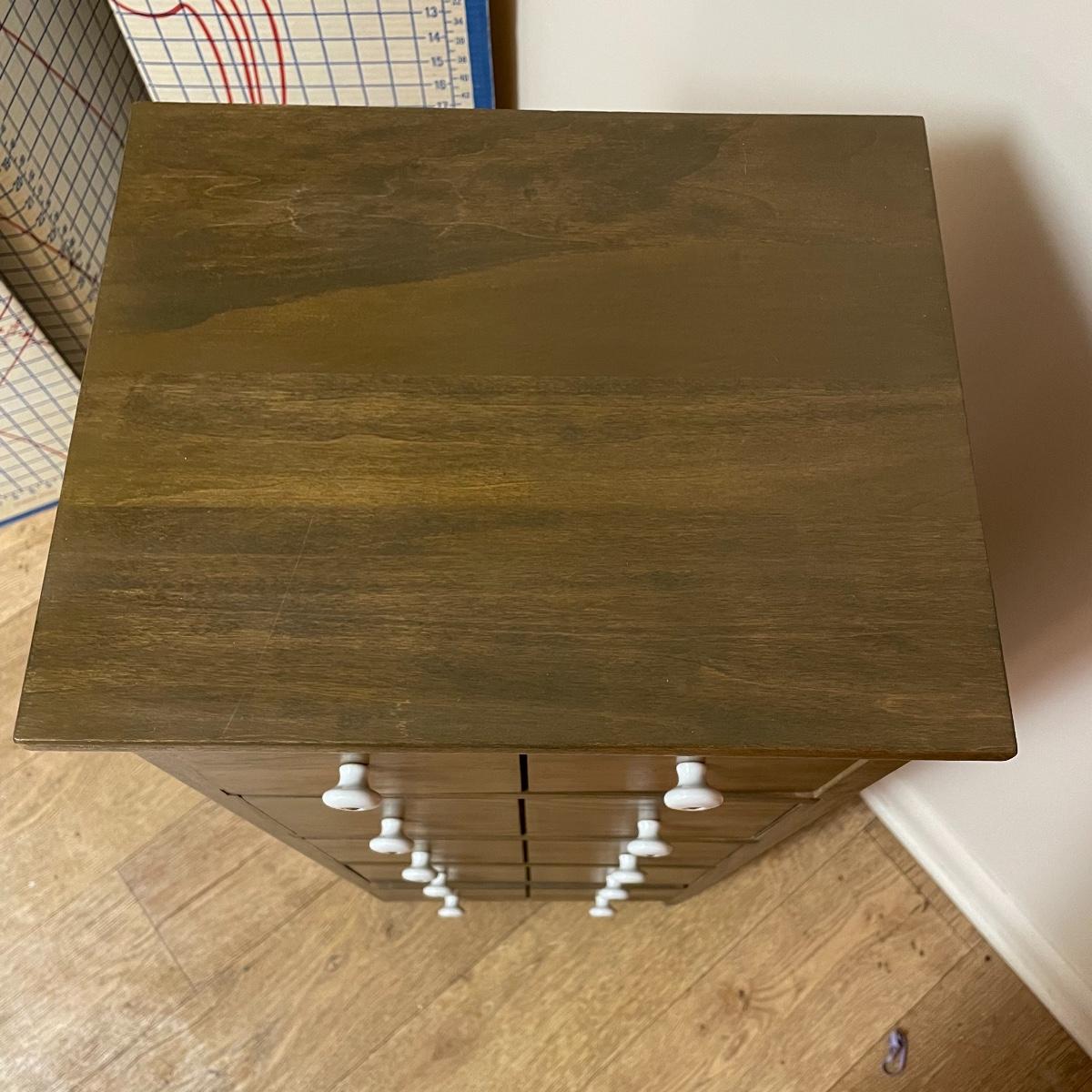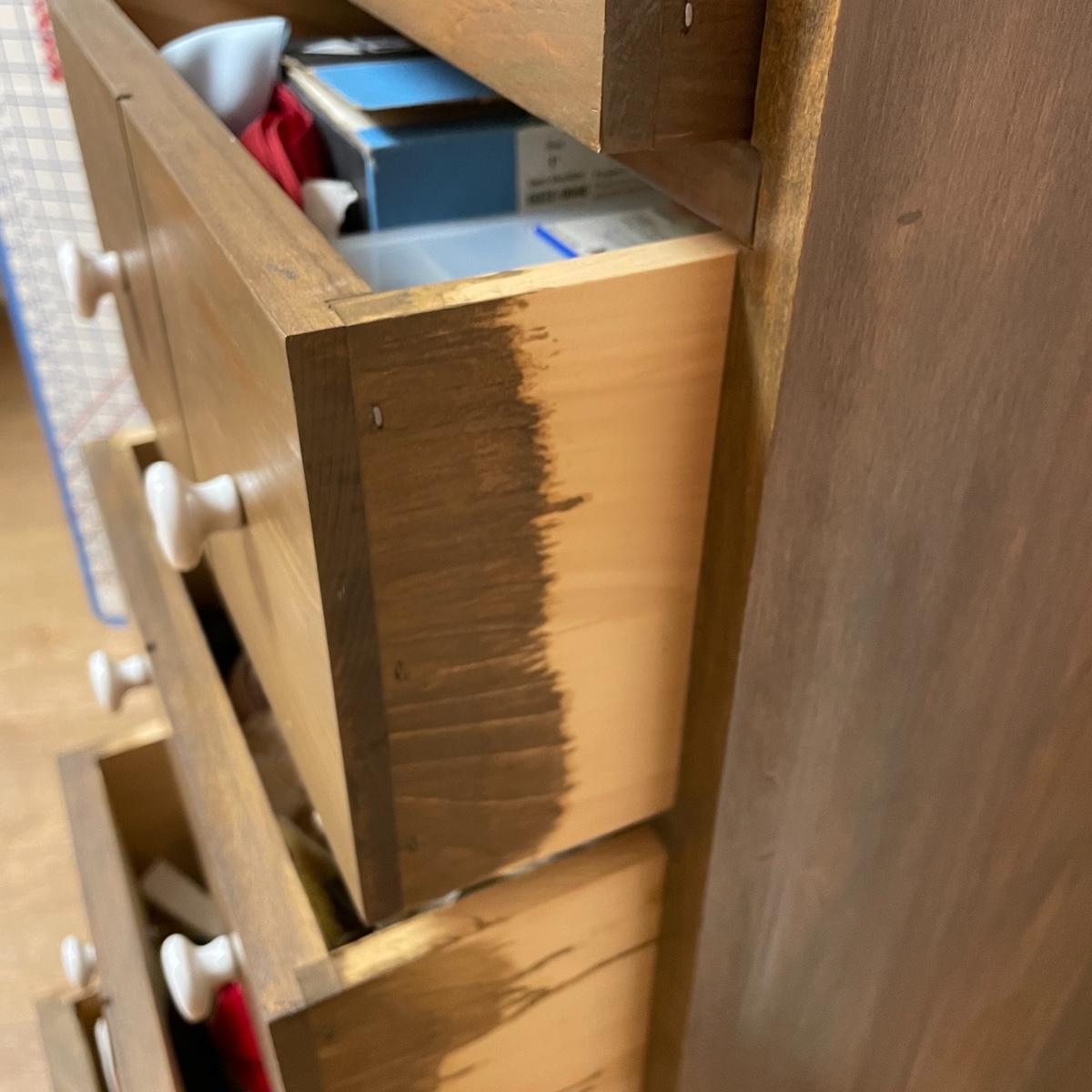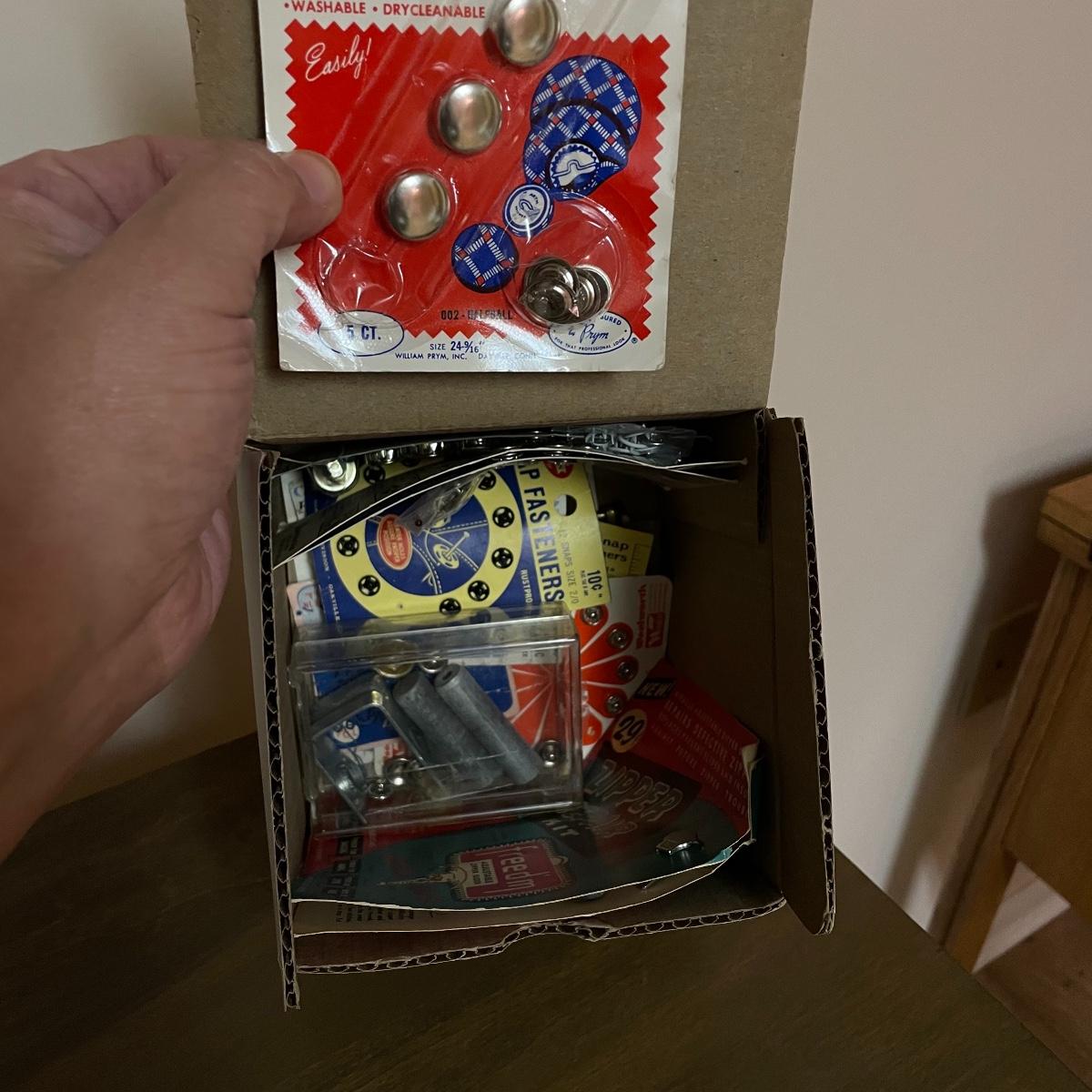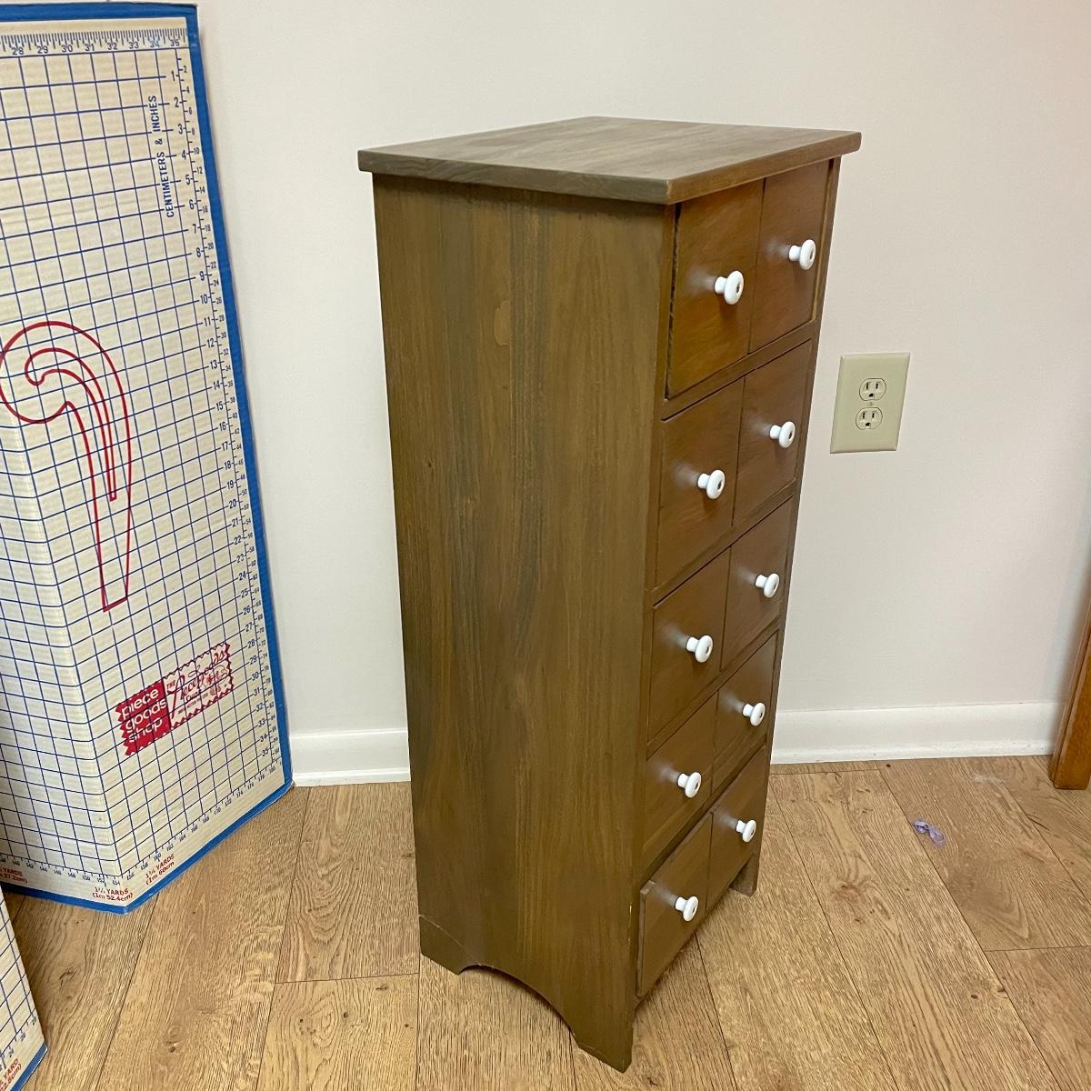 Sew many sewing supplies! Lot starts off with a five drawer chest, each containing sewing supplies in a mostly organized fashion. Supplies include patterns (we did not verify contents), thread, needles, pins, buttons, fasteners and more! The chest appears to be a sturdy, hand made mix of pressed and solid wood. It measures 14.25” x 11.5” x 36”. The top drawer has an organizer that pulls out to reveal the lower part of the drawer. Lastly lot features a sturdy cardboard cutting board with dimensions up to 36”sq. See images. Local pick up only.