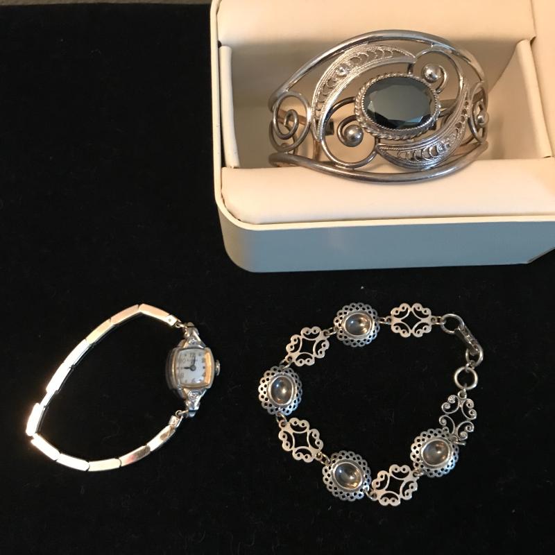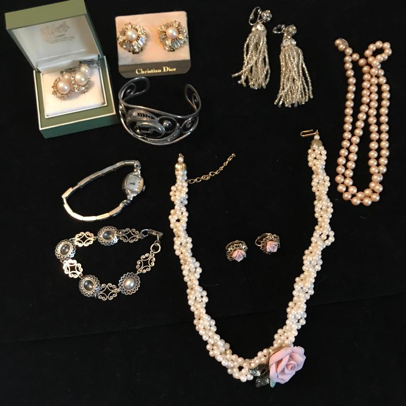 This lot contains some beauties including a wonderful sterling cuff bracelet by Danecraft, a dainty Bulova watch, and some crystal and pearl pieces. Look at photos for all pieces and see them up close at our preview! Shipping or local pick up.