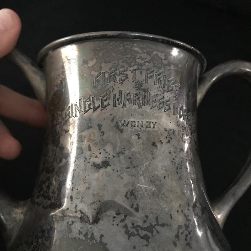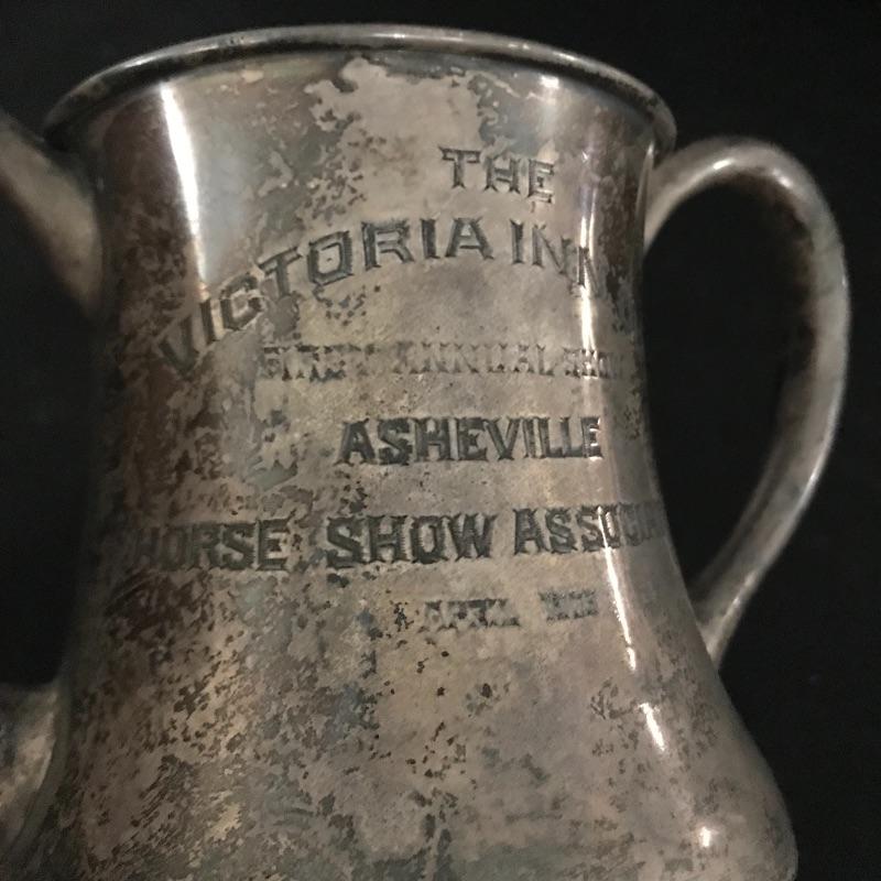 This sterling silver trophy/cup is from an Asheville horse show! Markings read “Victoria Inn Cup, First Annual Show, Horse Show Association, April 1903.” On backside, markings read “First Prize, Single Harnass Horse, Won By.”
