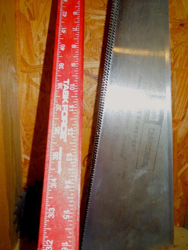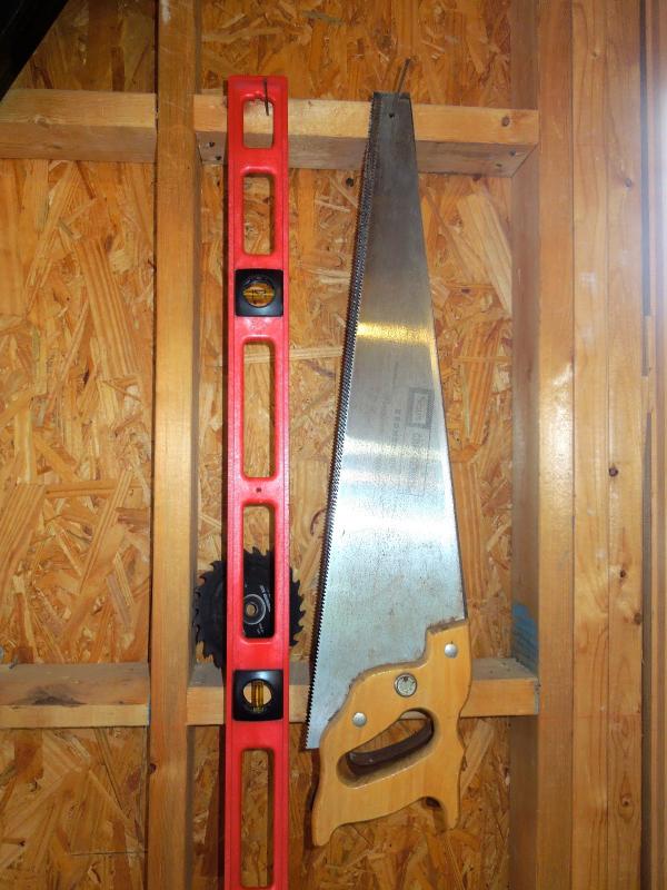 Level is 48" and plastic and made by Task Force. the three saws are all wooden handled and the same size. Does not include saw balde in one picture.