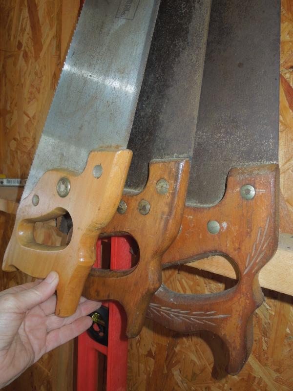 Lot 213: Three Wood Handled Handsaws and a 48" Level